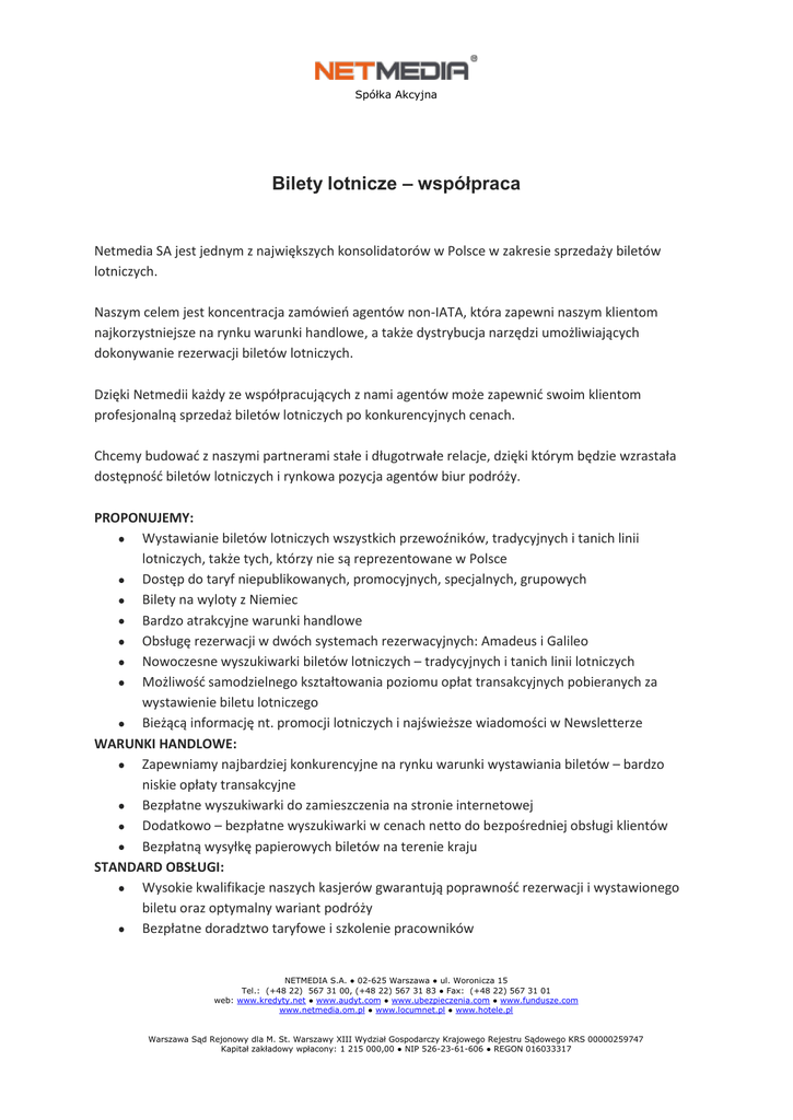 Spółka Akcyjna Bilety lotnicze – współpraca Netmedia SA jest jednym z największych konsolidatorów w Polsce w zakresie sprzedaży biletów lotniczych. Naszym celem jest koncentracja zamówieo agentów non-IATA, która zapewni naszym klientom najkorzystniejsze na rynku warunki handlowe, a także dystrybucja narzędzi umożliwiających dokonywanie rezerwacji biletów lotniczych. Dzięki Netmedii każdy ze współpracujących z nami agentów może zapewnid swoim klientom profesjonalną sprzedaż biletów lotniczych po konkurencyjnych cenach. Chcemy budowad z naszymi partnerami stałe i długotrwałe relacje, dzięki którym będzie wzrastała dostępnośd biletów lotniczych i rynkowa pozycja agentów biur podróży. PROPONUJEMY: Wystawianie biletów lotniczych wszystkich przewoźników, tradycyjnych i tanich linii lotniczych, także tych, którzy nie są reprezentowane w Polsce Dostęp do taryf niepublikowanych, promocyjnych, specjalnych, grupowych Bilety na wyloty z Niemiec Bardzo atrakcyjne warunki handlowe Obsługę rezerwacji w dwóch systemach rezerwacyjnych: Amadeus i Galileo Nowoczesne wyszukiwarki biletów lotniczych – tradycyjnych i tanich linii lotniczych Możliwośd samodzielnego kształtowania poziomu opłat transakcyjnych pobieranych za wystawienie biletu lotniczego Bieżącą informację nt. promocji lotniczych i najświeższe wiadomości w Newsletterze WARUNKI HANDLOWE: Zapewniamy najbardziej konkurencyjne na rynku warunki wystawiania biletów – bardzo niskie opłaty transakcyjne Bezpłatne wyszukiwarki do zamieszczenia na stronie internetowej Dodatkowo – bezpłatne wyszukiwarki w cenach netto do bezpośredniej obsługi klientów Bezpłatną wysyłkę papierowych biletów na terenie kraju STANDARD OBSŁUGI: Wysokie kwalifikacje naszych kasjerów gwarantują poprawnośd rezerwacji i wystawionego biletu oraz optymalny wariant podróży Bezpłatne doradztwo taryfowe i szkolenie pracowników NETMEDIA S.A. ● 02-625 Warszawa ● ul. Woronicza 15 Tel.: (+48 22) 567 31 00, (+48 22) 567 31 83 ● Fax: (+48 22) 567 31 01 web: www.kredyty.net ● www.audyt.com ● www.ubezpieczenia.com ● www.fundusze.com www.netmedia.om.pl ● www.locumnet.pl ● www.hotele.pl Warszawa Sąd Rejonowy dla M. St. Warszawy XIII Wydział Gospodarczy Krajowego Rejestru Sądowego KRS 00000259747 Kapitał zakładowy wpłacony: 1 215 000,00 ● NIP 526-23-61-606 ● REGON 016033317 Spółka Akcyjna Wszechstronna obsługa pasażerów korzystających z wyszukiwarek na stronie internetowej agenta Biuro czynne jest od poniedziałku do piątku w godzinach 9.00 - 18.00 i w soboty w godzinach 9.00 - 15.00. Kontakt z naszymi kasjerami lotniczymi w pilnych sprawach także poza godzinami pracy biura i w dni wolne od pracy JESTEŚMY (BEZ-) KONKURENCYJNI, PONIEWAŻ… jako konsolidator obsługujemy tysiące rezerwacji miesięcznie, co wydatnie zwiększa naszą siłę negocjacyjną i pozwala na uzyskanie specjalnych warunków współpracy z kontrahentami, stosujemy niskie opłaty, aby stale zwiększad skalę sprzedaży, minimalizujemy nasze koszty; poszukujemy oszczędności dla naszych klientów, wysoko cenimy współpracę z naszymi partnerami i wprowadzamy najwyższe standardy obsługi klienta, umożliwiamy kontakt z naszym biurem także poza standardowymi godzinami pracy. Jeśli agent korzysta z systemu rezerwacyjnego (Amadeus lub Galileo), zakłada rezerwację w systemie i przesyła nam do wystawienia. Po obciążeniu karty kredytowej (klienta lub agenta) lub otrzymaniu potwierdzenia przelewu przesłanego mailem lub faksem wystawiamy bilet i przesyłamy (dostarczamy) go do agenta / klienta. Jeśli agent jeszcze nie korzysta z systemu, zapewniamy narzędzie w postaci wyszukiwarki zawierającej ceny netto. Po zalogowaniu wyszukiwarka – dokładnie jak system rezerwacyjny – pokaże przeloty, dostępnośd miejsc i cenę. Jeśli zostanie dokonana rezerwacja, łatwo ją zidentyfikujemy i wystawimy bilet(-y). Agent płaci przelewem lub kartą kredytową, a od klienta pobiera dodatkowo opłatę transakcyjną, której wysokośd sam ustala. Aby sprzedawad bilety tradycyjnych i tanich linii lotniczych na własnym portalu, wystarczy zamówid nasze wyszukiwarki. Są bezpłatne – nie pobieramy żadnych opłat za ich wygenerowanie ani obsługę. Ponadto: agent ustala wysokośd opłat transakcyjnych automatycznie doliczanych do ceny biletu. Można zróżnicowad wysokośd opłat w zależności od destynacji: na połączenia krajowe, europejskie i międzykontynentalne. Wraz z wyszukiwarkami zapewniamy dostęp do panelu administracyjnego, w którym można śledzid ilośd i wartośd dokonanych rezerwacji i sprawdzid wysokośd należnej prowizji. Kontaktujemy się z każdym klientem, który założy rezerwację. Jeśli rezerwacja nie zostanie skutecznie założona, proponujemy inny wariant podróży. Dbamy o wyegzekwowanie płatności, przekazanie jej do linii lotniczej, poprawne wystawienie biletu, ewentualną zmianę lub zwrot, przesłanie biletu do klienta, a kopii rezerwacji do agenta. NETMEDIA S.A. ● 02-625 Warszawa ● ul. Woronicza 15 Tel.: (+48 22) 567 31 00, (+48 22) 567 31 83 ● Fax: (+48 22) 567 31 01 web: www.kredyty.net ● www.audyt.com ● www.ubezpieczenia.com ● www.fundusze.com www.netmedia.om.pl ● www.locumnet.pl ● www.hotele.pl Warszawa Sąd Rejonowy dla M. St. Warszawy XIII Wydział Gospodarczy Krajowego Rejestru Sądowego KRS 00000259747 Kapitał zakładowy wpłacony: 1 215 000,00 ● NIP 526-23-61-606 ● REGON 016033317 Spółka Akcyjna JAK PODJĄD WSPÓŁPRACĘ z NETMEDIA? Podstawą rozpoczęcia współpracy jest podpisanie właściwej umowy. Umowy są dostępne na stronie internetowej www.agent.netmedia.com.pl. W celu uzgodnienia warunków współpracy i uzyskania dodatkowych informacji prosimy o kontakt: Dział Handlowy, Bilety Lotnicze tel. 022 567 31 87, 022 567 31 98 e-mail: [email protected] NETMEDIA S.A. ● 02-625 Warszawa ● ul. Woronicza 15 Tel.: (+48 22) 567 31 00, (+48 22)