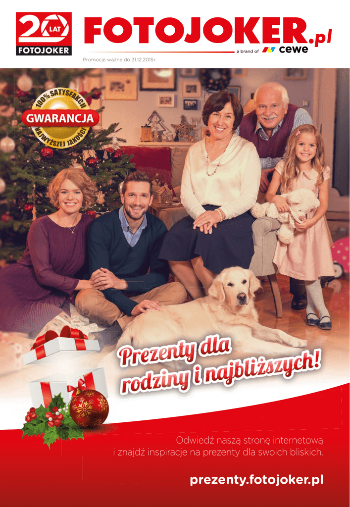 Promocje ważne do 31.12.2015r. Odwiedź naszą stronę internetową i znajdź inspiracje na prezenty dla swoich bliskich. prezenty.fotojoker.pl stwórz z reklam y Podaruj radość z CEWE FOTOKSIĄŻKĄ TV Najpiękniejsze historie opowiada się z CEWE. W CEWE FOTOKSIĄŻCE pokażesz i podarujesz zdjęcia w najbardziej wyrafinowanej postaci. CEWE FOTOKSIĄŻKI już od 19,99 zł CEWE FOTOKSIĄŻKA Kwadratowa Wybierz dostawę do domu lub bezpłatny odbiór w salonach FOTOJOKER Kwadratowy kształt jest nowoczesny i oferuje jednocześnie możliwość ciekawego pokazania zdjęć na podwójnych stronach. Idealna na prywatny regał, świetna także jako prezent. Najwyższa jakość Masz do wyboru papier matowy, błyszczący albo prawdziwy fotograficzny. To mówią nasi klienci: Kronika roczna jest idealna, aby pokazać cały rok od początku do końca. W łatwy sposób można zaprezentować nasze przeżycia od stycznia do grudnia. W kronice można opowiedzieć nie tylko o swoim urlopie, ale również o koncercie na którym byliśmy czy o imprezie urodzinowej, z której normalne nie powstałaby osobna fotoksiążka. Rodzina Wandrych z Białego Stoku 2 Oferta ważna do 31.12.2015r. CEWE FOTOKSIĄŻKA panoramiczna Twoje zdjęcia w pełnej szerokości - dzięki panoramicznej CEWE FOTOKSIĄŻCE nie stanowi to żadnego problemu. Niezależnie czy to szeroka panorama z krajobrazem lub seria zdjęć z rodzinnej wycieczki, tutaj znajdziesz dość miejsca na opowiedzenie swojej historii. Rodzaje papieru Wybierz z różnych dostępnych rodzajów papieru ten, który najlepiej pasuje do Twoich motywów! Standardowy druk cyfrowy CEWE FOTOKSIĄŻKA duże formaty Duże zdjęcia potrzebują po prostu więcej miejsca. Dlatego właśnie oferujemy go odpowiednio dużo. Łącznie dziewięć formatów w układzie pionowym (portret) i poziomym (panoramicznym) oraz kwadratowym. Dzięki temu najlepiej zaprezentujesz swoje ulubione zdjęcia! Druk cyfrowy, papier błyszczący Druk cyfrowy, papier matowy Premium Papier fotograficzny matowy Papier fotograficzny błyszczący CEWE FOTOKSIĄŻKA Pudełko prezentowe Eleganckie pudełko stanowi dopełnienie Twojego prezentu. Czarna płócienna oprawa podkreśla jego wyjątkowość i tworzy wraz CEWE FOTOKSIĄŻKĄ prawdziwą ozdobę na każdym regale. Zamów online lub przez nasz program do projektowania, dostępny na stronie: fotojoker.pl stwórz Kalendarze odpowiednie dla wszystkich W CEWE FOTOKALENDARZU w każdym miesiącu możesz zaakcentować swoją osobowość własnymi zdjęciami. Dla wszystkich mamy odpowiedni format. Duży format, duży efekt W kalendarzu A3 Twoje zdjęcia będą wyglądać szczególnie dobrze. Możesz wybrać układ pionowy lub poziomy tak, żeby lepiej pasował do wybranych zdjęć. Rodzaje papieru Do wyboru są trzy rodzaje papieru: matowy, błyszczący dla druku cyfrowego oraz papier fotograficzny. Wybierz dostawę do domu lub bezpłatny odbiór w salonach FOTOJOKER 4 Kwadratowy, praktyczny, dobry Kompaktowy kalendarz biurkowy nadaje się dobrze zarówno na biurko jak i na regał. Zaprojektuj ten kalendarz np. ze zdjęciami portretowymi swoich bliskich. Miesiąc początkowy we wszystkich CEWE FOTOKALENDARZACH zawsze możesz ustalać dowolnie. Oferta ważna do 31.12.2015r. CEWE FOTOKALENDARZE już od 19,99 zł Uczta fotograficzna w ogromnym rozmiarze Kalendarz ścienny XXL panoramiczny matowy jest wykonywany w technologii druku cyfrowego i matowienia. Dzięki matowieniu powstaje szczególny efekt, dzięki któremu Twoje zdjęcia krajobrazów wyglądają jeszcze wspanialej. Z W YC I Ę ZCA Szablony projektowe Wybierz szablon odpowiedni do Twoich zdjęć i kalendarium. Praktyczny i poręczny T E ST Ó W Wyjątkowy, kwadratowy kształt z łączeniem spiralnym i stabilną podstawą tekturową nadaje się szczególnie do ozdobienia biura lub mieszkania. Idealny prezent dla rodziny, przyjaciół i kolegów. „Laboratoria CEWE dostarczyły w testach najlepsze Fotokalendarze“ Fundacja Warentest 10/2012 „Zwycięzca testów przekonał nas na całej linii “ CHIP FOTO-VIDEO 01/2014 To mówią nasi klienci: „Od lat projektuję kalendarze ze zdjęciami z moich egzotycznych podróży. Pierwszy zamówiony CEWE kalendarz A2 wywołał na mnie duże wrażenie za sprawą czystości kolorów oraz wysokiej jakości papieru. Dlatego będę chętnie dalej polecał CEWE jako dostawcę indywidualnych fotokalendarzy.” Kalendarz ścienny A4 Panorama matowy Andrzej Litwin z Bydgoszczy Zamów online lub przez nasz program do projektowania, dostępny na stronie: fotojoker.pl stwórz Fotoobrazy – emocje w dużym formacie Wszystko to, co najlepsze dla Twoich zdjęć: pokaż swoje ukryte skarby i zamień cztery ściany mieszkania w osobistą galerię zdjęć. CEWE FOTOOBRAZY już od 7,99 zł Na płótnie Sławni ludzie pozwalają portretować się na obrazach. Dla Ciebie jest to znacznie łatwiejsze – wydrukuj swoje ulubione zdjęcie na płótnie! Wybierz dostawę do domu lub bezpłatny odbiór w salonach FOTOJOKER 6 Oferta ważna do 31.12.2015r. Rodzaje papieru Wybierz jeden z trzech papierów fotograficznych Premium: błyszczący, matowy lub perłowy. Świat plakatów Twoje najlepsze zimowe zdjęcie będzie jeszcze piękniejsze jako Fotoplakat Premium. Zafunduj sobie zimowy wystrój mieszkania tą wyjątkową dekoracją ścienną. Dobrze obramowany Potrzebujesz odpowiednią ramę do swojego plakatu? W CEWE znajdziesz różne rodzaje ram, które podkreślą ekspresję Twoich zdjęć. Klasyczny Rustykalny Nowoczesny Różnorodne style Klasyczne, rustykalne czy nowoczesne? Masz do wyboru trzy różne style. Co mówią nasi klienci: „Przez wiele lat mojej przygody z fotografią zawsze wykorzystywałem najładniejsze motywy do dekoracji ścian w moim mieszkaniu. Zdjęcia krajobrazowe wywołują u obserwatora szczególnie silny efekt. Dlaczego te piękne ujęcia mają się kurzyć zapomniane w domowym archiwum?“ Andrzej Sandryk z Warszawy Zamów online lub przez nasz pr