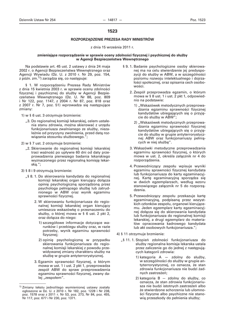 Dziennik Ustaw Nr 254 — 14817 — Poz. 1523 1523 ROZPORZĄDZENIE PREZESA RADY MINISTRÓW z dnia 15 września 2011 r. zmieniające rozporządzenie w sprawie oceny zdolności fizycznej i psychicznej do służby w Agencji Bezpieczeństwa Wewnętrznego Na podstawie art. 45 ust. 2 ustawy z dnia 24 maja 2002 r. o Agencji Bezpieczeństwa Wewnętrznego oraz Agencji Wywiadu (Dz. U. z 2010 r. Nr 29, poz. 154, z późn. zm.1)) zarządza się, co następuje: § 1. W rozporządzeniu Prezesa Rady Ministrów z dnia 15 kwietnia 2003 r. w sprawie oceny zdolności fizycznej i psychicznej do służby w Agencji Bezpieczeństwa Wewnętrznego (Dz. U. Nr 88, poz. 809 i Nr 122, poz. 1147, z 2004 r. Nr 87, poz. 818 oraz z 2007 r. Nr 7, poz. 51) wprowadza się następujące zmiany: 1) w § 6 ust. 3 otrzymuje brzmienie: „3. Do regionalnej komisji lekarskiej, celem ustalenia stanu zdrowia, można skierować z urzędu funkcjonariusza zwalnianego ze służby, niezależnie od przyczyny zwolnienia, przed datą rozwiązania stosunku służbowego.”; 2) w § 7 ust. 2 otrzymuje brzmienie: „2. Skierowanie do regionalnej komisji lekarskiej traci ważność po upływie 60 dni od daty przeprowadzenia pierwszego badania lekarskiego wyznaczonego przez regionalną komisję lekarską.”; 3) § 8 i 9 otrzymują brzmienie: „§ 8. 1. Do skierowania kandydata do regionalnej komisji lekarskiej organ kierujący dołącza opinię psychologiczną sporządzoną przez psychologa pełniącego służbę lub zatrudnionego w ABW oraz wynik egzaminu sprawności fizycznej. 2. W skierowaniu funkcjonariusza do regionalnej komisji lekarskiej organ kierujący umieszcza wskazówkę o przeznaczeniu do służby, o której mowa w § 6 ust. 2 pkt 2, oraz dołącza do niego: 1) szczegółowe informacje dotyczące warunków i przebiegu służby oraz, w razie potrzeby, wynik egzaminu sprawności fizycznej; 2) opinię psychologiczną w przypadku skierowania funkcjonariusza do regionalnej komisji lekarskiej z powodu przewidywanej zmiany charakteru służby na służbę w grupie antyterrorystycznej. 3. Egzamin sprawności fizycznej, o którym mowa w ust. 1 i ust. 2 pkt 1, przeprowadza zespół ABW do spraw przeprowadzenia egzaminu sprawności fizycznej, zwany dalej „zespołem”. 1) Zmiany tekstu jednolitego wymienionej ustawy zostały ogłoszone w Dz. U. z 2010 r. Nr 182, poz. 1228 i Nr 238, poz. 1578 oraz z 2011 r. Nr 53, poz. 273, Nr 84, poz. 455, Nr 117, poz. 677 i Nr 230, poz. 1371. § 9. 1. Badanie psychologiczne osoby skierowanej ma na celu stwierdzenie jej predyspozycji do służby w ABW, a w szczególności poziomu rozwoju intelektualnego i dojrzałości społecznej, oraz opisania cech osobowości. 2. Zespół przeprowadza egzamin, o którym mowa w § 8 ust. 1 i ust. 2 pkt 1, odpowiednio na podstawie: 1) „Wskazówek metodycznych przeprowadzania egzaminu sprawności fizycznej kandydatów ubiegających się o przyjęcie do służby w ABW”; 2) „Wskazówek metodycznych przeprowadzania egzaminu sprawności fizycznej kandydatów ubiegających się o przyjęcie do służby w grupie antyterrorystycznej ABW oraz funkcjonariuszy pełniących w niej służbę”. 3. Wskazówki metodyczne przeprowadzania egzaminu sprawności fizycznej, o których mowa w ust. 2, określa załącznik nr 4 do rozporządzenia. 4. Przewodniczący zespołu wpisuje wyniki egzaminu sprawności fizycznej kandydata lub funkcjonariusza do karty egzaminacyjnej. Kartę egzaminacyjną sporządza się w dwóch egzemplarzach, według wzoru stanowiącego załącznik nr 5 do rozporządzenia. 5. Przewodniczący zespołu przekazuje kartę egzaminacyjną, podpisaną przez wszystkich członków zespołu, organowi kierującemu. Jeden egzemplarz karty egzaminacyjnej dołącza się do skierowania kandydata lub funkcjonariusza do regionalnej komisji lekarskiej, a drugi egzemplarz do materiałów opracowania kadrowego kandydata lub akt osobowych funkcjonariusza.”; 4) § 11 otrzymuje brzmienie: „§ 11. 1. Stopień zdolności funkcjonariusza do służby regionalna komisja lekarska ustala przez zaliczenie go do jednej z następujących kategorii zdrowia: 1) kategoria A — zdolny do służby, w szczególności do służby w grupie antyterrorystycznej, co oznacza, że stan zdrowia funkcjonariusza nie budzi żadnych zastrzeżeń; 2) kategoria B — zdolny do służby, co oznacza, że stan zdrowia funkcjonariusza nie budzi istotnych zastrzeżeń albo że stwierdzone schorzenia lub ułomności fizyczne albo psychiczne nie stanowią przeszkody do pełnienia służby; Dziennik Ustaw Nr 254 — 14818 — 3) kategoria D — niezdolny do służby, co oznacza, że stwierdzone u funkcjonariusza schorzenia lub ułomności fizyczne albo psychiczne nie pozwalają mu na pełnienie służby trwale albo przez określony czas. 2. W stosunku do funkcjonariusza, o którym mowa w § 6 ust. 2 pkt 3, który został zaliczony do kategorii B, orzeczenie może zawierać informację, że w stanie zdrowia funkcjonariusza stwierdza się pewne schorzenia, które zmniejszają jego zdolność fizyczną lub psychiczną i nie pozwalają na pełnienie służby na zajmowanym stanowisku, jednak schorzenia te nie stanowią przeszkody do pełnienia służby na innym stanowisku; w takim przypadku komisja lekarska określa, jakie warunki służby są przeciwwskazane dla funkcjonariusza.”; Poz. 1523 5) załącznik nr 1 do rozporządzenia otrzymuje brzmienie określone w załączniku nr 1 do niniejszego rozporządzenia; 6) załącznik nr 3 do rozporządzenia otrzymuje brzmienie określone w załączniku nr 2 do niniejszego rozporządzenia; 7) załącznik nr 4 do rozporządzenia otrzymuje brzmienie określone w załączniku nr 3 do niniejszego rozporządzenia; 8) załącznik nr 5 do rozporządzenia otrzymuje brzmienie określone w załączniku nr 4 do niniejszego rozporządzenia; 9) załącznik nr 6 do rozporządzenia otrzymuje brzmienie określone w załączniku nr 5 do niniejszego rozporządzenia. § 2. Rozporządzenie wchodzi