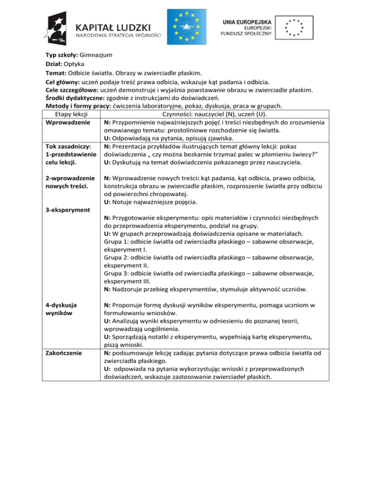 [Wpisz tekst] Typ szkoły: Gimnazjum Dział: Optyka Temat: Odbicie światła. Obrazy w zwierciadle płaskim. Cel główny: uczeń podaje treść prawa odbicia, wskazuje kąt padania i odbicia. Cele szczegółowe: uczeń demonstruje i wyjaśnia powstawanie obrazu w zwierciadle płaskim. Środki dydaktyczne: zgodnie z instrukcjami do doświadczeń. Metody i formy pracy: ćwiczenia laboratoryjne, pokaz, dyskusja, praca w grupach. Etapy lekcji Czynności: nauczyciel (N), uczeń (U). Wprowadzenie N: Przypomnienie najważniejszych pojęć i treści niezbędnych do zrozumienia omawianego tematu: prostoliniowe rozchodzenie się światła. U: Odpowiadają na pytania, opisują zjawiska. Tok zasadniczy: N: Prezentacja przykładów ilustrujących temat główny lekcji: pokaz 1-przedstawienie doświadczenia „ czy można bezkarnie trzymać palec w płomieniu świecy?” celu lekcji. U: Dyskutują na temat doświadczenia pokazanego przez nauczyciela. 2-wprowadzenie nowych treści. N: Wprowadzenie nowych treści: kąt padania, kąt odbicia, prawo odbicia, konstrukcja obrazu w zwierciadle płaskim, rozproszenie światła przy odbiciu od powierzchni chropowatej. U: Notuje najważniejsze pojęcia. 3-eksperyment N: Przygotowanie eksperymentu: opis materiałów i czynności niezbędnych do przeprowadzenia eksperymentu, podział na grupy. U: W grupach przeprowadzają doświadczenia opisane w materiałach. Grupa 1: odbicie światła od zwierciadła płaskiego – zabawne obserwacje, eksperyment I. Grupa 2: odbicie światła od zwierciadła płaskiego – zabawne obserwacje, eksperyment II. Grupa 3: odbicie światła od zwierciadła płaskiego – zabawne obserwacje, eksperyment III. N: Nadzoruje przebieg eksperymentów, stymuluje aktywność uczniów. 4-dyskusja wyników Zakończenie N: Proponuje formę dyskusji wyników eksperymentu, pomaga uczniom w formułowaniu wniosków. U: Analizują wyniki eksperymentu w odniesieniu do poznanej teorii, wprowadzają uogólnienia. U: Sporządzają notatki z eksperymentu, wypełniają kartę eksperymentu, piszą wnioski. N: podsumowuje lekcję zadając pytania dotyczące prawa odbicia światła od zwierciadła płaskiego. U: odpowiada na pytania wykorzystując wnioski z przeprowadzonych doświadczeń, wskazuje zastosowanie zwierciadeł płaskich. [Wpisz tekst] Karta eksperymentu 1 Temat eksperymentu Instrukcja wykonania Obserwacje (opisujemy w punktach przebieg eksperymentu: przyczyna skutek) Wnioski (odniesienie do teorii) Czy można bezkarnie trzymać palec w płomieniu świecy? Sporządzić zestaw doświadczalny zgodnie z instrukcją (materiały str…). Postaraj się o szybę o rozmiarach nie mniejszych niż 30 cm × 30 cm i dwie jednakowe świeczki. Ustawiona pionowo szyba posłuży jako niezbyt dobrej jakości zwierciadło płaskie. Zapaloną świeczkę ustaw w odległości ok. 10–20 cm przed szybą, a drugą za nią w miejscu, gdzie powstaje obraz pierwszej, tej zapalonej. Sprawdź, czy stojąc przed szybą odnosisz wrażenie, że obraz płomienia jest dokładnie tam, gdzie powinien, tzn. sprawia wrażenie, że świeca za szybą też jest zapalona.. Możesz teraz bezkarnie przykładać palec albo kawałek papieru do „fałszywego” płomienia świecy. [Wpisz tekst] Karta eksperymentu 2 Temat eksperymentu Instrukcja wykonania Obserwacje (opisujemy w punktach przebieg eksperymentu: przyczyna skutek) Wnioski (odniesienie do teorii) Odbicie światła od zwierciadła płaskiego – zabawne obserwacje, eksperyment I. Sporządzić zestaw doświadczalny zgodnie z instrukcją (materiały str…). Weź kartkę papieru o wielkości, która umożliwia zasłonięcie lusterka. Następnie wytnij na jej środku kwadratowy otwór o bokach około 2 cm. Przyłóż teraz papier na lusterko i ustaw lusterko tak, abyś zobaczył oba swoje oczy. Następnie zamknij jedno oko. Które oko widzisz? Wyjaśnij wynik obserwacji korzystając z prawa odbicia. [Wpisz tekst] Karta eksperymentu 3 Temat eksperymentu Instrukcja wykonania Obserwacje (opisujemy w punktach przebieg eksperymentu: przyczyna skutek) Wnioski (odniesienie do teorii) Odbicie światła od zwierciadła płaskiego – zabawne obserwacje, eksperyment II. Sporządzić zestaw doświadczalny zgodnie z instrukcją (materiały str…). Weź dwa małe lusterka i ustaw je prostopadle do siebie (lusterka nie powinny posiadać ramek!). Popatrz teraz na swoją twarz wykorzystując równocześnie oba lusterka (rysunek poniżej pokazuje widok „z góry” położenia lusterek względem głowy – patrz materiały). W takim położeniu widzisz swą „prawdziwą” twarz, tak jak ją widzą inni i Ty widzisz na swych zdjęciach, a nie w lustrze przy porannej toalecie. Wyjaśnij dlaczego ? [Wpisz tekst] Karta eksperymentu 4 Temat eksperymentu Instrukcja wykonania Obserwacje (opisujemy w punktach przebieg eksperymentu: przyczyna skutek) Wnioski (odniesienie do teorii) Odbicie światła od zwierciadła płaskiego – zabawne obserwacje, eksperyment III. Sporządzić zestaw doświadczalny zgodnie z instrukcją (materiały str…). Wykorzystaj dwa lusterka (bez ramek) ustawione pod kątem prostym. Ustaw je na stole, a pomiędzy lusterkami na stole połóż monetę. Spojrzyj teraz w lusterka. Ile monet widzisz? Jak są ustawione? Zmieniaj teraz kąt pomiędzy lusterkami. Czy liczba widzianych monet pozostaje taka sama? Wytłumacz wynik obserwacji korzystając z prawa odbicia światła od zwierciadła.