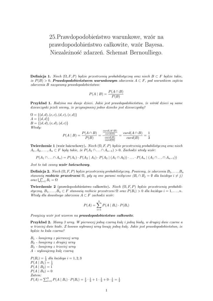 Twierdzenie 2 (prawdopodobieństwo całkowite). Niech (Ω, F, P ) będzie przestrzenią probabilistyczną, B1 , . . . , Bn ⊂ F stanowią rozbicie przestrzeni Ω oraz P (Bi ) > 0 dla każdego i = 1, . . . , n.