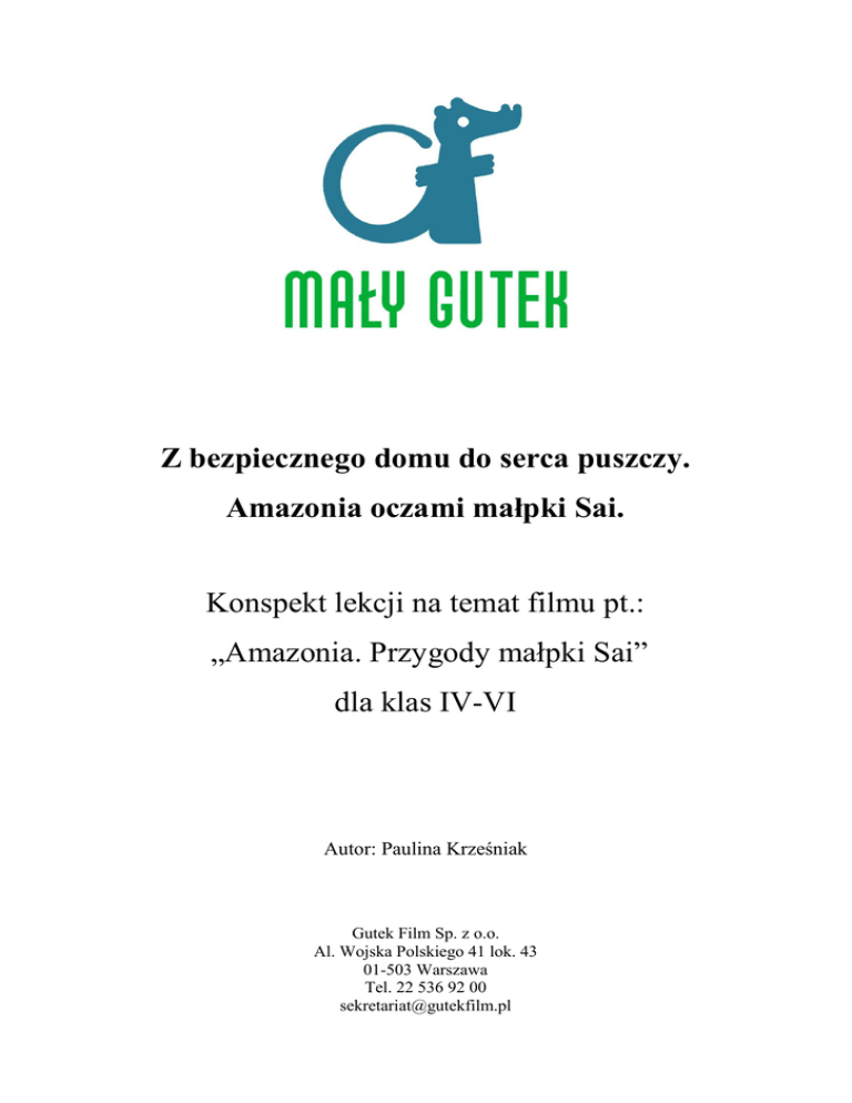 Z bezpiecznego domu do serca puszczy. Amazonia oczami małpki Sai. Konspekt lekcji na temat filmu pt.: „Amazonia. Przygody małpki Sai” dla klas IV-VI Autor: Paulina Krześniak Gutek Film Sp. z o.o. Al. Wojska Polskiego 41 lok. 43 01-503 Warszawa Tel. 22 536 92 00 [email protected] Temat: Z bezpiecznego domu do serca puszczy. Amazonia oczami małpki Sai. Cele lekcji: rozwijanie wrażliwości uczniów poprzez kontakt ze sztuką filmową, zapoznanie uczniów z różnicami pomiędzy filmem dokumentalnym a fabularnym, zachęcanie uczniów do rozmowy na tematy takie jak adaptacja do nowych warunków, czy różnice między cywilizacją a życiem na łonie natury, kształcenie umiejętności rekonstruowania poznanej fabuły, rozwijanie umiejętności samodzielnego myślenia, doskonalenie umiejętności formułowania myśli z uwzględnieniem zasad kultury słowa, ćwiczenie umiejętności korzystania ze źródeł i wyszukiwania informacji, przybliżenie uczniom regionu Amazonii: wiedzy na temat jego położenia oraz fauny i flory. Treści podstawy programowej Język polski: 2. Samokształcenie i docieranie do informacji. Uczeń korzysta z informacji zawartych w encyklopedii, słowniku ortograficznym, słowniku języka polskiego (małym lub podręcznym), słowniku wyrazów bliskoznacznych.(…) Tworzenie wypowiedzi: 2) dostosowuje sposób wyrażania się do oficjalnej i nieoficjalnej sytuacji komunikacyjnej oraz do zamierzonego celu 5) tworzy wypowiedzi pisemne w następujących formach gatunkowych: opowiadanie z dialogiem (twórcze i odtwórcze), pamiętnik i dziennik (pisane z perspektywy bohatera literackiego lub własnej), list oficjalny, proste sprawozdanie (np. z wycieczki, z wydarzeń sportowych), opis postaci, przedmiotu, krajobrazu, ogłoszenie, zaproszenie, prosta notatka;(…) 8) uczestnicząc w rozmowie, słucha z uwagą wypowiedzi innych, mówi na temat; prezentuje własne zdanie i uzasadnia je;(…) Świadomość językowa: 7) operuje słownictwem z określonych kręgów tematycznych (na tym etapie skoncentrowanym przede wszystkim wokół tematów: dom, rodzina, szkoła i nauka, środowisko przyrodnicze i społeczne) Plastyka: 3. Analiza i interpretacja tekstów kultury – recepcja sztuki. Uczeń: 1) rozróżnia określone dyscypliny w takich dziedzinach jak: architektura, sztuki plastyczne oraz w innych dziedzinach sztuki (fotografika, film) i przekazach medialnych (telewizja, Internet) Zajęcia komputerowe: 3. Wyszukiwanie i wykorzystywanie informacji z różnych źródeł. Uczeń: 1) wyszukuje informacje w różnych źródłach elektronicznych (słowniki, encyklopedie, zbiory biblioteczne, dokumentacje techniczne i zasoby Internetu); 2) selekcjonuje, porządkuje i gromadzi znalezione informacje; 3) wykorzystuje, stosownie do potrzeb, informacje w różnych formatach; 4) opisuje cechy różnych postaci informacji: tekstowej, graficznej, dźwiękowej, audiowizualnej, multimedialnej. Przyroda: 5.Człowiek a środowisko. 3) proponuje działania sprzyjające środowisku przyrodniczemu (…) 13. Krajobrazy świata. 1) charakteryzuje warunki klimatyczne i przystosowania do nich wybranych organizmów w następujących krajobrazach strefowych: lasu równikowego wilgotnego, sawanny, pustyni gorącej, stepu, tajgi, tundry, pustyni lodowej; 2) opisuje krajobrazy świata, w szczególności: lasu równikowego wilgotnego, sawanny, pustyni gorącej, stepu, tajgi, tundry, pustyni lodowej, rozpoznaje je na ilustracji oraz lokalizuje na mapie; 3) rozpoznaje i nazywa organizmy roślinne i zwierzęce typowe dla poznanych krajobrazów; 4) podaje przykłady współzależności między składnikami krajobrazu, zwłaszcza między klimatem (temperatura powietrza, opady atmosferyczne) a rozmieszczeniem roślin i zwierząt. Metody pracy: pogadanka, element wykładu, praca w grupach, karta pracy: ćwiczenie pisemne, praca z mapką konturową, praca ze źródłami informacji. Materiały i pomoce: Amazonia. Przygody małpki Sai. reż. T. Ragobert, Francja, Brazylia 2013, arkusze papieru i mazaki, karty pracy dla wszystkich uczniów, publikacje i materiały popularnonaukowe dotyczące Amazonii lub dostęp do internetu. Przebieg lekcji: 1. Pogadanka. Nauczyciel pyta dzieci, czy film pt. Amazonia. Przygody małpki Sai podobał im się oraz na czym – ich zdaniem – polega jego wyjątkowość. 2. Element wykładu. Nauczyciel przybliża lub przypomina uczniom różnice między filmami dokumentalnymi i fabularnymi: Filmy dokumentalne wyróżnia – jak sama nazwa wskazuje – dokumentowanie czegoś, przedstawianie faktów. Często tworzone są one w celach informacyjnych, po to, by przybliżyć widzom jakieś miejsca, postaci czy wydarzenia. (Warto tu podać przykłady filmów dokumentalnych, które uczniowie wcześniej widzieli, ewentualnie nawiązać do gatunku, jakim jest film przyrodniczy.) Filmy fabularne przedstawiają fikcyjne wydarzenia, które składają się na wielowątkową zazwyczaj opowieść (fabułę). W filmach fabularnych występują aktorzy, którzy wcielają się w role bohaterów. 3. Praca w grupach. Nauczyciel dzieli klasę na dwie grupy. Każda grupa dostaje arkusz papieru i mazak. Zadaniem pierwszej grupy jest wskazanie w filmie Amazonia. Przygody małpki Sai cech filmu dokumentalnego, zadaniem drugiej zaś – cech filmu fabularnego. Po upływie czasu przeznaczonego na wykonanie zadania (ok. 10 min.) przedstawiciele grup prezentują efekty swojej pracy. Prowadzący w razie potrzeby uzupełnia odpowiedzi uczniów. Warto zwrócić uwagę na następujące cechy dokumentu: ujęcia przedstawiające amazońską przyrodę: rośliny i zwierzęta przypominają te, które znamy z filmów przyrodniczych, z filmu dowiadujemy się wiele na temat życia zwierząt w amazońskiej puszczy, dzięki czemu spełnia on funkcję informacyjną oraz następujące cechy filmu fabularnego: film opowiada o powiązanych ze sobą wydarzeniach, które składają się na fabułę. mimo dokumentalnego charakteru uj