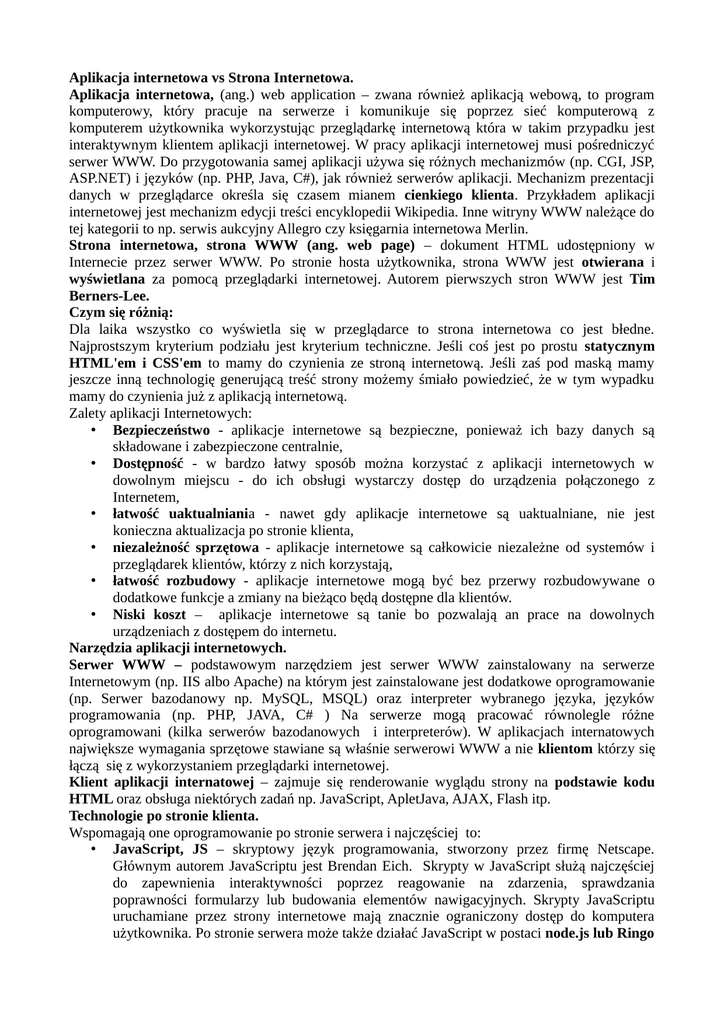 Aplikacja internetowa vs Strona Internetowa. Aplikacja internetowa, (ang.) web application – zwana również aplikacją webową, to program komputerowy, który pracuje na serwerze i komunikuje się poprzez sieć komputerową z komputerem użytkownika wykorzystując przeglądarkę internetową która w takim przypadku jest interaktywnym klientem aplikacji internetowej. W pracy aplikacji internetowej musi pośredniczyć serwer WWW. Do przygotowania samej aplikacji używa się różnych mechanizmów (np. CGI, JSP, ASP.NET) i języków (np. PHP, Java, C#), jak również serwerów aplikacji. Mechanizm prezentacji danych w przeglądarce określa się czasem mianem cienkiego klienta. Przykładem aplikacji internetowej jest mechanizm edycji treści encyklopedii Wikipedia. Inne witryny WWW należące do tej kategorii to np. serwis aukcyjny Allegro czy księgarnia internetowa Merlin. Strona internetowa, strona WWW (ang. web page) – dokument HTML udostępniony w Internecie przez serwer WWW. Po stronie hosta użytkownika, strona WWW jest otwierana i wyświetlana za pomocą przeglądarki internetowej. Autorem pierwszych stron WWW jest Tim Berners-Lee. Czym się różnią: Dla laika wszystko co wyświetla się w przeglądarce to strona internetowa co jest błedne. Najprostszym kryterium podziału jest kryterium techniczne. Jeśli coś jest po prostu statycznym HTML'em i CSS'em to mamy do czynienia ze stroną internetową. Jeśli zaś pod maską mamy jeszcze inną technologię generującą treść strony możemy śmiało powiedzieć, że w tym wypadku mamy do czynienia już z aplikacją internetową. Zalety aplikacji Internetowych: • Bezpieczeństwo - aplikacje internetowe są bezpieczne, ponieważ ich bazy danych są składowane i zabezpieczone centralnie, • Dostępność - w bardzo łatwy sposób można korzystać z aplikacji internetowych w dowolnym miejscu - do ich obsługi wystarczy dostęp do urządzenia połączonego z Internetem, • łatwość uaktualniania - nawet gdy aplikacje internetowe są uaktualniane, nie jest konieczna aktualizacja po stronie klienta, • niezależność sprzętowa - aplikacje internetowe są całkowicie niezależne od systemów i przeglądarek klientów, którzy z nich korzystają, • łatwość rozbudowy - aplikacje internetowe mogą być bez przerwy rozbudowywane o dodatkowe funkcje a zmiany na bieżąco będą dostępne dla klientów. • Niski koszt – aplikacje internetowe są tanie bo pozwalają an prace na dowolnych urządzeniach z dostępem do internetu. Narzędzia aplikacji internetowych. Serwer WWW – podstawowym narzędziem jest serwer WWW zainstalowany na serwerze Internetowym (np. IIS albo Apache) na którym jest zainstalowane jest dodatkowe oprogramowanie (np. Serwer bazodanowy np. MySQL, MSQL) oraz interpreter wybranego języka, języków programowania (np. PHP, JAVA, C# ) Na serwerze mogą pracować równolegle różne oprogramowani (kilka serwerów bazodanowych i interpreterów). W aplikacjach internatowych największe wymagania sprzętowe stawiane są właśnie serwerowi WWW a nie klientom którzy się łączą się z wykorzystaniem przeglądarki internetowej. Klient aplikacji internatowej – zajmuje się renderowanie wyglądu strony na podstawie kodu HTML oraz obsługa niektórych zadań np. JavaScript, ApletJava, AJAX, Flash itp. Technologie po stronie klienta. Wspomagają one oprogramowanie po stronie serwera i najczęściej to: • JavaScript, JS – skryptowy język programowania, stworzony przez firmę Netscape. Głównym autorem JavaScriptu jest Brendan Eich. Skrypty w JavaScript służą najczęściej do zapewnienia interaktywności poprzez reagowanie na zdarzenia, sprawdzania poprawności formularzy lub budowania elementów nawigacyjnych. Skrypty JavaScriptu uruchamiane przez strony internetowe mają znacznie ograniczony dostęp do komputera użytkownika. Po stronie serwera może także działać JavaScript w postaci node.js lub Ringo Aplet Javy – aplet dostarczany w postaci kodu bajtowego Javy. Może zostać uruchomiony w przeglądarce internetowej wykorzystując wirtualną maszynę Javy albo w samodzielnej aplikacji AppletViewer służącej do testowania apletów Javy. Mogą być pisane zarówno w Javie jak i innych językach kompilowanych do kodu bajtowego - na przykład Jython. • Adobe Flash (dawniej Macromedia Flash) – technologia tworzenia animacji z wykorzystaniem grafiki wektorowej na zasadzie klatek kluczowych. Powstałe pliki .swf, zwane często „plikami Flash”, można odtwarzać na stronie www za pomocą przeglądarki internetowej z zainstalowaną odpowiednią wtyczką (np. Adobe Flash Player) lub w oddzielnym programie do tego przeznaczonym. Od wersji Flash 5 program wyposażony został w język programowania do obsługi zdarzeń (np. kliknięcie elementu myszą) – ActionScript. Dzięki temu we Flashu można tworzyć interaktywne animacje i programy, np. popularne w sieci WWW gry Flash. Oprócz tego pliki Flash są wykorzystywane do internetowych reklam, prezentacji oraz filmów (Youtube itp). Istnieją również strony internetowe całkowicie oparte na plikach Flash. • AJAX (ang. Asynchronous JavaScript and XML, asynchroniczny JavaScript i XML) – technika tworzenia aplikacji internetowych wspomagajaca JavaScript, w której interakcja użytkownika z serwerem odbywa się bez przeładowywania całego dokumentu, w sposób asynchroniczny. Ma to umożliwiać bardziej dynamiczną interakcję z użytkownikiem niż w tradycyjnym modelu, w którym każde żądanie nowych danych wiąże się z przesłaniem całej strony HTML. Na technikę tę składa się parę elementów: ◦ XMLHttpRequest - klasa umożliwiająca asynchroniczne przesyłanie danych; ◦ JavaScript - mimo użycia w nazwie, może to być de facto dowolny język skryptowy funkcjonujący po stronie użytkownika (np. JScript czy VBScript). ◦ XML - język znaczników, poprzez który miałyby być opisane odbierane informacje. Technologie po stronie