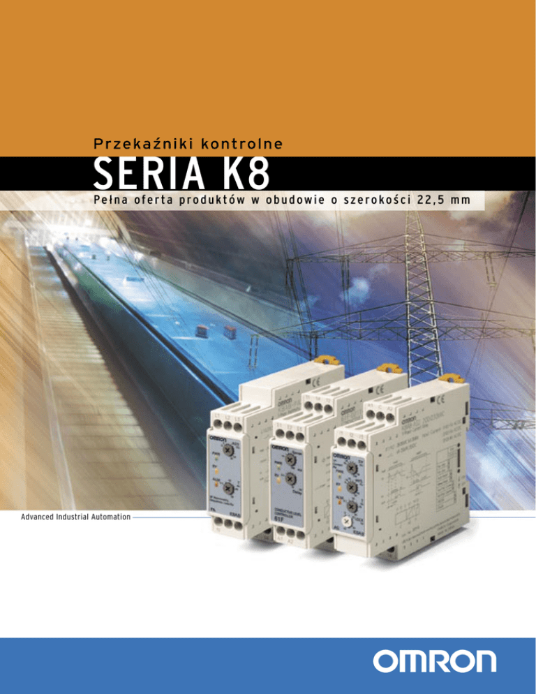 Przekaźniki kontrolne SERIA K8 P e ł n a o f e r t a p ro d u k t ó w w o b u d o w i e o s z e ro ko ś c i 2 2 , 5 m m Advanced Industrial Automation Seria przekaźników kontrolnych K8 firmy Omron to urządzenia o najwyższym standardzie, wszystkie skonstruowane w kompaktowej obudowie o szerokości 22,5 mm dostosowanej do szyny DIN! Ta nowa grupa przekaźników może być podzielona na modele przeznaczone do prądu jednofazowego i sterowania napięciem oraz na modele przeznaczone do napięcia trójfazowego i regulacji poziomu z wykorzystaniem zjawiska przewodzenia. Zaprojektowane do stosowania na całym świecie, w oparciu o już istniejące urządzenia kontrolne, które zapewniły firmie Omron ustalony i przodujący udział w rynku. Kompletna oferta przekaźników kontrolnych, które spełnia˛ wszystkie Twoje wymagania dotycza˛ce monitorowania wielkości fizycznych! Seria K8 składa się z ośmiu modeli, które podobnie jak wszystkie inne produkty firmy Omron pozwalają nam oferować elastyczne i kompletne rozwiązanie kupowane w jednym miejscu! Seria K8 ma wiele możliwych zastosowań. W tej broszurze przedstawiamy kilka przykładów typowych zastosowań naszych doskonałych produktów tej serii. K8AB-AS K8AB-VS K8AB-VW K8AB-PH Jednofazowy przekaźnik prądowy Jednofazowy przekaźnik napięciowy Jednofazowy przekaźnik napięciowy Przekaźnik braku fazy i sekwencji trzech faz • Nadprądowy lub podprądowy • Resetowanie ręczne/automatyczne • Normalnie ZAŁ./normalnie WYŁ. • Opóźnienie załączenia i funkcja przekaźnika czasowego • Nadnapięciowy lub podnapięciowy • Resetowanie ręczne/automatyczne • Normalnie ZAŁ./normalnie WYŁ. • Funkcja przekaźnika czasowego • Dostępny w wersji dla prądu przemiennego lub dla prądu stałego • Nadnapięciowy i podnapięciowy • Resetowanie ręczne/automatyczne • Normalnie ZAŁ./normalnie WYŁ. • Funkcja przekaźnika czasowego • Dwa oddzielne wyjścia • 200 do 500 VAC dla jednego przkaźnika K8AB-PH • Wskaźniki stanu zasilania/ przekaźnika wyjściowego Przykłady zastosowania Obciążenie elektryczne Kontrola akumulatorów Czy pobierasz za dużo mocy lub obciążenie jest za duże? Zastosuj przekaźnik K8AB-AS do kontrolowania prądu maksymalnego, aby zapobiec przeciążeniu silnika. Czy akumulatory są w dobrym stanie? Zastosuj przekaźnik K8AB-VS! Ten model mierzy napięcie akumulatorów (12 VDC lub 24 VDC) i sygnalizuje, jeśli napięcie spadnie poniżej ustawionej wartości. Model K8AB-AS oferuje: • Szeroki zakres pomiaru prądu • Wybierany tryb resetowania: automatyczny lub ręczny • Ustawiany czas blokowania przy uruchomieniu i czas opóźnienia alarmu do 30 s Model K8AB-VS oferuje: • Ciągłe sprawdzanie napięcia • Napięcie wejściowe od 6 mV do 660 VAC/VDC • Przetwarzanie sygnału wejściowego od 0-10 V Bazowa stacja komunikacyjna Czy chcesz zapobiegać przerwom w komunikacji w razie spadku napięcia? Zastosuj przekaźnik K8AB-VW do sterowania napięciem zasilania w ustawionych granicach, aby zapobiec przerwom w komunikacji. Model K8AB-VW oferuje: • Dwa oddzielne wyjścia dla sytuacji podnapięciowych i nadnapięciowych • Możliwość wyboru sterowania typu wysoki/wysoki lub niski/niski • Wybierane resetowanie ręczne lub automatyczne; wybierany czas blokowania przy uruchomieniu • Czas opóźnienia alarmu od 0,1 s do 30 s Schody ruchome Czy są obecne wszystkie trzy fazy? Zastosuj przekaźnik K8AB-PH do ciągłego sprawdzania, czy są obecne wszystkie trzy fazy i czy występują we właściwej sekwencji, co chroni silnik i zapewni, że schody będą poruszać się w prawidłowym kierunku. Model K8AB-PH oferuje: • Uniwersalny zakres wejściowy od 200-500 VAC • Wskaźniki LED pokazujące stan napięcia zasilania/przekaźnika wyjściowego K8AB-PA K8AB-PM K8AB-PW 61F-D21T Przekaźnik braku fazy, asymetrii trzech faz, sekwencji faz Przekaźnik braku fazy, napięcia trzech faz, sekwencji faz Trójfazowy przekaźnik napięciowy Kondukcyjny regulator poziomu • Współczynnik asymetrii: 2% do 22% • Wybór 3-przewodowego lub 4-przewodowego zasilania trójfazowego • Wybór zakresu wejściowego • Nadnapięciowy i podnapięciowy • Konfiguracja typu wszystko w jednym • Wybór 3-przewodowego lub 4-przewodowego zasilania trójfazowego • Wybór zakresu wejściowego • Dwa oddzielne wyjścia • Nadnapięciowy i podnapięciowy • Wybór 3-przewodowego lub 4-przewodowego zasilania trójfazowego • Wybór zakresu wejściowego • Dwa oddzielne wyjścia • Zmienna rezystancja robocza • Wybór dostarczania lub usuwania wody • Ustawianie czasu pracy Basen pływacki – zapewnienie prawidłowej pracy pompy Czy są obecne wszystkie trzy fazy i czy są w równowadze? Zastosuj przekaźnik K8AB-PA, aby zapewnić, że są obecne wszystkie trzy fazy i że są wyrównane, co zapobiega przegrzaniu lub usterkom pompowania z powodu braku fazy. Model K8AB-PA oferuje: • Szeroki zakres ustawiania napięć międzyfazowych (380 do 480 V) • Może być używany do zasilania trójfazowego z połączeniem neutralnym • Czas opóźnienia alarmu asymetrii od 0,1 s do 30 s Elektrownia wiatrowa Dźwig suwnicowy Czy stan napięcia zasilania jest prawidłowy? Zastosuj przekaźnik K8AB-PM, aby sprawdzać, czy wszystkie trzy fazy są obecne i czy amplituda trzech napięć mieści się w ustawionych granicach. Zapewnia to dłuższy czas eksploatacji generatora i suwnicy. Model K8AB-PM oferuje: • Pełna kontrola w jednym przekaźniku • Kontrola sekwencji faz i braku fazy Basen pływacki – utrzymywanie poziomu wody Czy wiatrak dostarcza prawidłowe napięcie zasilania? Zastosuj przekaźnik K8AB-PW do monitorowania występowania nadnapięć i podnapięć na wszystkich trzech fazach według górnych i dolnych granic, aby zapewnić, że energia generowana przez wiatrak jest poprawnie dostarczana do sieci energetycznej. Czy w basenie pływackim jest wystarczająco dużo wody? Użyj regulatora 