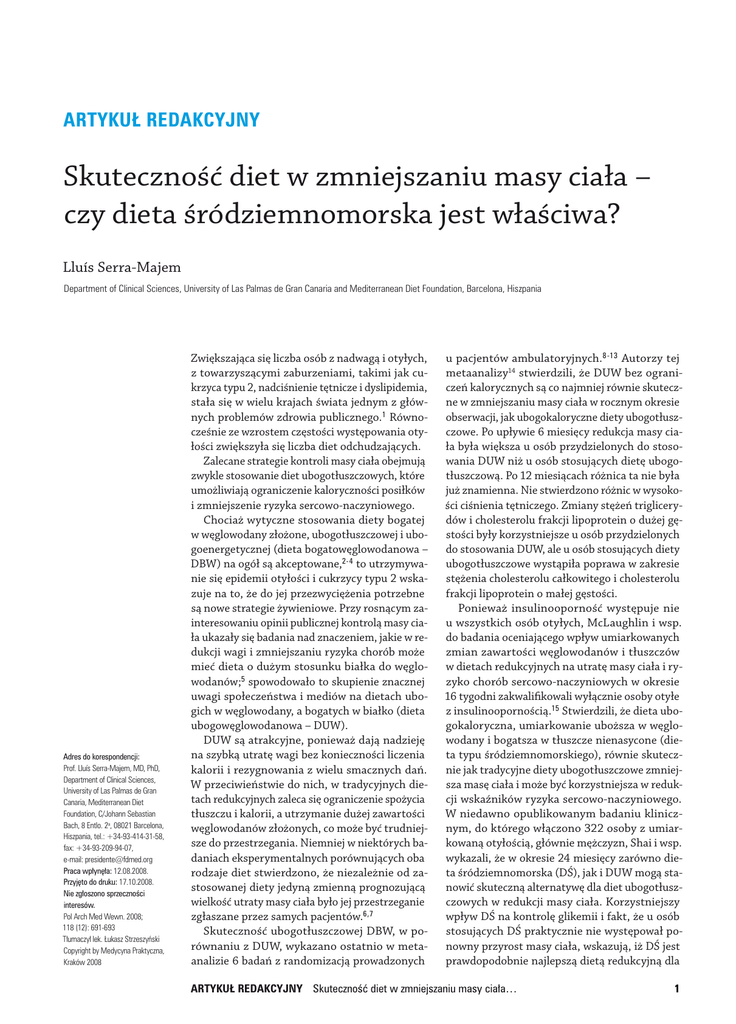 ARTYKUŁ REDAKCYJNY Skuteczność diet w zmniejszaniu masy ciała – czy dieta śródziemnomorska jest właściwa? Lluís Serra‑Majem Department of Clinical Sciences, University of Las Palmas de Gran Canaria and Mediterranean Diet Foundation, Barcelona, Hiszpania Adres do korespondencji: Prof. Lluís Serra-Majem, MD, PhD, Department of Clinical Sciences, University of Las Palmas de Gran Canaria, Mediterranean Diet Foundation, C/Johann Sebastian Bach, 8 Entlo. 2a, 08021 Barcelona, Hiszpania, tel.: +34-93-414-31-58, fax: +34-93-209-94-07, e-mail: [email protected] Praca wpłynęła: 12.08.2008. Przyjęto do druku: 17.10.2008. Nie zgłoszono sprzeczności interesów. Pol Arch Med Wewn. 2008; 118 (12): 691-693 Tłumaczył lek. Łukasz Strzeszyński Copyright by Medycyna Praktyczna, Kraków 2008 Zwiększająca się liczba osób z nadwagą i otyłych, z towarzyszącymi zaburzeniami, takimi jak cu‑ krzyca typu 2, nadciśnienie tętnicze i dyslipidemia, stała się w wielu krajach świata jednym z głów‑ nych problemów zdrowia publicznego.1 Równo‑ cześnie ze wzrostem częstości występowania oty‑ łości zwiększyła się liczba diet odchudzających. Zalecane strategie kontroli masy ciała obejmują zwykle stosowanie diet ubogotłuszczowych, które umożliwiają ograniczenie kaloryczności posiłków i zmniejszenie ryzyka sercowo‑naczyniowego. Chociaż wytyczne stosowania diety bogatej w węglowodany złożone, ubogotłuszczowej i ubo‑ goenergetycznej (dieta bogatowęglowodanowa – DBW) na ogół są akceptowane,2‑4 to utrzymywa‑ nie się epidemii otyłości i cukrzycy typu 2 wska‑ zuje na to, że do jej przezwyciężenia potrzebne są nowe strategie żywieniowe. Przy rosnącym za‑ interesowaniu opinii publicznej kontrolą masy cia‑ ła ukazały się badania nad znaczeniem, jakie w re‑ dukcji wagi i zmniejszaniu ryzyka chorób może mieć dieta o dużym stosunku białka do węglo‑ wodanów;5 spowodowało to skupienie znacznej uwagi społeczeństwa i mediów na dietach ubo‑ gich w węglowodany, a bogatych w białko (dieta ubogowęglowodanowa – DUW). DUW są atrakcyjne, ponieważ dają nadzieję na szybką utratę wagi bez konieczności liczenia kalorii i rezygnowania z wielu smacznych dań. W przeciwieństwie do nich, w tradycyjnych die‑ tach redukcyjnych zaleca się ograniczenie spożycia tłuszczu i kalorii, a utrzymanie dużej zawartości węglowodanów złożonych, co może być trudniej‑ sze do przestrzegania. Niemniej w niektórych ba‑ daniach eksperymentalnych porównujących oba rodzaje diet stwierdzono, że niezależnie od za‑ stosowanej diety jedyną zmienną prognozującą wielkość utraty masy ciała było jej przestrzeganie zgłaszane przez samych pacjentów.6,7 Skuteczność ubogotłuszczowej DBW, w po‑ równaniu z DUW, wykazano ostatnio w meta analizie 6 badań z randomizacją prowadzonych u pacjentów ambulatoryjnych.8 ‑13 Autorzy tej metaanalizy14 stwierdzili, że DUW bez ograni‑ czeń kalorycznych są co najmniej równie skutecz‑ ne w zmniejszaniu masy ciała w rocznym okresie obserwacji, jak ubogokaloryczne diety ubogotłusz‑ czowe. Po upływie 6 miesięcy redukcja masy cia‑ ła była większa u osób przydzielonych do stoso‑ wania DUW niż u osób stosujących dietę ubogo‑ tłuszczową. Po 12 miesiącach różnica ta nie była już znamienna. Nie stwierdzono różnic w wysoko‑ ści ciśnienia tętniczego. Zmiany stężeń triglicery‑ dów i cholesterolu frakcji lipoprotein o dużej gę‑ stości były korzystniejsze u osób przydzielonych do stosowania DUW, ale u osób stosujących diety ubogotłuszczowe wystąpiła poprawa w zakresie stężenia cholesterolu całkowitego i cholesterolu frakcji lipoprotein o małej gęstości. Ponieważ insulinooporność występuje nie u wszystkich osób otyłych, McLaughlin i wsp. do badania oceniającego wpływ umiarkowanych zmian zawartości węglowodanów i tłuszczów w dietach redukcyjnych na utratę masy ciała i ry‑ zyko chorób sercowo‑naczyniowych w okresie 16 tygodni zakwalifikowali wyłącznie osoby otyłe z insulinoopornością.15 Stwierdzili, że dieta ubo‑ gokaloryczna, umiarkowanie uboższa w węglo‑ wodany i bogatsza w tłuszcze nienasycone (die‑ ta typu śródziemnomorskiego), równie skutecz‑ nie jak tradycyjne diety ubogotłuszczowe zmniej‑ sza masę ciała i może być korzystniejsza w reduk‑ cji wskaźników ryzyka sercowo‑naczyniowego. W niedawno opublikowanym badaniu klinicz‑ nym, do którego włączono 322 osoby z umiar‑ kowaną otyłością, głównie mężczyzn, Shai i wsp. wykazali, że w okresie 24 miesięcy zarówno die‑ ta śródziemnomorska (DŚ), jak i DUW mogą sta‑ nowić skuteczną alternatywę dla diet ubogotłusz‑ czowych w redukcji masy ciała. Korzystniejszy wpływ DŚ na kontrolę glikemii i fakt, że u osób stosujących DŚ praktycznie nie występował po‑ nowny przyrost masy ciała, wskazują, iż DŚ jest prawdopodobnie najlepszą dietą redukcyjną dla ARTYKUŁ REDAKCYJNY Skuteczność diet w zmniejszaniu masy ciała… 1 osób z umiarkowaną otyłością lub nadwagą. Dla bardzo otyłych odpowiednie mogą być jednak inne diety. Inne czynniki, które trzeba brać pod uwagę, to indeks glikemiczny i rodzaj węglowodanów (złożone czy proste) w diecie. Ponadto należy pa‑ miętać o wnioskach z analizy nawyków żywie‑ niowych w dobie współczesnej epidemii otyło‑ ści i cukrzycy w Stanach Zjednoczonych – anali‑ za ta wskazała, że za zwiększenie spożycia kalo‑ rii odpowiadają niemal wyłącznie węglowodany.17 Wydaje się jednak, że zupełnie inny jest profil ży‑ wieniowy w krajach basenu Morza Śródziemne‑ go, gdzie rosnącej częstości występowania otyło‑ ści towarzyszy zmniejszenie spożycia głównych źródeł węglowodanów.18 W niedawnym przeglądzie systematycznym19 wyciągnięto wniosek, że dane epidemiologiczne na temat związku między przestrzeganiem DŚ 
