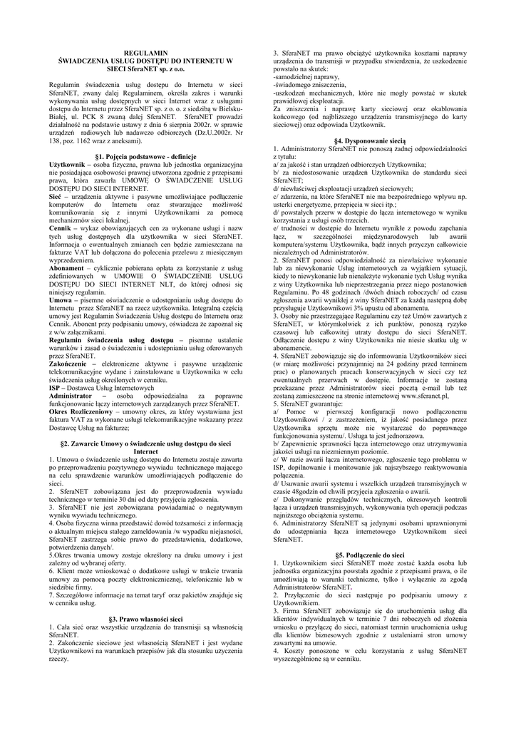 REGULAMIN ŚWIADCZENIA USŁUG DOSTĘPU DO INTERNETU W SIECI SferaNET sp. z o.o. Regulamin świadczenia usług dostępu do Internetu w sieci SferaNET, zwany dalej Regulaminem, określa zakres i warunki wykonywania usług dostępnych w sieci Internet wraz z usługami dostępu do Internetu przez SferaNET sp. z o. o. z siedzibą w BielskuBiałej, ul. PCK 8 zwaną dalej SferaNET. SferaNET prowadzi działalność na podstawie ustawy z dnia 6 sierpnia 2002r. w sprawie urządzeń radiowych lub nadawczo odbiorczych (Dz.U.2002r. Nr 138, poz. 1162 wraz z aneksami). §1. Pojęcia podstawowe - definicje Użytkownik – osoba fizyczna, prawna lub jednostka organizacyjna nie posiadająca osobowości prawnej utworzona zgodnie z przepisami prawa, która zawarła UMOWĘ O ŚWIADCZENIE USŁUG DOSTĘPU DO SIECI INTERNET. Sieć – urządzenia aktywne i pasywne umożliwiające podłączenie komputerów do Internetu oraz stwarzające możliwość komunikowania się z innymi Użytkownikami za pomocą mechanizmów sieci lokalnej. Cennik – wykaz obowiązujących cen za wykonane usługi i nazw tych usług dostępnych dla użytkownika w sieci SferaNET. Informacja o ewentualnych zmianach cen będzie zamieszczana na fakturze VAT lub dołączona do polecenia przelewu z miesięcznym wyprzedzeniem. Abonament – cyklicznie pobierana opłata za korzystanie z usług zdefiniowanych w UMOWIE O ŚWIADCZENIE USŁUG DOSTĘPU DO SIECI INTERNET NLT, do której odnosi się niniejszy regulamin. Umowa – pisemne oświadczenie o udostępnianiu usług dostępu do Internetu przez SferaNET na rzecz użytkownika. Integralną częścią umowy jest Regulamin Świadczenia Usług dostępu do Internetu oraz Cennik. Abonent przy podpisaniu umowy, oświadcza że zapoznał się z w/w załącznikami. Regulamin świadczenia usług dostępu – pisemne ustalenie warunków i zasad o świadczeniu i udostępnianiu usług oferowanych przez SferaNET. Zakończenie – elektroniczne aktywne i pasywne urządzenie telekomunikacyjne wydane i zainstalowane u Użytkownika w celu świadczenia usług określonych w cenniku. ISP – Dostawca Usług Internetowych Administrator – osoba odpowiedzialna za poprawne funkcjonowanie łączy internetowych zarządzanych przez SferaNET. Okres Rozliczeniowy – umowny okres, za który wystawiana jest faktura VAT za wykonane usługi telekomunikacyjne wskazany przez Dostawcę Usług na fakturze; §2. Zawarcie Umowy o świadczenie usług dostępu do sieci Internet 1. Umowa o świadczenie usług dostępu do Internetu zostaje zawarta po przeprowadzeniu pozytywnego wywiadu technicznego mającego na celu sprawdzenie warunków umożliwiających podłączenie do sieci. 2. SferaNET zobowiązana jest do przeprowadzenia wywiadu technicznego w terminie 30 dni od daty przyjęcia zgłoszenia. 3. SferaNET nie jest zobowiązana powiadamiać o negatywnym wyniku wywiadu technicznego. 4. Osoba fizyczna winna przedstawić dowód tożsamości z informacją o aktualnym miejscu stałego zameldowania /w wypadku niejasności, SferaNET zastrzega sobie prawo do przedstawienia, dodatkowo, potwierdzenia danych/. 5.Okres trwania umowy zostaje określony na druku umowy i jest zależny od wybranej oferty. 6. Klient może wnioskować o dodatkowe usługi w trakcie trwania umowy za pomocą poczty elektronicznicznej, telefonicznie lub w siedzibie firmy. 7. Szczegółowe informacje na temat taryf oraz pakietów znajduje się w cenniku usług. §3. Prawo własności sieci 1. Cała sieć oraz wszystkie urządzenia do transmisji są własnością SferaNET. 2. Zakończenie sieciowe jest własnością SferaNET i jest wydane Użytkownikowi na warunkach przepisów jak dla stosunku użyczenia rzeczy. 3. SferaNET ma prawo obciążyć użytkownika kosztami naprawy urządzenia do transmisji w przypadku stwierdzenia, że uszkodzenie powstało na skutek: -samodzielnej naprawy, -świadomego zniszczenia, -uszkodzeń mechanicznych, które nie mogły powstać w skutek prawidłowej eksploatacji. Za zniszczenia i naprawę karty sieciowej oraz okablowania końcowego (od najbliższego urządzenia transmisyjnego do karty sieciowej) oraz odpowiada Użytkownik. §4. Dysponowanie siecią 1. Administratorzy SferaNET nie ponoszą żadnej odpowiedzialności z tytułu: a/ za jakość i stan urządzeń odbiorczych Użytkownika; b/ za niedostosowanie urządzeń Użytkownika do standardu sieci SferaNET; d/ niewłaściwej eksploatacji urządzeń sieciowych; c/ zdarzenia, na które SferaNET nie ma bezpośredniego wpływu np. usterki energetyczne, przepięcia w sieci itp.; d/ powstałych przerw w dostępie do łącza internetowego w wyniku korzystania z usługi osób trzecich. e/ trudności w dostępie do Internetu wynikłe z powodu zapchania łącz, w szczególności międzynarodowych lub awarii komputera/systemu Użytkownika, bądź innych przyczyn całkowicie niezależnych od Administratorów. 2. SferaNET ponosi odpowiedzialność za niewłaściwe wykonanie lub za niewykonanie Usług internetowych za wyjątkiem sytuacji, kiedy to niewykonanie lub nienależyte wykonanie tych Usług wynika z winy Użytkownika lub nieprzestrzegania przez niego postanowień Regulaminu. Po 48 godzinach /dwóch dniach roboczych/ od czasu zgłoszenia awarii wynikłej z winy SferaNET za każdą następną dobę przysługuje Użytkownikowi 3% upustu od abonamentu. 3. Osoby nie przestrzegające Regulaminu czy też Umów zawartych z SferaNET, w którymkolwiek z ich punktów, ponoszą ryzyko czasowej lub całkowitej utraty dostępu do sieci SferaNET. Odłączenie dostępu z winy Użytkownika nie niesie skutku ulg w abonamencie. 4. SferaNET zobowiązuje się do informowania Użytkowników sieci (w miarę możliwości przynajmniej na 24 godziny przed terminem prac) o planowanych pracach konserwacyjnych w sieci czy też ewentualnych przerwach w dostępie. Informacje te zostaną przekazane przez Administratorów sieci pocztą e-mail lub też zostaną zamieszczone na stronie internetowej www.sferanet.pl, 5. SferaNET gwa