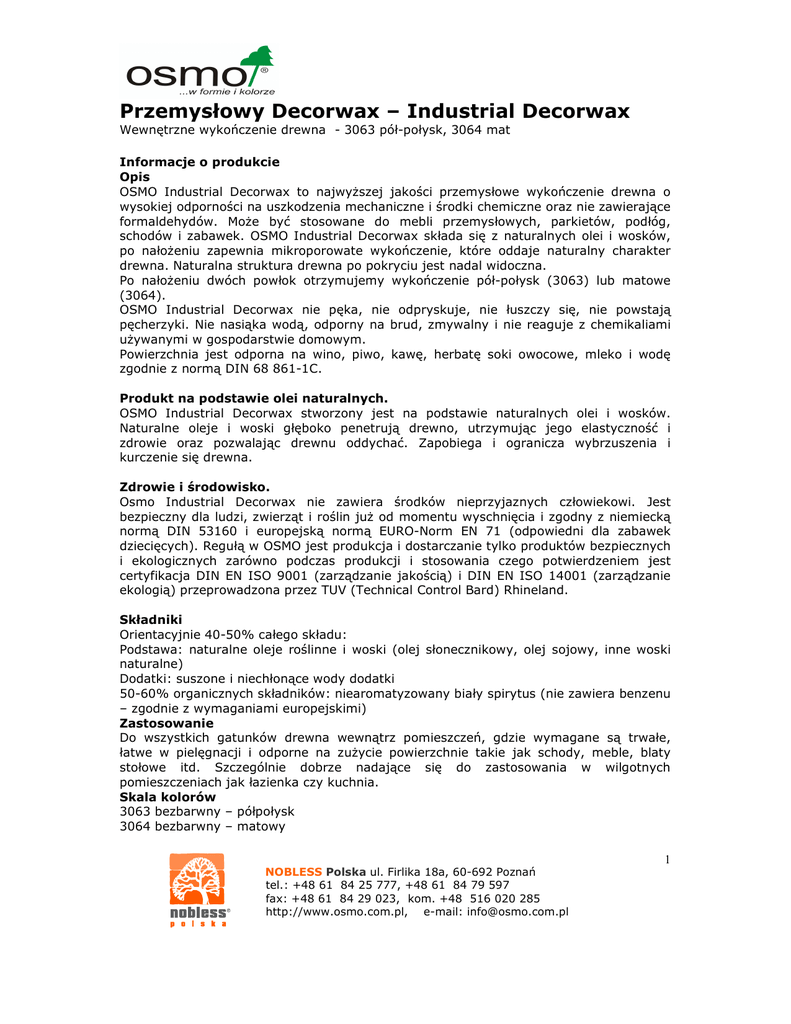 Przemysłowy Decorwax – Industrial Decorwax Wewnętrzne wykończenie drewna - 3063 pół-połysk, 3064 mat Informacje o produkcie Opis OSMO Industrial Decorwax to najwyŜszej jakości przemysłowe wykończenie drewna o wysokiej odporności na uszkodzenia mechaniczne i środki chemiczne oraz nie zawierające formaldehydów. MoŜe być stosowane do mebli przemysłowych, parkietów, podłóg, schodów i zabawek. OSMO Industrial Decorwax składa się z naturalnych olei i wosków, po nałoŜeniu zapewnia mikroporowate wykończenie, które oddaje naturalny charakter drewna. Naturalna struktura drewna po pokryciu jest nadal widoczna. Po nałoŜeniu dwóch powłok otrzymujemy wykończenie pół-połysk (3063) lub matowe (3064). OSMO Industrial Decorwax nie pęka, nie odpryskuje, nie łuszczy się, nie powstają pęcherzyki. Nie nasiąka wodą, odporny na brud, zmywalny i nie reaguje z chemikaliami uŜywanymi w gospodarstwie domowym. Powierzchnia jest odporna na wino, piwo, kawę, herbatę soki owocowe, mleko i wodę zgodnie z normą DIN 68 861-1C. Produkt na podstawie olei naturalnych. OSMO Industrial Decorwax stworzony jest na podstawie naturalnych olei i wosków. Naturalne oleje i woski głęboko penetrują drewno, utrzymując jego elastyczność i zdrowie oraz pozwalając drewnu oddychać. Zapobiega i ogranicza wybrzuszenia i kurczenie się drewna. Zdrowie i środowisko. Osmo Industrial Decorwax nie zawiera środków nieprzyjaznych człowiekowi. Jest bezpieczny dla ludzi, zwierząt i roślin juŜ od momentu wyschnięcia i zgodny z niemiecką normą DIN 53160 i europejską normą EURO-Norm EN 71 (odpowiedni dla zabawek dziecięcych). Regułą w OSMO jest produkcja i dostarczanie tylko produktów bezpiecznych i ekologicznych zarówno podczas produkcji i stosowania czego potwierdzeniem jest certyfikacja DIN EN ISO 9001 (zarządzanie jakością) i DIN EN ISO 14001 (zarządzanie ekologią) przeprowadzona przez TUV (Technical Control Bard) Rhineland. Składniki Orientacyjnie 40-50% całego składu: Podstawa: naturalne oleje roślinne i woski (olej słonecznikowy, olej sojowy, inne woski naturalne) Dodatki: suszone i niechłonące wody dodatki 50-60% organicznych składników: niearomatyzowany biały spirytus (nie zawiera benzenu – zgodnie z wymaganiami europejskimi) Zastosowanie Do wszystkich gatunków drewna wewnątrz pomieszczeń, gdzie wymagane są trwałe, łatwe w pielęgnacji i odporne na zuŜycie powierzchnie takie jak schody, meble, blaty stołowe itd. Szczególnie dobrze nadające się do zastosowania w wilgotnych pomieszczeniach jak łazienka czy kuchnia. Skala kolorów 3063 bezbarwny – półpołysk 3064 bezbarwny – matowy 1 NOBLESS Polska ul. Firlika 18a, 60-692 Poznań tel.: +48 61 84 25 777, +48 61 84 79 597 fax: +48 61 84 29 023, kom. +48 516 020 285 http://www.osmo.com.pl, e-mail: [email protected] Przemysłowy Decorwax – Industrial Decorwax Wewnętrzne wykończenie drewna - 3063 pół-połysk, 3064 mat MoŜna uzyskać kolory na Ŝyczenie łącząc produkt z OSMO COLOR Point Division (minimalne opakowanie 20kg). Jeśli chcemy nakładać OSMO Wood Wax w kolorze transparentnym (lub mieszanym) jest on nakładany jako pierwsza powłoka. Po wyschnięciu nakładamy bezbarwny OSMO Industrial Decorwax jako powłokę wykończeniową. Wielkości opakowań: 20kg kanister 2,5l puszka Przygotowanie powierzchni Powierzchnia drewna musi być czysta, sucha (maksymalna wilgotność 20%), nie zamarznięta. Meble: powierzchnia musi być wyszlifowana (grubość papieru P 180) – pył naleŜy dokładnie usunąć. Metoda aplikacji OSMO Industrial Decorwax jest gotowy do uŜycia od razu po otwarciu opakowania. Nie rozrzedzać. Dobrze wymieszać. Ilość nakładanego produktu zaleŜy od rodzaju drewna i poŜądanego wykończenia. Standardowe pokrywanie: 1. Pierwsze aplikacja nałoŜyć około 35-40g/m2, suszenie: około 2-3 godzin w pokojowej temperaturze/ około 1 godziny w temperaturze 50 stopni C. Gotowy do szlifowania po 6-8 godzinach / 2-3 godzinach. 2. pośrednie szlifowanie papier o grubości P220 lub cieńszy 3. Druga aplikacja nałoŜyć około 35-40 g/m2, suszenie: około 2,5 godzin w temperaturze pokojowej/ około 1 godziny w temperaturze 50 stopni C; po 12 godzinach moŜna uŜytkować OSMO Industrial Decorwax moŜe być nakładany sprayem jak i szczotką czy teŜ szmatką. Parametry natrysku Metoda Airless/Air-Coat Ciśnienie: około 80 - 120 bar Ciśnienie powietrza w metodzie Air-Coat: około 1 - 2,5 bar Dysza: Kąt natrysku: około 20 - 40º Wielkość dyszy: około 0,28 – 0,33 mm względnie 0,011 – 0,013 cala PowyŜsze parametry są uzaleŜnione między innymi od metody pracy obsługujących/maszyn, wyposaŜenia oraz stanu danego urządzenia jak i rodzaju i formy mechanizmu. Parametry te muszą być w kaŜdym przypadku korygowane, względnie dopasowywane. 2 NOBLESS Polska ul. Firlika 18a, 60-692 Poznań tel.: +48 61 84 25 777, +48 61 84 79 597 fax: +48 61 84 29 023, kom. +48 516 020 285 http://www.osmo.com.pl, e-mail: [email protected] Przemysłowy Decorwax – Industrial Decorwax Wewnętrzne wykończenie drewna - 3063 pół-połysk, 3064 mat Pistolety kubkowe: Ciśnienie natrysku: około 3,0 – 3,5 bar Dysza: Wielkość około 1,3 – 2,0 mm Więcej porad technicznych udzielimy na szczegółowe zapytanie. Czyszczenie narzędzi UŜywając specjalnego OSMO Brush Cleaner 8004 (nie zawiera benzenu) lub białego spirytusu. Konserwacja Do codziennego czyszczenia uŜywać suchej szmatki. Aby usunąć małe plamy uŜywaj wilgotnej, czystej szmatki zamoczonej w roztworze wody i małej ilości OSMO Color Wash&Care 8016. Do usunięcia mocnego brudu i duŜych plam oraz aby utrzymać powierzchnię w doskonałej kondycji uŜywaj OSMO COLOR Liquid Wax Cleaner 3029 (dostępny równieŜ jako spray). Uszkodzone powierzchnie mogą być restaurowane przy pomocy oryginalnego produktu OSMO Hardwax-Oil (3032 półpołysk lub 3062 mat) Uwaga! Trzymać z dala od dzieci. Nie przechowywać w opakowani