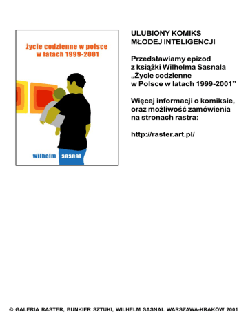ULUBIONY KOMIKS M£ODEJ INTELIGENCJI Przedstawiamy epizod z ksi¹¿ki Wilhelma Sasnala ¯ycie codzienne w Polsce w latach 1999-2001 Wiêcej informacji o komiksie, oraz mo¿liwoæ zamówienia na stronach rastra: http://raster.art.pl/ © GALERIA RASTER, BUNKIER SZTUKI, WILHELM SASNAL WARSZAWA-KRAKÓW 2001 ten plik pochodzi z internetowej strony magazynu artystycznego RASTER raster.art.pl tygodnik zmieniamy obraz polskiej sztuki © RASTER 2001 WSZELKIE PRAWA ZASTRZE¯ONE