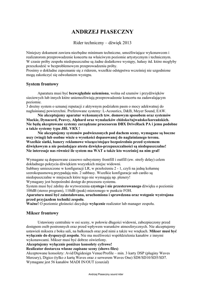 ANDRZEJ PIASECZNY Rider techniczny – d!wi"k 2013 Niniejszy dokument zawiera niezb"dne minimum techniczne, umo#liwiaj$ce wykonawcom i realizatorom przeprowadzenie koncertu na w%a&ciwym poziomie artystycznym i technicznym. W czasie próby zespo%u niedopuszczalne s$ #adne dodatkowe wyst"py, ha%asy itd. które mog%yby przeszkodzi' w bezproblemowym przeprowadzeniu próby. Prosimy o dok%adne zapoznanie si" z riderem, wszelkie odst"pstwa wcze&niej nie uzgodnione mog$ zako(czy' si" odwo%aniem wyst"pu. System frontowy Aparatura musi by' bezwzgl!dnie uziemiona, wolna od szumów i przyd!wi"ków sieciowych lub innych które uniemo#liwiaj$ przeprowadzenie koncertu na zadawalaj$cym poziomie. 3 dro#ny system o uznanej reputacji z aktywnym podzia%em pasm o mocy adekwatnej do nag%a&nianej powierzchni. Preferowane systemy: L-Acoustics, D&B, Meyer Sound, EAW. Nie akceptujemy aparatur wykonanych tzw. domowym sposobem oraz systemów Mackie, Dynacord, Peavey, Alphard oraz wynalazków chi"sko/tajwa"sko/korea"skich. Nie b!d# akceptowane systemy zarz#dzane procesorem DBX DriveRack PA i jemu podobne a tak$e systemy typu JBL VRX ! Nie akceptujemy systemów podwieszonych pod dachem sceny, wymagane s# boczne uszy (wingi) lub osobne wie$e o wysoko%ci dopasowanej do nag&a%nianego terenu. Wszelkie siatki, banery reklamowe wisz#ce/stoj#ce bezpo%rednio przed systemem d'wi!kowym a nie posiadaj#ce atestu dzwi!ko-przepuszczalno%ci s# niedopuszczalne! Nie interesuje nas równie$ ile system ma WAT a tak$e kto wcze%niej na nim gra&! Wymagane s$ dopasowane czasowo subsystemy frontfill i outfill (ew. strefy delay) celem dok%adnego pokrycia d!wi"kiem wszystkich miejsc widowni. Subbasy umieszczone w konfiguracji LR, w prze%o#eniu 2 - 1, czyli na jedn$ kolumn" szerokopasmow$ przypadaj$ min. 2 subbasy. Wszelkie konfiguracje sub cardio s$ niedopuszczalne w miejscach które tego nie wymagaj$ np. plenery! Wymagany jest bezpo&redni dost"p do procesora systemu. System musi by' zdolny do wytworzenia czystego i nie przesterowanego d!wi"ku o poziomie 100dB (stereo program), 110dB (peak) mierzonego w punkcie FOH. Aparatura musi by( zainstalowana, uruchomiona i sprawdzona oraz wst!pnie wystrojona przed przyjazdem techniki zespo&u. Wa$ne! O poziomie g%o&no&ci decyduje wy&#cznie realizator lub manager zespo%u. Mikser frontowy Ustawiony centralnie w osi sceny, w po%owie d%ugo&ci widowni, zabezpieczony przed dost"pem osób postronnych oraz przed wp%ywem warunków atmosferycznych. Nie akceptujemy ustawie( miksera z boku sali, na balkonach oraz pod nimi a tak#e we wn"kach. Mikser musi by( wy&#cznie do dyspozycji zespo&u. Nie ma mo#liwo&ci wspó%dzielenia kana%ów z innymi wykonawcami. Mikser musi by' dobrze o&wietlony. Akceptujemy wy&#cznie poni$sze konsolety cyfrowe! Realizator dostarcza w&asne zapisane sceny (shows files) Akceptowane konsolety: Avid/Digidesign Venue/Profile – min. 3 karty DSP (pluginy Waves Mercury), Digico (tylko z kart$ Waves oraz z serwerem Waves One) SD8/SD10/SD5/SD7. Wymagane jest 56 kana%ów MADI IN/OUT (coaxial) $QGU]HM3LDVHF]Q\VRXQGULGHU System monitorowy Zespó% dysponuje w%asnym systemem monitorowym sk%adaj$cym si" z cyfrowego sto%u Yamaha LS9 oraz kompletem systemów dousznych i personalnych mikserów umieszczonych przy muzykach. Niezb"dne jest zapewnienie prawid%owego zasilania i okablowania do tego systemu zgodnie z sugestiami techniki zespo%u. Wymagane jest niezale#ne rozszycie monitorowe "splitt" zako(czony odpowiedni$ ilo&ci$ wtyków XLR. Prosimy o przygotowanie rozszy' monitorowych po lewej stronie sceny (patrz$c z pozycji FOH). Widoczno%( na scen! i muzyków z pozycji monitora nie mo$e by( przys&oni!ta $adnymi elementami utrudniaj#cymi kontakt wzrokowy pomi!dzy realizatorem a zespo&em. Potrzebujemy równie# dwa pojemno&ciowe mikrofony (shotguny! AT8035) ustawione w kierunku publiczno&ci które pod%$czamy tylko do naszego systemu monitorowego. Zasilanie System (aparatura + sprz"t muzyków) musi by' zasilany z tego samego !ród%a, umo#liwiaj$cego odpowiedni pobór mocy – adekwatnie do potrzeb zainstalowanej aparatury. Zarówno w przypadku zasilania jednofazowego, jak te# i trójfazowego, bezwzgl"dnie wymagana jest instalacja z dodatkowym przewodem ochronnym. Napi"cie pomi"dzy przewodem ochronnym a uziemieniem nie mo#e przekracza' 2V. Firmy zapewniaj$ce nag%o&nienie, o&wietlenie oraz zasilanie bior$ na siebie ca%kowit$ odpowiedzialno&' za sprz"t artysty, bezpiecze(stwo wykonawców, realizatorów oraz techniki zespo%u podczas prób i koncertu. Uwagi Wszystkie po%$czenia powinny by' prowadzone w sposób symetryczny przy u#yciu kabli dobrej jako&ci i zako(czone ko(cówkami XLR. Prosimy o dostarczenie odpowiedniej ilo&ci czarnych, solidnych statywów mikrofonowych których stan nie wzbudza zastrze#e(. Mi"dzy scen$ a konsolet$ frontow$ musi by' poprowadzona komunikacja TalkBack oraz pomi"dzy FOH i MON komunikacja ClearCom. Wymagany jest ekran akustyczny (pleksa) o wymiarach pozwalaj$cych na izolacje perkusji od reszty sceny (standardowo 6 elementów) W czasie prób i koncertu obowi$zkowa jest obecno&' (trze!wej!) do&wiadczonej ekipy technicznej odpowiedzialnej za scen" i system d!wi"kowy. Dopuszcza si! mo$liwo%( zmian – po wcze%niejszym ich zaakceptowaniu przez zespó&. W przypadku w#tpliwo%ci lub uzyskania dodatkowych informacji prosimy o kontakt: Arek Wielgosik tel.+48601736087 mail. [email protected] $QGU]HM3LDVHF]Q\VRXQGULGHU ANDRZEJ PIASECZNY input lista !"#$ %!&'"()*!'$ +%,-.#/$ !" #$%#"$&" '()!*"+',-(!" /" >" #$%#"012" ?&!"20@" &34565*"+',-"7/" A'BC"@D/)*"EFGBH"B7*"?I7J" N" 7" 6" ?&!"+0220I" ?&/"20@" AA" J" 5" 0'1!2&$ /!&*"'$345$ .-,'" " 89:;,"<::=" 89:;,"<::=3KCBL":M" .-,'" .-,'" E2/)/)*"#I!5N*"%N7!+" A'BC"@D/)*"EFGBH"B7*"?I7J" %N7!+*"#I!5N*"EO>)))" 89:;,"<::=3"KCBL":M" 89:;,"<::=3"KCBL":M" 89:;,"<::=" .-,'" .-,'"" K:=L" 20I!" 20I/" EFGBH"I!/NN*"+',-"(54?" EFGBH"I!/NN*"+',-"(54?" KCBL8":M" KCBL8":M" .-,'" .-,'" (" !)" 20I>" D$4O" EFGBH"I!/NN*"+',-"(54?" %N7!+*"#I!5N*"EO>)))" KCBL8":M" 89:;,"<::="" .-,'" 