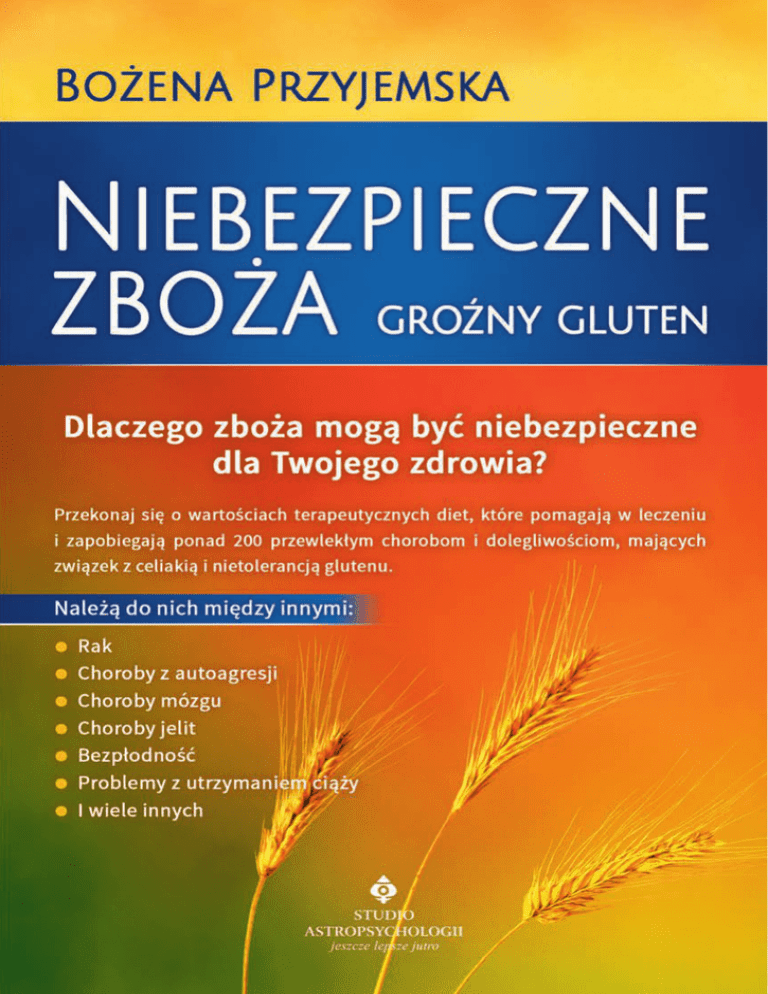 Konsultacja medyczna: lek. med. Konrad Bach Redakcja: Natalia Paszko Skład komputerowy: Piotr Pisiak Projekt okładki: Piotr Pisiak Wydanie I Białystok 2013 ISBN 978-83-7377-590-9 Kontakt z Autorem: Bożena Przyjemska 30 Allanhurst dr apt 609 Toronto, Ont M9A 4J8 Kanada e-mail: [email protected] Copyright for this edition by Studio Astropsychologii, Białystok 2013. All rights reserved, including the right of reproduction in whole or in part in any form. Wszelkie prawa zastrzeżone. Żadna część tej publikacji nie może być powielana ani rozpowszechniana za pomocą urządzeń elektronicznych, mechanicznych, kopiujących, nagrywających i innych bez pisemnej zgody posiadaczy praw autorskich. Bądź na bieżąco i śledź nasze wydawnictwo na Facebooku. www.facebook.com/Wydawnictwo.Studio.Astropsychologii 15-762 Białystok ul. Antoniuk Fabr. 55/24 85 662 92 67 – redakcja 85 654 78 06 – sekretariat 85 653 13 03 – dział handlowy – hurt 85 654 78 35 – www.talizman.pl – detal sklep firmowy: Białystok, ul. Antoniuk Fabr. 55/20 Więcej informacji znajdziesz na portalu www.psychotronika.pl PRINTED IN POLAND Spis treści 1. Wstęp . ..................................................................................... 9 Moja historia . ...................................................................................... 12 Co to jest gluten i dlaczego prowadzi do choroby? .......................... 15 2. Co to jest celiakia? ....................................................... 19 Teoria toksyczna .................................................................................. Teoria autoimmunologiczna ............................................................... Teoria dziedziczna . ............................................................................. Postacie kliniczne celiakii .................................................................. Postać klasyczna choroby trzewnej ............................................... Postać niema ................................................................................... Postać ukryta, późno ujawniająca się ........................................... Celiakia letalna – choroba Dühringa . ............................................... 20 21 21 22 22 23 25 25 3. Nietolerancja glutenu a alergia .......................... 29 Reakcja krzyżowa układu immunologicznego powodem niepowodzeń diety bezglutenowej ................................................ 33 Diagnostyka celiakii . .......................................................................... 35 4. Uzależnienie od zbóż i produktów mącznych zawierających gluten ................................................... 37 Dlaczego jesteśmy tak wrażliwi na podstawowy składnik naszej diety? ................................................................................... Jakie wady ma dieta wysokozbożowa dla zdrowia całej populacji? ............................................................................... Zespół nieszczelnych jelit ................................................................... Ocena przepuszczalności bariery jelitowej ....................................... Leczenie i zapobieganie ...................................................................... 40 42 45 51 52 5. Drugi mózg – przewód pokarmowy . .............. 55 Unikalny układ nerwowy przewodu pokarmowego, nasz drugi mózg ............................................................................. Trochę historii ..................................................................................... Fizjologia układu nerwowego jelit ..................................................... Zadziwiające podobieństwo do mózgu ............................................. 95% serotoniny produkowane jest w jelitach . ................................. Zależności między obydwoma układami są ciągle nie do końca wyjaśnione . ................................................... 6 1 2 6 6 3 6 4 6 5 7 6 6. Rak i jego powiązania z nietolerancją zbóż . .............................................................................................. 69 W jaki sposób gluten podnosi ryzyko zachorowalności na choroby nowotworowe? ............................................................ 72 7. Powiązania chorób autoimmunologicznych z chorobą trzewną (celiakią) i nietolerancją glutenu . .................................................................................. 79 Wpływ glutenu na produkcję przeciwciał ........................................ 82 Powiązanie chorób z autoagresji z nadwrażliwością na gluten ......................................................................................... 83 Autoimmunologiczne choroby tarczycy a gluten . ............................ 84 Przewlekłe limfocytowe zapalenie tarczycy – choroba Hashimoto ..................................................................... 85 Choroba Gravesa-Basedowa .............................................................. 87 Cukrzyca insulinozależna . ................................................................. 88 Cukrzyca typu 2. insulinoniezależna ................................................ 90 Autoimmunologiczne schorzenia wątroby ........................................ 92 Reumatyzm schorzeniem układu immunologicznego ..................... 94 Reumatoidalne zapalenie stawów (RZS) .......................................... 96 Młodzieńcze przewlekłe zapalenie stawów ...................................... 97 Zesztywniające zapalenie stawów kręgosłupa . ................................ 98 Toczeń trzewny układowy .................................................................. 99 Gorączka reumatyczna ....................................................................... 100 8. Osteoporoza a gluten ................................................. 101 Co to jest osteoporoza .................................................................