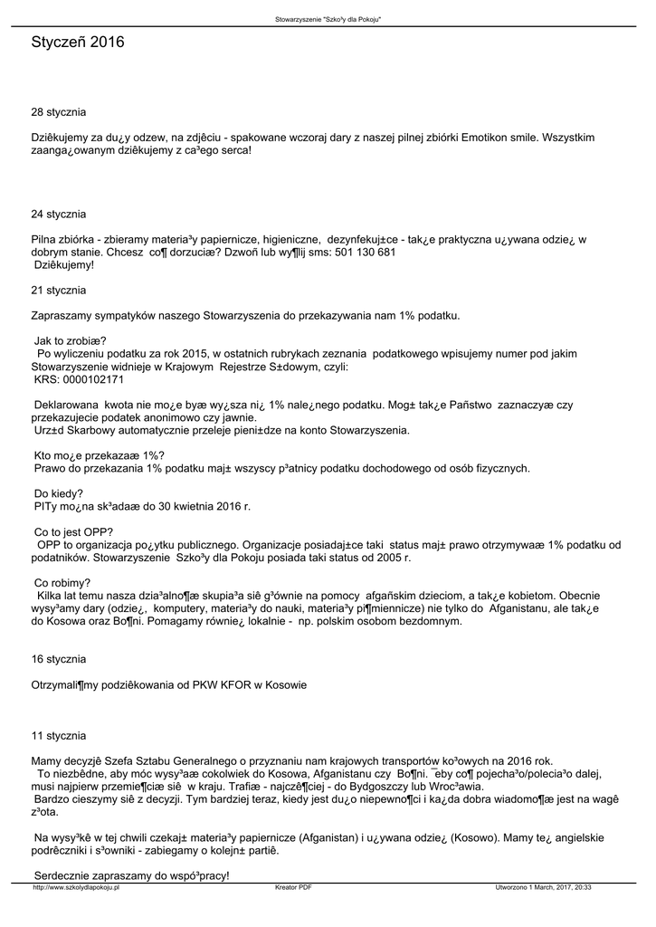 Stowarzyszenie "Szko³y dla Pokoju" Styczeñ 2016 28 stycznia Dziêkujemy za du¿y odzew, na zdjêciu - spakowane wczoraj dary z naszej pilnej zbiórki Emotikon smile. Wszystkim zaanga¿owanym dziêkujemy z ca³ego serca! 24 stycznia Pilna zbiórka - zbieramy materia³y papiernicze, higieniczne, dezynfekuj±ce - tak¿e praktyczna u¿ywana odzie¿ w dobrym stanie. Chcesz co¶ dorzuciæ? Dzwoñ lub wy¶lij sms: 501 130 681 Dziêkujemy! 21 stycznia Zapraszamy sympatyków naszego Stowarzyszenia do przekazywania nam 1% podatku. Jak to zrobiæ? Po wyliczeniu podatku za rok 2015, w ostatnich rubrykach zeznania podatkowego wpisujemy numer pod jakim Stowarzyszenie widnieje w Krajowym Rejestrze S±dowym, czyli: KRS: 0000102171 Deklarowana kwota nie mo¿e byæ wy¿sza ni¿ 1% nale¿nego podatku. Mog± tak¿e Pañstwo zaznaczyæ czy przekazujecie podatek anonimowo czy jawnie. Urz±d Skarbowy automatycznie przeleje pieni±dze na konto Stowarzyszenia. Kto mo¿e przekazaæ 1%? Prawo do przekazania 1% podatku maj± wszyscy p³atnicy podatku dochodowego od osób fizycznych. Do kiedy? PITy mo¿na sk³adaæ do 30 kwietnia 2016 r. Co to jest OPP? OPP to organizacja po¿ytku publicznego. Organizacje posiadaj±ce taki status maj± prawo otrzymywaæ 1% podatku od podatników. Stowarzyszenie Szko³y dla Pokoju posiada taki status od 2005 r. Co robimy? Kilka lat temu nasza dzia³alno¶æ skupia³a siê g³ównie na pomocy afgañskim dzieciom, a tak¿e kobietom. Obecnie wysy³amy dary (odzie¿, komputery, materia³y do nauki, materia³y pi¶miennicze) nie tylko do Afganistanu, ale tak¿e do Kosowa oraz Bo¶ni. Pomagamy równie¿ lokalnie - np. polskim osobom bezdomnym. 16 stycznia Otrzymali¶my podziêkowania od PKW KFOR w Kosowie 11 stycznia Mamy decyzjê Szefa Sztabu Generalnego o przyznaniu nam krajowych transportów ko³owych na 2016 rok. To niezbêdne, aby móc wysy³aæ cokolwiek do Kosowa, Afganistanu czy Bo¶ni. ¯eby co¶ pojecha³o/polecia³o dalej, musi najpierw przemie¶ciæ siê w kraju. Trafiæ - najczê¶ciej - do Bydgoszczy lub Wroc³awia. Bardzo cieszymy siê z decyzji. Tym bardziej teraz, kiedy jest du¿o niepewno¶ci i ka¿da dobra wiadomo¶æ jest na wagê z³ota. Na wysy³kê w tej chwili czekaj± materia³y papiernicze (Afganistan) i u¿ywana odzie¿ (Kosowo). Mamy te¿ angielskie podrêczniki i s³owniki - zabiegamy o kolejn± partiê. Serdecznie zapraszamy do wspó³pracy! http://www.szkolydlapokoju.pl Kreator PDF Utworzono 1 March, 2017, 20:33 Stowarzyszenie "Szko³y dla Pokoju" CallSend SMSCall from mobileAdd to SkypeYou'll need Skype CreditFree via Skype http://www.szkolydlapokoju.pl Kreator PDF Utworzono 1 March, 2017, 20:33