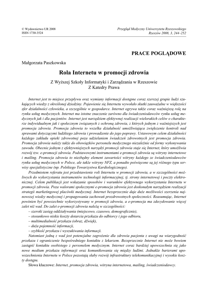 Przegląd Medyczny Uniwersytetu Rzeszowskiego Rzeszów 2008, 3, 244–252 © Wydawnictwo UR 2008 ISSN 1730-3524 PRACE POGLĄDOWE Małgorzata Paszkowska Rola Internetu w promocji zdrowia Z Wyższej Szkoły Informatyki i Zarządzania w Rzeszowie Z Katedry Prawa Internet jest to miejsce przepływu oraz wymiany informacji dostępne coraz szerszej grupie ludzi szukających wiedzy z określonej dziedziny. Pojawienie się Internetu wywołało skutki zauważalne w większości sfer działalności człowieka, a szczególnie w gospodarce. Internet ogrywa także coraz ważniejszą rolę na rynku usług medycznych. Internet ma istotne znaczenie zarówno dla świadczeniodawców rynku usług medycznych jak i dla pacjentów. Internet jest narzędziem efektywnej realizacji wielorakich celów o charakterze indywidualnym jak i społecznym związanych z ochroną zdrowia, z których jednym z ważniejszych jest promocja zdrowia. Promocja zdrowia to wszelka działalność umożliwiająca zwiększenie kontroli nad sprawami dotyczącymi ludzkiego zdrowia i prowadzenie do jego poprawy. Ustawowym celem działalności każdego zakładu opieki zdrowotnej poza udzielaniem świadczeń zdrowotnych jest promocja zdrowia. Promocja zdrowia należy także do obowiązków personelu medycznego niezależnie od formy wykonywania zawodu. Obecnie jednym z efektywniejszych narzędzi promocji zdrowia staje się Internet, który umożliwia rozwój tzw. e-promocji zdrowia. Podstawowymi instrumentami e-promocji zdrowia są witryny internetowe i mailing. Promocja zdrowia to niezbędny element zawartości witryny każdego ze świadczeniodawców rynku usług medycznych w Polsce, ale także witryny NFZ, a ponadto poświęcone są jej różnego typu serwisy specjalistyczne (np. Polskiego Towarzystwa Kardiologicznego). Przedmiotem referatu jest przedstawienie roli Internetu w promocji zdrowia, a w szczególności możliwych do wykorzystania instrumentów technologii informacyjnej, tj. strony internetowej i poczty elektronicznej. Celem publikacji jest wskazanie sposobów i warunków efektywnego wykorzystania Internetu w promocji zdrowia. Poza walorami społecznymi e-promocja zdrowia jest doskonałym narzędziem realizacji strategii marketingowej placówki medycznej. Internet bezsprzecznie daje duże możliwości szerzenia najnowszej wiedzy medycznej i propagowania zachowań prozdrowotnych społeczności. Reasumując, Internet powinien być powszechnie wykorzystywany w promocji zdrowia, a e-promocja ma zdecydowanie więcej zalet niż wad. Do zalet e-promocji zdrowia należą w szczególności: – szeroki zasięg oddziaływania (miejscowo, czasowo, demograficznie), – stosunkowo niskie koszty dotarcia przekazu do odbiorcy i jego odbioru, – multimedialność przekazu (obraz, dźwięk), – duża pojemność informacji, – szybkość przekazu i wyszukiwania informacji. Natomiast jedną z wad jest potencjalne zagrożenie dla zdrowia pacjenta z uwagi na wiarygodność przekazu i ograniczenie bezpośredniego kontaktu z lekarzem. Bezsprzecznie Internet nie może bowiem zastąpić kontaktu osobistego z personelem medycznym. Internet coraz bardziej upowszechnia się jako nowe medium przekazu informacji oraz komunikowania się między ludźmi. Jednakże barierami upowszechnienia Internetu w Polsce pozostają słaby rozwój infrastruktury telekomunikacyjnej i wysokie koszty dostępu. Słowa kluczowe: Internet, promocja zdrowia, witryna internetowa, mailing, świadczeniodawcy. The role of the Internet in health promotion The Internet is a place of flow and exchange of information which is accessible to an increasingly wide range of information seekers looking for specific information. The advent of the Internet influenced many fields of human activity including the economy. The Internet plays an increasingly important role on the market of medical services both for health care providers and recipients. The Internet is a tool which enables health promotion. Health promotion is a set of activities leading to both increased control of human health and the improvement of human health. Under the law, the purpose of every public health care institution is not only health care but health promotion as well. Currently the Internet is one of the most effective instruments of health promotion as it enables the development of e-health promotion. The most important tools of e-health promotion are Web sites and mailing. Health promotion is an essential part of every Web site of every health care provider on Polish health care market. The same refers to the Web page of the National Health Service and different specific Web sites e.g. The Polish Cardiology Society. The paper deals with the role of the Internet in health promotion especially information technology instruments such as Web pages and electronic mail. The aim of the paper is to present ways and conditions of the effective use of the Internet in health promotion. Using the Internet allows health care institutions to put into practice their marketing strategy. The Internet should be widely used in health promotion as it gives a wide range of possibilities to promote medical knowledge and healthy lifestyle. The epromotion has more advantages than disadvantages. The most important advantages are as follows: – wide influence in terms of time, space and demography, – low costs of reaching the recipients and the reception, – multimedia transmission (vision and sound), – great capacity of information, – speed of transmission and searching for information. One of the disadvantages is potential health hazard connected with the fact that there is no interaction with the doctor and as a result, the information can be regarded as nor reliable. The Internet is an increasingly popular communication tool. However, in Polish circumstances barriers for the spread of the internet are underdeveloped infrastructure and high costs of the access to the Internet. Key words: Internet, health promotion, web page, mai