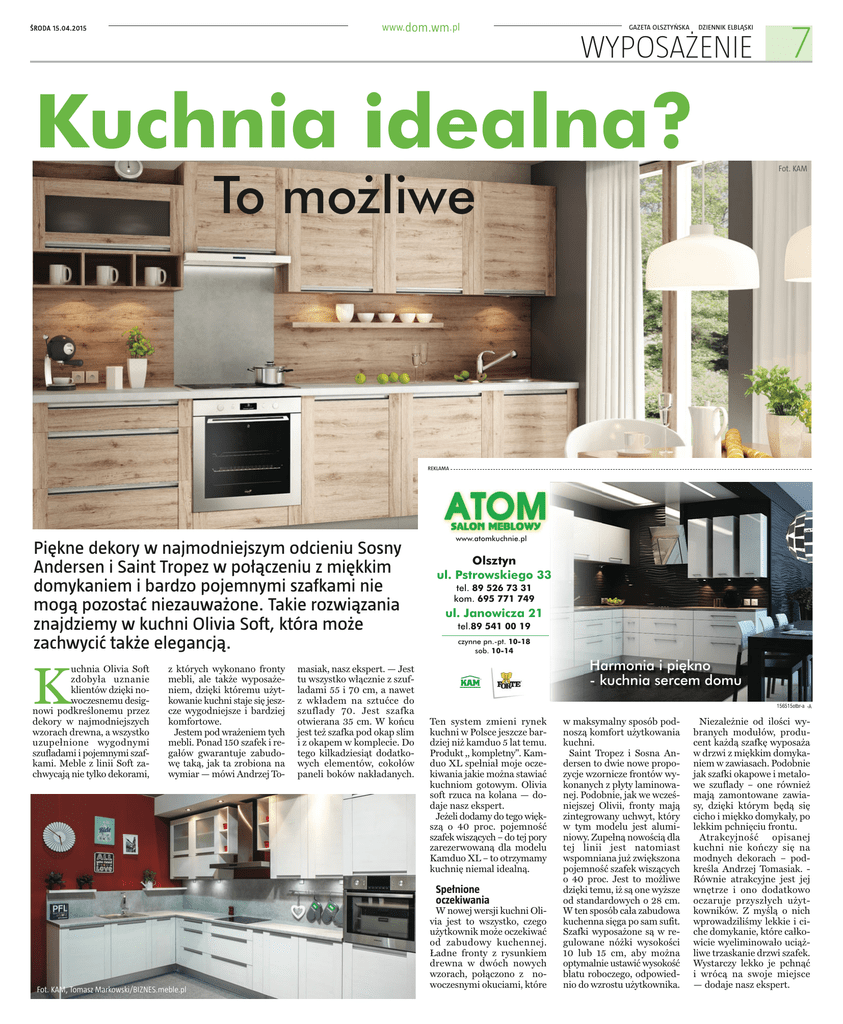 www.dom.wm.pl ŚRODA 15.04.2015 GAZETA OLSZTYŃSKA DZIENNIK ELBLĄSKI WYPOSAŻENIE 7 Kuchnia idealna? Fot. KAM To możliwe REKLAMA Piękne dekory w najmodniejszym odcieniu Sosny Andersen i Saint Tropez w połączeniu z miękkim domykaniem i bardzo pojemnymi szafkami nie mogą pozostać niezauważone. Takie rozwiązania znajdziemy w kuchni Olivia Soft, która może zachwycić także elegancją. K uchnia Olivia Soft zdobyła uznanie klientów dzięki nowoczesnemu designowi podkreślonemu przez dekory w najmodniejszych wzorach drewna, a wszystko uzupełnione wygodnymi szufladami i pojemnymi szafkami. Meble z linii Soft zachwycają nie tylko dekorami, z których wykonano fronty mebli, ale także wyposażeniem, dzięki któremu użytkowanie kuchni staje się jeszcze wygodniejsze i bardziej komfortowe. Jestem pod wrażeniem tych mebli. Ponad 150 szafek i regałów gwarantuje zabudowę taką, jak ta zrobiona na wymiar — mówi Andrzej To- masiak, nasz ekspert. — Jest tu wszystko włącznie z szufladami 55 i 70 cm, a nawet z wkładem na sztućce do szuflady 70. Jest szafka otwierana 35 cm. W końcu jest też szafka pod okap slim i z okapem w komplecie. Do tego kilkadziesiąt dodatkowych elementów, cokołów paneli boków nakładanych. www.atomkuchnie.pl Olsztyn ul. Pstrowskiego 33 tel. 89 526 73 31 kom. 695 771 749 ul. Janowicza 21 tel.89 541 00 19 czynne pn.-pt. 10-18 sob. 10-14 Harmonia i piękno - kuchnia sercem domu 156515otbr-a -A Ten system zmieni rynek kuchni w Polsce jeszcze bardziej niż kamduo 5 lat temu. Produkt ,, kompletny". Kamduo XL spełniał moje oczekiwania jakie można stawiać kuchniom gotowym. Olivia soft rzuca na kolana — dodaje nasz ekspert. Jeżeli dodamy do tego większą o 40 proc. pojemność szafek wiszących – do tej pory zarezerwowaną dla modelu Kamduo XL – to otrzymamy kuchnię niemal idealną. Spełnione oczekiwania Fot. KAM, Tomasz Markowski/BIZNES.meble.pl W nowej wersji kuchni Olivia jest to wszystko, czego użytkownik może oczekiwać od zabudowy kuchennej. Ładne fronty z rysunkiem drewna w dwóch nowych wzorach, połączono z nowoczesnymi okuciami, które w maksymalny sposób podnoszą komfort użytkowania kuchni. Saint Tropez i Sosna Andersen to dwie nowe propozycje wzornicze frontów wykonanych z płyty laminowanej. Podobnie, jak we wcześniejszej Olivii, fronty mają zintegrowany uchwyt, który w tym modelu jest aluminiowy. Zupełną nowością dla tej linii jest natomiast wspomniana już zwiększona pojemność szafek wiszących o 40 proc. Jest to możliwe dzięki temu, iż są one wyższe od standardowych o 28 cm. W ten sposób cała zabudowa kuchenna sięga po sam sufit. Szafki wyposażone są w regulowane nóżki wysokości 10 lub 15 cm, aby można optymalnie ustawić wysokość blatu roboczego, odpowiednio do wzrostu użytkownika. Niezależnie od ilości wybranych modułów, producent każdą szafkę wyposaża w drzwi z miękkim domykaniem w zawiasach. Podobnie jak szafki okapowe i metalowe szuflady – one również mają zamontowane zawiasy, dzięki którym będą się cicho i miękko domykały, po lekkim pchnięciu frontu. Atrakcyjność opisanej kuchni nie kończy się na modnych dekorach – podkreśla Andrzej Tomasiak. Równie atrakcyjne jest jej wnętrze i ono dodatkowo oczaruje przyszłych użytkowników. Z myślą o nich wprowadziliśmy lekkie i ciche domykanie, które całkowicie wyeliminowało uciążliwe trzaskanie drzwi szafek. Wystarczy lekko je pchnąć i wrócą na swoje miejsce — dodaje nasz ekspert.