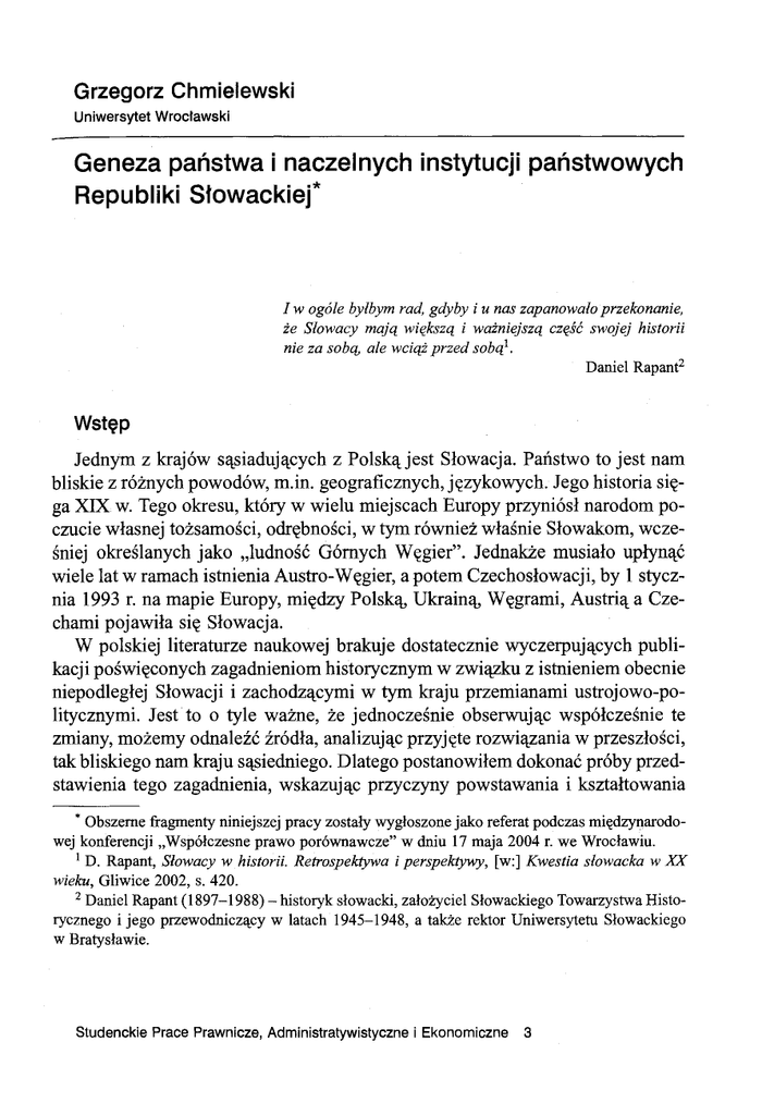 Grzegorz Chmielewski Uniwersytet Wrocławski Geneza państwa i naczelnych instytucji Republiki Słowackiet państwowych rad, gdyby i u nas zapanowało przekonanie, i ważniejszą część swojej historii nie za sobą, ale wciąż przed sobą!. Daniel Rapant2 I w ogóle byłbym że Słowacy mają większą Wstęp Jednym z krajów sąsiadujących z Polską jest Słowacja. Państwo to jest nam bliskie z różnych powodów, m.in. geograficznych, językowych. Jego historia się ga XIX w. Tego okresu, który w wielu miejscach Europy przyniósł narodom poczucie własnej tożsamości, odrębności, w tym również właśnie Słowakom, wcześniej określanych jako "ludność Górnych Węgier". Jednakże musiało upłynąć wiele lat w ramach istnienia Austro-Węgier, a potem Czechosłowacji, by l stycznia 1993 r. na mapie Europy, między Polską, Ukrainą, Węgrami, Austrią a Czechami pojawiła się Słowacja. W polskiej literaturze naukowej brakuje dostatecznie wyczerpujących publikacji poświęconych zagadnieniom historycznym w związku z istnieniem obecnie niepodległej Słowacji i zachodzącymi w tym kraju przemianami ustrojowo-politycznymi. Jest to o tyle ważne, że jednocześnie obserwując współcześnie te zmiany, możemy odnaleźć źródła, analizując przyjęte rozwiązania w przeszłości, tak bliskiego nam kraju sąsiedniego. Dlatego postanowiłem dokonać próby przedstawienia tego zagadnienia, wskazując przyczyny powstawania i kształtowania • Obszerne fragmenty niniejszej pracy zostały wygłoszone jako referat podczas międzynarodo wej konferencji "Współczesne prawo porównawcze" w dniu 17 maja 2004 r. we Wrocławiu. ! D. Rapant, Słowacy w historii. Retrospektywa i perspektywy, [w:] Kwestia słowacka w XX wieku, Gliwice 2002, s. 420. 2 Daniel Rapant (1897-1988) - historyk słowacki, założyciel Słowackiego Towarzystwa Historycznego i jego przewodniczący w latach 1945-1948, a także rektor Uniwersytetu Słowackiego w Bratysławie. Studenckie Prace Prawnicze, Administratywistyczne i Ekonomiczne 3 10 GRZEGORZ CHMIELEWSKI określonych instytucji ustroju politycznego państwa słowackiego. Chcąc przyblioraz fragment historii naszego południowego sąsiada, spróbować uzupełnić tę problematykę tak mało poruszaną w polskiej literaturze. Jednocześnie chcę zaznaczyć, iż celem tej pracy nie jest analiza społeczna czy też ekonomiczna państwa słowackiego, której można poświęcić osobną pracę, lecz ukazanie - z punktu widzenia zainteresowań konstytucyjno-prawnych i prawnoporównawczych - powstawania instytucji państwowych na tle rodzącej się świadomości narodowej i kształtowania się nowego państwa. żyć tę kwestię 1. Narodziny tożsamości Pojęcie Słowacja pojawiło się po raz pierwszy pod koniec XVIII w. Oznaczało obszar między Karpatami, Cisą i Dunajem określany także jako Górne W ęgry3. Przez wieki ludność zamieszkująca te tereny żyła pod panowaniem węgierskim i to zarówno przed, jak i w czasie Cesarstwa Habsburgów. Narodziny nacjonalizmu słowackiego, budzenie się świadomości narodowej były związane właśnie z ruchami separatystyczno-emancypacyjnymi wobec Węgier. Choć tak naprawdę pierwszymi przejawami myśli o zmianach sytuacji polityczno-prawnej były koncepcje idei federacji z Węgrami na prawach równorzędnego podmiotu4 lub bezpośredniej podległości Austrii proponowanej przez niektórych parlamentarzystów5 . Wiek XIX w Europie przyniósł wielu narodom poczucie własnej odrębności. Tak również stało się na Słowacji. Powstanie słowackie oznaczało autonomię wobec innych narodów. Niemal równocześnie pojawiła się idea utworzenia federacji narodu czeskiego i słowackiego w ramach popularnej wówczas koncepcji panslawizmu, pierwszy raz sformułowanej w 1826 r. 6 Wyraźnym dążeniem słowac kiej ludności do niepodległości było utworzenie 16 IX 1848 r. pierwszej reprezentacji narodu - Słowackiej Rady Narodowej, jako kierowniczego organu o charakterze ustawodawczo-wykonawczym, w trakcie słowackiego powstania. Jednakże wraz z jego upadkiem nastąpił kres tej instytucji, która działała krótko, bo w latach 1848-1849. Dopiero wybuch I wojny światowej przyniósł Czechom i Słowakom możliwość wyzwolenia spod austriacko-węgierskiego panowania. 30 V 1917 r. czeski klub parlamentarny ogłosił w parlamencie wiedeńskim proklamację don;lagającą się m.in. utworzenia trzeciego równorzędnego podmiotu w federacji Austro-Węgier, 3 Szerzej na temat początków języka, kultury i oświaty słowackiej w: A. Wolff-Powęska, Oswojona rewolucja, Poznań 1998, s. 228 i n. 4 Por. J. Ciągwa, Słowacka ideologia narodowa na przełomie: Ludovit ŚtUr (1834-1856), praca doktorska niepublikowana, s. 173. 5 Tamże, s. 174. 6 Por. A. Prazak, Kollarova myslenka slovanske wzajemnosti a Slovaci, [w:] Slovanskci vzajemnast, Praha 1938, s. 306 i 328-329. GENEZA PAŃSTWA I NACZELNYCH INSTYTUCJI PAŃSTWOWYCH REPUBLIKI SŁOWACKIEJ 11 który miały utworzyć narody: czeski i słowacki 7 . Wszystkie deklaracje i inne umowy zawarte w tym okresie nie miały wielkiego znaczenia praktycznego, ale waż ne było samo pojawienie się kwestii słowackiej na arenie międzynarodowej. W wyniku tzw. Deklaracji Martińska, proklamowanej przez nowo utworzoną Słowacką Radę Narodową, zostało ogłoszone 30 X 1918 r. formalne wyzwolenie i utworzenie wspólnego państwa federalnego z Czechami 8 . Warto wspomnieć, że już kilkanaście dni wcześniej poseł Ferdynand Juriga wygłosił przemówienie w parlamencie w Budapeszcie, w którym opowiedział się za wystąpieniem Sło wacji z dotychczasowej wspólnoty politycznej9. 13 XI 1918 r. została uchwalona tymczasowa konstytucja, która z braku regulacji co do odrębnych narodowych organów doprowadziła do tego, że ówczesny minister właściwy ds. zarządu Sło wacją, Vavro Srobar lO , rozwiązał z dniem 8 I 1919 r. wszystkie lokalne rady narodowe, rady robotnicze, a tak