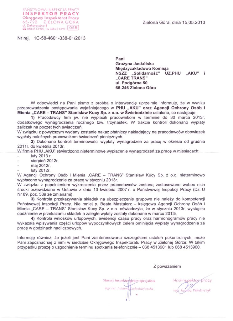 PANSTWQWA NSPEKCJA PRACY INSPEKTOR Okręgowy 65·722 PRACY Inspektorat P-racy ZIELONA GÓRA ul Dekcrccv.no 8 ~ G068tS'3QOC ~ Nr rej. fox0084513911 Zielona Góra, dnia 15.05.2013 1C-58-4601-338-01/2013 Pani Grażyna Jaskólska Międzyzakładowa Komisja NSZZ "Solidarność" UZ,PHU "CARE TRANS" ul. Podgórna 50 65-246 Zielona Góra "AKU" W odpowiedzi na Pani pismo z prośbą o interwencję uprzejmie informuję, że w wyniku przeprowadzenia postępowania wyjaśniającego w PHU "AKU" oraz Agencji Ochrony Osób i Mienia "CARE - TRANS" Stanisław Kucy Sp. z 0.0. w Świebodzinie ustalono, co następuje: 1) Pracodawcy firm jw. nie wypłacili pracownikom w terminie do 30 marca 2013r. dodatkowego wynagrodzenia rocznego tzw. trzynastek. W trakcie kontroli dokonano wypłaty zaliczek na poczet tych świadczeń. W związku z powyższym wydany zostanie nakaz płatniczy nakładający na pracodawców obowiązek wypłaty należnych pracownikom świadczeń pieniężnych. 2) Dokonano kontroli terminowości wypłaty wynagrodzeń za pracę w okresie od grudnia 2011 r. do kwietnia 2013r. W firmie PHU .,AKU" stwierdzono nieterminowe wypłacenie wynagrodzeń za pracę w miesiącach: luty 2013 r. sierpień 2012r. maj 2012r. luty 2012r. W Agencji Ochrony Osób i Mienia "CARE - TRANS" Stanisław Kucy Sp. z 0.0. nieterminowo wypłacono wynagrodzenie za pracę w styczniu 2013r. W związku z popełnieniem wykroczenia przez pracodawców zostaną zastosowane wobec nich środki przewidziane w Ustawie z dnia 13 kwietnia 2007 r. o Państwowej Inspekcji Pracy (Dz. U Nr 89, poz. 589 ze zmianami). 3) Kontrola przekazywania składek na ubezpieczenie grupowe nie należy do kompetencji Państwowej Inspekcji Pracy. Nie mniej p. Beata Mastalerz - księgowa Agencji Ochrony Osób i Mienia "CARE - TRANS" Stanisław Kucy Sp. z 0.0. oświadczyła, że w styczniu 2013r. wystąpiło opóźnienie w przekazaniu składek a zaległe wpłaty zostały dokonane w marcu 2013r. 4) Kontrola wniosków urlopowych, ewidencji czasu pracy oraz harmonogramów pracy nie wykazała wpisywania części urlopów wypoczynkowych celem ominięcia wypłaty wynagrodzenia za pracę w godzinach nadliczbowych. Informuję również, że jeżeli jest Pani zainteresowana szczegółami ustaleń pokontrolnych, może Pani zapoznać się z nimi w siedzibie Okręgowego Inspektoratu Pracy w Zielonej Górze. W takim przypadku proszę o uzgodnienie terminu spotkania telefonicznie - 068 4513901 lub 068 4513900. Z poważaniem tar<iZ) m r in 1Tl.. ! - pecjali hl