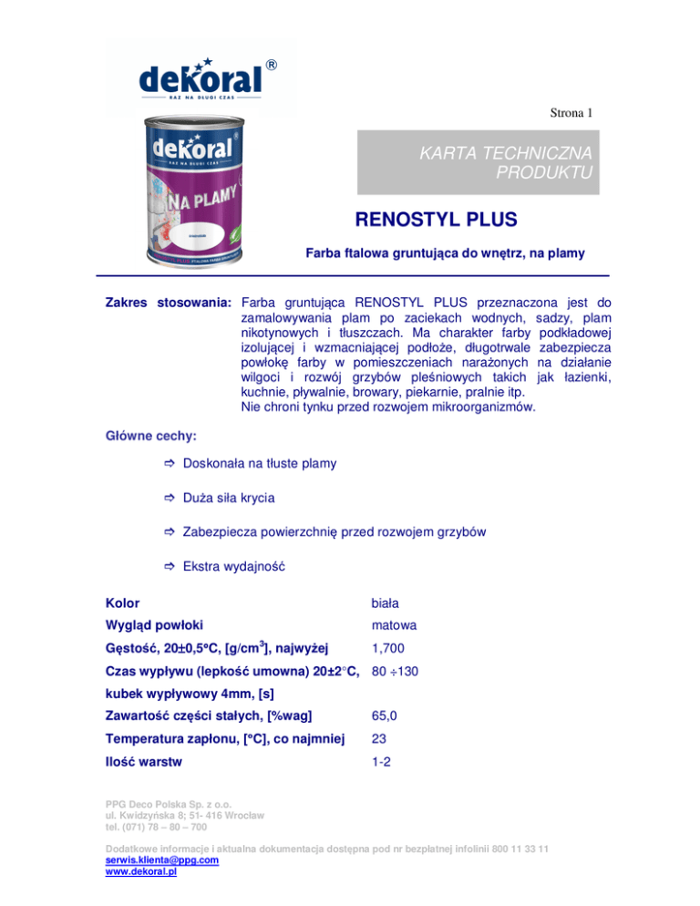 Strona 1 KARTA TECHNICZNA PRODUKTU RENOSTYL PLUS Farba ftalowa gruntująca do wnętrz, na plamy Zakres stosowania: Farba gruntująca RENOSTYL PLUS przeznaczona jest do zamalowywania plam po zaciekach wodnych, sadzy, plam nikotynowych i tłuszczach. Ma charakter farby podkładowej izolującej i wzmacniającej podłoże, długotrwale zabezpiecza powłokę farby w pomieszczeniach narażonych na działanie wilgoci i rozwój grzybów pleśniowych takich jak łazienki, kuchnie, pływalnie, browary, piekarnie, pralnie itp. Nie chroni tynku przed rozwojem mikroorganizmów. Główne cechy: Doskonała na tłuste plamy Duża siła krycia Zabezpiecza powierzchnię przed rozwojem grzybów Ekstra wydajność Kolor biała Wygląd powłoki matowa Gęstość, 20± ±0,5°°C, [g/cm3], najwyżej 1,700 Czas wypływu (lepkość umowna) 20±2°C, 80 ÷130 kubek wypływowy 4mm, [s] Zawartość części stałych, [%wag] 65,0 Temperatura zapłonu, [°°C], co najmniej 23 Ilość warstw 1-2 PPG Deco Polska Sp. z o.o. ul. Kwidzyńska 8; 51- 416 Wrocław tel. (071) 78 – 80 – 700 Dodatkowe informacje i aktualna dokumentacja dostępna pod nr bezpłatnej infolinii 800 11 33 11 [email protected] www.dekoral.pl Strona 2 Czas schnięcia powłoki, 23°°±2°°C, [h] 6 Nanoszenie drugiej warstwy, [h] po 6 Sposób nanoszenia pędzel, wałek lub natrysk Wydajność przy jednej warstwie Do 12 m2 z 1 litra wyrobu przy jednokrotnym nanoszeniu w zależności od chłonności podłoża Rozcieńczalnik Do wyrobów stosowania ftalowych ogólnego Sposób użycia 1.Przygotowanie podłoża • Powierzchnia przeznaczona do malowania powinna być czysta, sucha, odpylona, bez spękań. • Usuń stare, łuszczące się powłoki. Dobrze związane farby emulsyjne i olejne nie wymagają usunięcia. • Powierzchnie zagrzybione oczyść wodnym roztworem środka dezynfekującego przy użyciu szczotki. • Ewentualne ubytki lub spękania podłoża uzupełnij odpowiednią zaprawą. • Powierzchnie pomalowane farbami emulsyjnymi odtłuść poprzez umycie wodą z dodatkiem środków myjących. 2. Malowanie • Świeże tynki maluj po 3-4 tygodniach od ich nałożenia. • Przed użyciem wyrób dokładnie wymieszaj. • W razie potrzeby rozcieńcz rozcieńczalnikiem w ilości max. 2% obj. • Drugą warstwę nakładaj po wyschnięciu pierwszej, farbą gotową (nie rozcieńczoną). • Farbę nawierzchniową nakładaj, po co najmniej 6h od nałożenia ostatniej warstwy Renostyl Plus. • Po zakończeniu malowania narzędzia umyj rozcieńczalnikiem. • W czasie prac malarskich i po ich zakończeniu pomieszczenia przed użytkowaniem wywietrz do zaniku charakterystycznego zapachu. 3. Dodatkowe informacje • Ze względu na modyfikację produktu nie mieszaj Renostylu Plus z Renostylem. • Maluj w temperaturze od +5° do 30°C. • Niska temperatura otoczenia i wysoka wilgotność wydłuża czas schnięcia. • Przechowuj w opakowaniach szczelnie zamkniętych. PPG Deco Polska Sp. z o.o. ul. Kwidzyńska 8; 51- 416 Wrocław tel. (071) 78 – 80 – 700 Dodatkowe informacje i aktualna dokumentacja dostępna pod nr bezpłatnej infolinii 800 11 33 11 [email protected] www.dekoral.pl Strona 3 4. Wskazówki BHP i PPOŻ • Produkt łatwo palny. • Działa szkodliwie na organizmy wodne; może powodować długo utrzymujące się niekorzystne zmiany w środowisku wodnym. • Chronić przed dziećmi. • Nie wdychać rozpylonej cieczy. • Nie wprowadzać do kanalizacji. • W przypadku niedostatecznej wentylacji stosować odpowiednie środki ochrony dróg oddechowych. • W razie połknięcia niezwłocznie zasięgnij porady lekarza - pokaż opakowanie lub etykietę. • Stosować się do zaleceń podanych na opakowaniu. • Szczegółowe informacje zamieszczone są w Karcie Charakterystyki. Norma: ZN-PPGDP-178 Atesty: Posiada Atest Higieniczny PZH zgodna z PN-C-81901 rodzaj IB PKWiU: 20.30.12.0 Data ważności: 36 miesięcy od daty produkcji Limit zawartości LZO wg Dyrektywy 2004/42/WE dla tego produktu: (kat. A/g/FR): 350 g/l (2010). Produkt zawiera max. 350 g/l. Nowa receptura spełniająca wymagania Dyrektywy UE ograniczającej zawartość lotnych związków organicznych. Opakowanie handlowe: 0,5L; 1,0L PPG Deco Polska Sp. z o.o. ul. Kwidzyńska 8; 51- 416 Wrocław tel. (071) 78 – 80 – 700 Dodatkowe informacje i aktualna dokumentacja dostępna pod nr bezpłatnej infolinii 800 11 33 11 [email protected] www.dekoral.pl