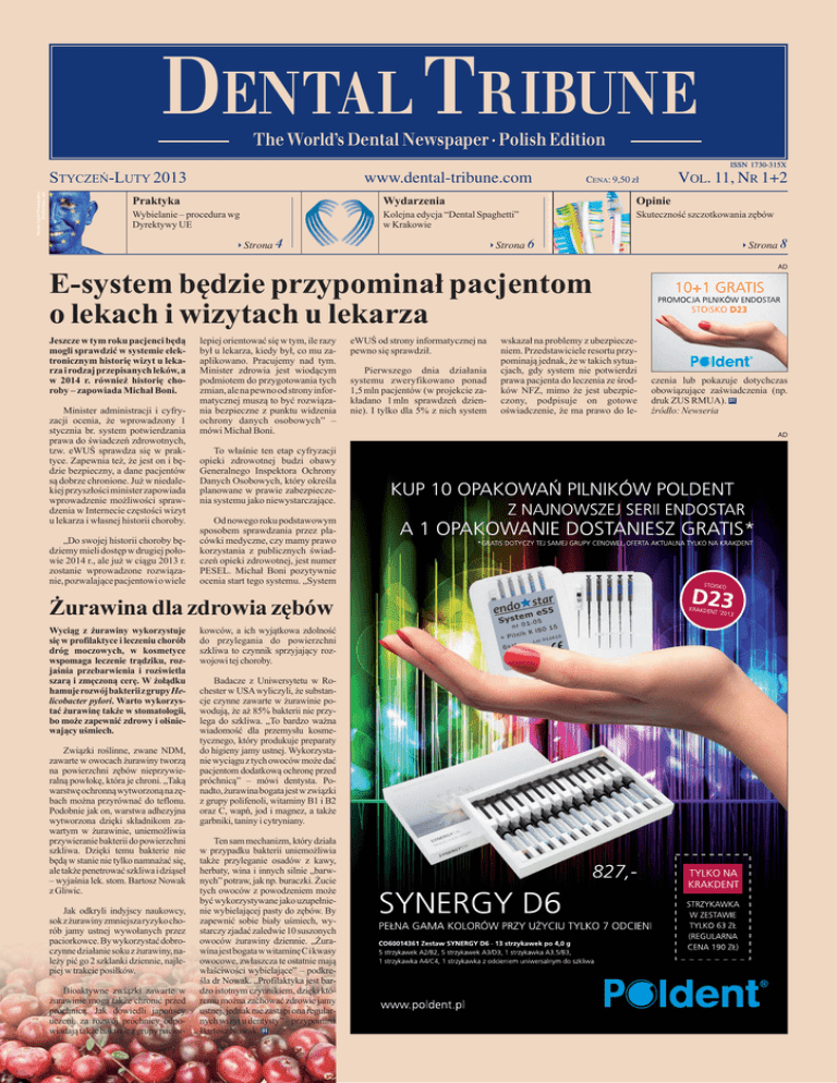 1 News DENTAL TRIBUNE DENTAL TRIBUNE Polish Edition The World’s Dental Newspaper · Polish Edition ISSN 1730-315X www.dental-tribune.com Praktyka Wydarzenia Wybielanie – procedura wg Dyrektywy UE Kolejna edycja “Dental Spaghetti” w Krakowie Strona 4 Strona 6 Opinie Skuteczność szczotkowania zębów E-system będzie przypominał pacjentom o lekach i wizytach u lekarza Jeszcze w tym roku pacjenci będą mogli sprawdzić w systemie elektronicznym historię wizyt u lekarza i rodzaj przepisanych leków, a w 2014 r. również historię choroby – zapowiada Michał Boni. Minister administracji i cyfryzacji ocenia, że wprowadzony 1 stycznia br. system potwierdzania prawa do świadczeń zdrowotnych, tzw. eWUŚ sprawdza się w praktyce. Zapewnia też, że jest on i będzie bezpieczny, a dane pacjentów są dobrze chronione. Już w niedalekiej przyszłości minister zapowiada wprowadzenie możliwości sprawdzenia w Internecie częstości wizyt u lekarza i własnej historii choroby. „Do swojej historii choroby będziemy mieli dostęp w drugiej połowie 2014 r., ale już w ciągu 2013 r. zostanie wprowadzone rozwiązanie, pozwalające pacjentowi o wiele lepiej orientować się w tym, ile razy był u lekarza, kiedy był, co mu zaaplikowano. Pracujemy nad tym. Minister zdrowia jest wiodącym podmiotem do przygotowania tych zmian, ale na pewno od strony informatycznej muszą to być rozwiązania bezpieczne z punktu widzenia ochrony danych osobowych” – mówi Michał Boni. To właśnie ten etap cyfryzacji opieki zdrowotnej budzi obawy Generalnego Inspektora Ochrony Danych Osobowych, który określa planowane w prawie zabezpieczenia systemu jako niewystarczające. Od nowego roku podstawowym sposobem sprawdzania przez placówki medyczne, czy mamy prawo korzystania z publicznych świadczeń opieki zdrowotnej, jest numer PESEL. Michał Boni pozytywnie ocenia start tego systemu. „System Żurawina dla zdrowia zębów Wyciąg z żurawiny wykorzystuje się w profilaktyce i leczeniu chorób dróg moczowych, w kosmetyce wspomaga leczenie trądziku, rozjaśnia przebarwienia i rozświetla szarą i zmęczoną cerę. W żołądku hamuje rozwój bakterii z grupy Helicobacter pylori. Warto wykorzystać żurawinę także w stomatologii, bo może zapewnić zdrowy i olśniewający uśmiech. Związki roślinne, zwane NDM, zawarte w owocach żurawiny tworzą na powierzchni zębów nieprzywieralną powłokę, która je chroni. „Taką warstwę ochronną wytworzoną na zębach można przyrównać do teflonu. Podobnie jak on, warstwa adhezyjna wytworzona dzięki składnikom zawartym w żurawinie, uniemożliwia przywieranie bakterii do powierzchni szkliwa. Dzięki temu bakterie nie będą w stanie nie tylko namnażać się, ale także penetrować szkliwa i dziąseł – wyjaśnia lek. stom. Bartosz Nowak z Gliwic. Jak odkryli indyjscy naukowcy, sok z żurawiny zmniejsza ryzyko chorób jamy ustnej wywołanych przez paciorkowce. By wykorzystać dobroczynne działanie soku z żurawiny, należy pić go 2 szklanki dziennie, najlepiej w trakcie posiłków. Bioaktywne związki zawarte w żurawinie mogą także chronić przed próchnicą. Jak dowiedli japońscy uczeni, za rozwój próchnicy odpowiadają także bakterie z grupy pacior- kowców, a ich wyjątkowa zdolność do przylegania do powierzchni szkliwa to czynnik sprzyjający rozwojowi tej choroby. Badacze z Uniwersytetu w Rochester w USA wyliczyli, że substancje czynne zawarte w żurawinie powodują, że aż 85% bakterii nie przylega do szkliwa. „To bardzo ważna wiadomość dla przemysłu kosmetycznego, który produkuje preparaty do higieny jamy ustnej. Wykorzystanie wyciągu z tych owoców może dać pacjentom dodatkową ochronę przed próchnicą” – mówi dentysta. Ponadto, żurawina bogata jest w związki z grupy polifenoli, witaminy B1 i B2 oraz C, wapń, jod i magnez, a także garbniki, taniny i cytryniany. Ten sam mechanizm, który działa w przypadku bakterii uniemożliwia także przyleganie osadów z kawy, herbaty, wina i innych silnie „barwnych” potraw, jak np. buraczki. Żucie tych owoców z powodzeniem może być wykorzystywane jako uzupełnienie wybielającej pasty do zębów. By zapewnić sobie biały uśmiech, wystarczy zjadać zaledwie 10 suszonych owoców żurawiny dziennie. „Żurawina jest bogata w witaminę C i kwasy owocowe, zwłaszcza te ostatnie mają właściwości wybielające” – podkreśla dr Nowak. „Profilaktyka jest bardzo istotnym czynnikiem, dzięki któremu można zachować zdrowie jamy ustnej, jednak nie zastąpi ona regularnych wizyt u dentysty” – przypomina Bartosz Nowak. DT eWUŚ od strony informatycznej na pewno się sprawdził. Pierwszego dnia działania systemu zweryfikowano ponad 1,5 mln pacjentów (w projekcie zakładano 1 mln sprawdzeń dziennie). I tylko dla 5% z nich system VOL. 11, NR 1+2 CENA: 9,50 zł Evgeny Karandaev/Shutterstock.com Ramon Espelt Photography/ Shutterstock.com STYCZEŃ-LUTY 2013 wskazał na problemy z ubezpieczeniem. Przedstawiciele resortu przypominają jednak, że w takich sytuacjach, gdy system nie potwierdzi prawa pacjenta do leczenia ze środków NFZ, mimo że jest ubezpieczony, podpisuje on gotowe oświadczenie, że ma prawo do le- Strona 8 AD czenia lub pokazuje dotychczas obowiązujące zaświadczenia (np. druk ZUS RMUA). DT źródło: Newseria AD 2 DENTAL TRIBUNE News Polish Edition Zły stan zdrowia jamy ustnej sprzyja chorobom układu oddechowego Zły stan zdrowia jamy ustnej lekarze zwykle wiązali z ogólnym stanem zdrowia pacjenta. Jak dowodzą jednak ostatnie badania, bakterie rozwijające się w jamie ustnej podnoszą ryzyko zachorowania na zapalenie płuc. Niskie temperatury, a także słota i silne wiatry sprzyjają infekcjom zarówno górnych, jak i dolnych dróg oddechowych. Ale nie tylko aura ma wpływ na ryzyko zachorowania. Jak dowodzą naukowcy w swoich badaniach, na to ryzyko ma wpływ także stan zdrowia uzębienia. Autor tych badań, dr Samit Joshi z