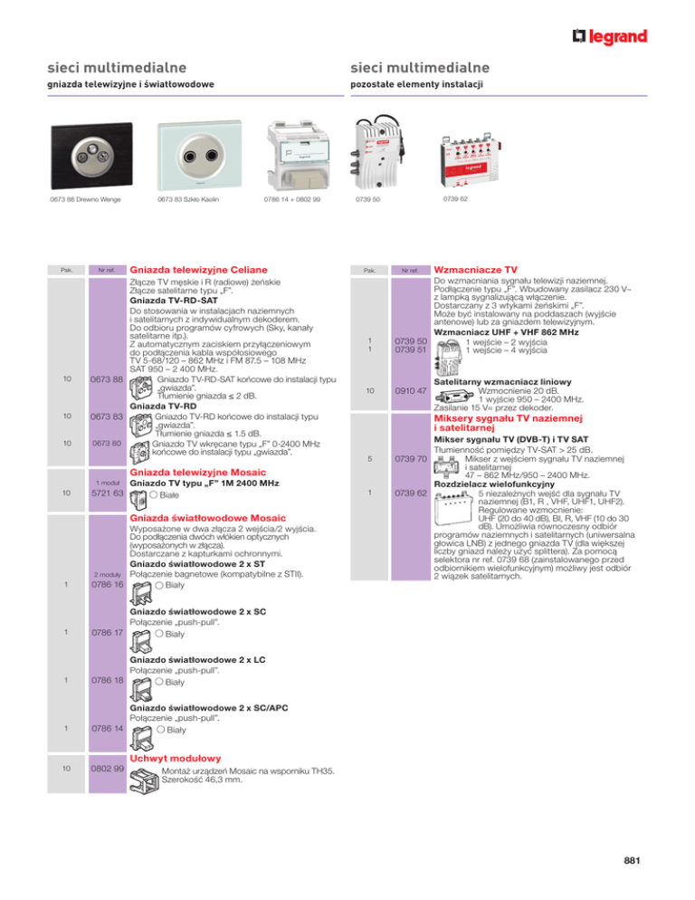 sieci multimedialne sieci multimedialne gniazda telewizyjne i światłowodowe pozostałe elementy instalacji 0673 88 Drewno Wenge Pak. 10 10 10 Nr ref. 0673 83 Szkło Kaolin 0786 14 + 0802 99 Gniazda telewizyjne Celiane Złącze TV męskie i R (radiowe) żeńskie Złącze satelitarne typu „F”. Gniazda TV-RD-SAT Do stosowania w instalacjach naziemnych i satelitarnych z indywidualnym dekoderem. Do odbioru programów cyfrowych (Sky, kanały satelitarne itp.). Z automatycznym zaciskiem przyłączeniowym do podłączenia kabla współosiowego TV 5-68/120 – 862 MHz i FM 87.5 – 108 MHz SAT 950 – 2 400 MHz. 0673 88 Gniazdo TV-RD-SAT końcowe do instalacji typu „gwiazda”. Tłumienie gniazda ≤ 2 dB. Gniazda TV-RD 0673 83 Gniazdo TV-RD końcowe do instalacji typu „gwiazda”. Tłumienie gniazda ≤ 1.5 dB. 0673 80 Gniazdo TV wkręcane typu „F” 0-2400 MHz końcowe do instalacji typu „gwiazda”. Pak. 10 5721 63 Gniazdo TV typu „F” 1M 2400 MHz Białe Gniazda światłowodowe Mosaic 1 yposażone w dwa złącza 2 wejścia/2 wyjścia. W Do podłączenia dwóch włókien optycznych (wyposażonych w złącza). Dostarczane z kapturkami ochronnymi. Gniazdo światłowodowe 2 x ST 2 moduły Połączenie bagnetowe (kompatybilne z STII). 0786 16 Biały 1 Gniazdo światłowodowe 2 x SC Połączenie „push-pull”. 0786 17 Biały 1 Gniazdo światłowodowe 2 x LC Połączenie „push-pull”. 0786 18 Biały 1 Gniazdo światłowodowe 2 x SC/APC Połączenie „push-pull”. 0786 14 Biały 10 0802 99 Nr ref. Wzmacniacze TV 1 1 Do wzmacniania sygnału telewizji naziemnej. Podłączenie typu „F”. Wbudowany zasilacz 230 V~ z lampką sygnalizującą włączenie. Dostarczany z 3 wtykami żeńskimi „F”. Może być instalowany na poddaszach (wyjście antenowe) lub za gniazdem telewizyjnym. Wzmacniacz UHF + VHF 862 MHz 0739 50 1 wejście – 2 wyjścia 0739 51 1 wejście – 4 wyjścia 10 0910 47 Satelitarny wzmacniacz liniowy Wzmocnienie 20 dB. 1 wyjście 950 – 2400 MHz. Zasilanie 15 V= przez dekoder. Miksery sygnału TV naziemnej i satelitarnej 5 Gniazda telewizyjne Mosaic 1 moduł 0739 62 0739 50 1 Mikser sygnału TV (DVB-T) i TV SAT Tłumienność pomiędzy TV-SAT > 25 dB. 0739 70 Mikser z wejściem sygnału TV naziemnej i satelitarnej 47 – 862 MHz/950 – 2400 MHz. Rozdzielacz wielofunkcyjny 0739 62 5 niezależnych wejść dla sygnału TV naziemnej (B1, R , VHF, UHF1, UHF2). Regulowane wzmocnienie: UHF (20 do 40 dB), BI, R, VHF (10 do 30 dB). Umożliwia równoczesny odbiór programów naziemnych i satelitarnych (uniwersalna głowica LNB) z jednego gniazda TV (dla większej liczby gniazd należy użyć splittera). Za pomocą selektora nr ref. 0739 68 (zainstalowanego przed odbiornikiem wielofunkcyjnym) możliwy jest odbiór 2 wiązek satelitarnych. Uchwyt modułowy Montaż urządzeń Mosaic na wsporniku TH35. Szerokość 46,3 mm. 881