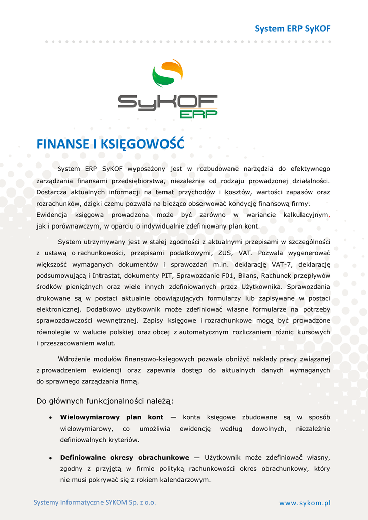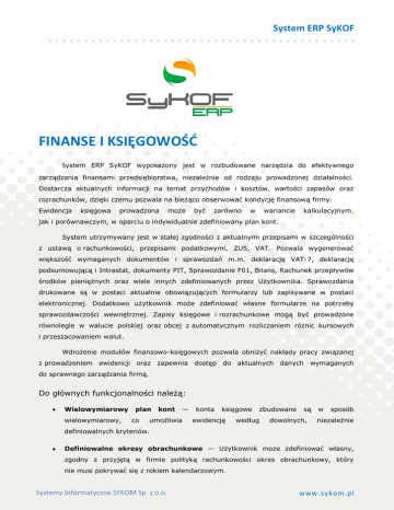 System ERP SyKOF FINANSE I KSIĘGOWOŚĆ System ERP SyKOF wyposażony jest w rozbudowane narzędzia do efektywnego zarządzania finansami przedsiębiorstwa, niezależnie od rodzaju prowadzonej działalności. Dostarcza aktualnych informacji na temat przychodów i kosztów, wartości zapasów oraz rozrachunków, dzięki czemu pozwala na bieżąco obserwować kondycję finansową firmy. Ewidencja księgowa prowadzona może być zarówno w wariancie kalkulacyjnym, jak i porównawczym, w oparciu o indywidualnie zdefiniowany plan kont. System utrzymywany jest w stałej zgodności z aktualnymi przepisami w szczególności z ustawą o rachunkowości, przepisami podatkowymi, ZUS, VAT. Pozwala wygenerować większość wymaganych dokumentów i sprawozdań m.in. deklarację VAT-7, deklarację podsumowującą i Intrastat, dokumenty PIT, Sprawozdanie F01, Bilans, Rachunek przepływów środków pieniężnych oraz wiele innych zdefiniowanych przez Użytkownika. Sprawozdania drukowane są w postaci aktualnie obowiązujących formularzy lub zapisywane w postaci elektronicznej. Dodatkowo użytkownik może zdefiniować własne formularze na potrzeby sprawozdawczości wewnętrznej. Zapisy księgowe i rozrachunkowe mogą być prowadzone równolegle w walucie polskiej oraz obcej z automatycznym rozliczaniem różnic kursowych i przeszacowaniem walut. Wdrożenie modułów finansowo-księgowych pozwala obniżyć nakłady pracy związanej z prowadzeniem ewidencji oraz zapewnia dostęp do aktualnych danych wymaganych do sprawnego zarządzania firmą. Do głównych funkcjonalności należą: Wielowymiarowy wielowymiarowy, plan co kont — umożliwia konta księgowe ewidencję zbudowane według są dowolnych, w sposób niezależnie definiowalnych kryteriów. Definiowalne okresy obrachunkowe — Użytkownik może zdefiniować własny, zgodny z przyjętą w firmie polityką rachunkowości okres obrachunkowy, który nie musi pokrywać się z rokiem kalendarzowym. Systemy Informatyczne SYKOM Sp. z o.o. www.sykom.pl System ERP SyKOF – FINANSE I KSIĘGOWOŚĆ Wspólne analityki — wartości poszczególnych analityk są definiowalne w jednym miejscu i wspólne dla wielu kont i modułów systemu. Słowniki kontrahentów i pracowników są wspólne dla wszystkich modułów systemu. Praca w kliku miesiącach — Użytkownik sam decyduje kiedy ostatecznie księguje dokumenty i zamyka poprzednie okresy obrachunkowe. System umożliwia równoległą pracę na przełomie miesięcy i lat zapewniając dostęp do aktualnych sald bez potrzeby zamykania poprzednich okresów. Automatyczne dekrety — automatyczne tworzenie zapisów księgowych do dokumentów generowanych lub wprowadzanych w poszczególnych modułach systemu. Każdy dokument wpływający na księgi rachunkowe jest natychmiast widoczny na kontach księgowych. Służby księgowe mogą zatwierdzić powstały dekret lub go zmodyfikować. Rejestry VAT — rejestry i deklaracja VAT-7 tworzone są na podstawie dokumentów przypisanych do miesiąca VAT, niezależnie od miesiąca księgowego, do którego wprowadzono dokument. Wielowalutowość — każdy dokument lub dekret może zostać zarejestrowany równolegle w walucie polskiej i obcej. W trakcie wprowadzania dokumentu Użytkownik ma dostęp do tabel kursów walut, które mogą być automatycznie importowane do systemu z danych udostępnianych przez banki. System automatycznie rozlicza różnice kursowe, tworzy dekrety z przeszacowania walut, wycenia rozchody walut z rachunków bankowych i kas. Wydruki z kont księgowych oraz rozrachunków można tworzyć zarówno w walucie polskiej, jak i walutach obcych. Automatyczne RMK — wprowadzając zapis na rozliczenia międzyokresowe kosztów Użytkownik może określić kiedy, jaka kwota, w jakie koszty ma zostać zadekretowana. W zadanym czasie system wykona zaplanowane księgowania. Systemy Informatyczne SYKOM Sp. z o.o. www.sykom.pl System ERP SyKOF –FINANSE I KSIĘGOWOŚĆ Rozliczanie kosztów — scenariusze rozliczania kosztów są definiowane przez Użytkownika. Podstawą rozliczeń mogą być dane zgromadzone w różnych modułach systemu, np. rozliczenie kosztów bazy sprzętowo-transportowej na podstawie kart pracy maszyn, rozliczenie kosztów zakupu materiałów masowych według ilości wydanych z magazynu, rozliczenie kosztów wydziałowych według godzin pracy, itd. W wybranym czasie wystarczy uruchomić wybrany scenariusz, a system wykona wszystkie potrzebne przeksięgowania. Obsługa kasy — wystawiane dokumenty KP i KW są automatycznie dekretowane i uwzględniane w kartotekach rozrachunków. Rejestrując dokument Użytkownik ma dostęp do aktualnych sald kont księgowych i rozrachunkowych. Dokumenty kasowe mogą być wystawiane na podstawie dyspozycji przyjęć lub wypłat gotówki generowanych z innych modułów systemu. Na podstawie zarejestrowanych dokumentów system generuje raporty kasowe dzienne lub za wybrany okres. Ewidencję kasową prowadzić można w dowolnej walucie. Przelewy i wyciągi bankowe — w systemie można tworzyć przelewy dla pracowników, kontrahentów lub urzędów. Przygotowane przelewy eksportowane są do programów bankowych. Wyeksportowany przelew jest natychmiast widoczny w rozrachunkach jako wysłana płatność. Wyciągi bankowe można importować z programów bankowych. Wówczas większość operacji zostaje automatycznie zadekretowana na konta księgowe. Kartoteka rozrachunków — na podstawie wystawianych dokumentów sprzedaży, rejestrowanych dokumentów zakupu, przelewów, dokumentów kasowych oraz wyciągów bankowych tworzona jest kartoteka rozrachunków. Widnieją w niej zawsze aktualne dane o należnościach i zobowiązaniach firmy. System umożliwia wszechstronną analizę zarówno kwot przeterminowanych, jak i będących jeszcze przed terminem wymagalności. Z poziomu kartoteki rozrachunków wygenerować można m.in. takie dokumenty jak noty odsetkowe, przypomnienia i wezwania do zapłaty, potwierdzenia sald, k
