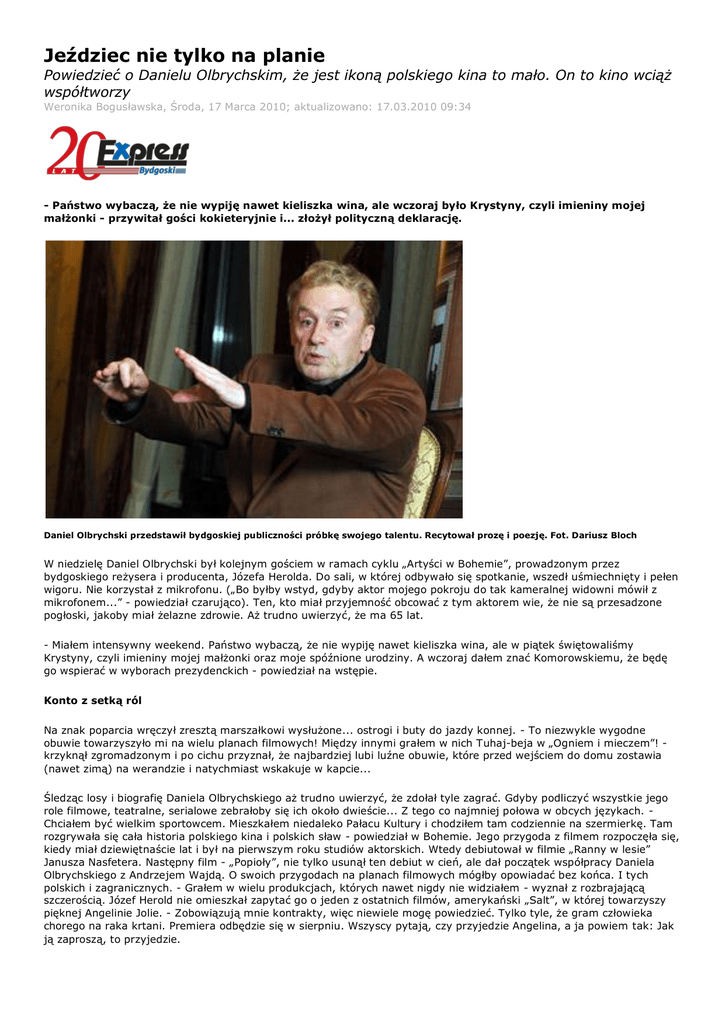 Jeździec nie tylko na planie Powiedzieć o Danielu Olbrychskim, że jest ikoną polskiego kina to mało. On to kino wciąż współtworzy Weronika Bogusławska, Środa, 17 Marca 2010; aktualizowano: 17.03.2010 09:34 - Państwo wybaczą, że nie wypiję nawet kieliszka wina, ale wczoraj było Krystyny, czyli imieniny mojej małżonki - przywitał gości kokieteryjnie i... złożył polityczną deklarację. Daniel Olbrychski przedstawił bydgoskiej publiczności próbkę swojego talentu. Recytował prozę i poezję. Fot. Dariusz Bloch W niedzielę Daniel Olbrychski był kolejnym gościem w ramach cyklu „Artyści w Bohemie”, prowadzonym przez bydgoskiego reżysera i producenta, Józefa Herolda. Do sali, w której odbywało się spotkanie, wszedł uśmiechnięty i pełen wigoru. Nie korzystał z mikrofonu. („Bo byłby wstyd, gdyby aktor mojego pokroju do tak kameralnej widowni mówił z mikrofonem...” - powiedział czarująco). Ten, kto miał przyjemność obcować z tym aktorem wie, że nie są przesadzone pogłoski, jakoby miał żelazne zdrowie. Aż trudno uwierzyć, że ma 65 lat. - Miałem intensywny weekend. Państwo wybaczą, że nie wypiję nawet kieliszka wina, ale w piątek świętowaliśmy Krystyny, czyli imieniny mojej małżonki oraz moje spóźnione urodziny. A wczoraj dałem znać Komorowskiemu, że będę go wspierać w wyborach prezydenckich - powiedział na wstępie. Konto z setką ról Na znak poparcia wręczył zresztą marszałkowi wysłużone... ostrogi i buty do jazdy konnej. - To niezwykle wygodne obuwie towarzyszyło mi na wielu planach filmowych! Między innymi grałem w nich Tuhaj-beja w „Ogniem i mieczem”! krzyknął zgromadzonym i po cichu przyznał, że najbardziej lubi luźne obuwie, które przed wejściem do domu zostawia (nawet zimą) na werandzie i natychmiast wskakuje w kapcie... Śledząc losy i biografię Daniela Olbrychskiego aż trudno uwierzyć, że zdołał tyle zagrać. Gdyby podliczyć wszystkie jego role filmowe, teatralne, serialowe zebrałoby się ich około dwieście... Z tego co najmniej połowa w obcych językach. Chciałem być wielkim sportowcem. Mieszkałem niedaleko Pałacu Kultury i chodziłem tam codziennie na szermierkę. Tam rozgrywała się cała historia polskiego kina i polskich sław - powiedział w Bohemie. Jego przygoda z filmem rozpoczęła się, kiedy miał dziewiętnaście lat i był na pierwszym roku studiów aktorskich. Wtedy debiutował w filmie „Ranny w lesie” Janusza Nasfetera. Następny film - „Popioły”, nie tylko usunął ten debiut w cień, ale dał początek współpracy Daniela Olbrychskiego z Andrzejem Wajdą. O swoich przygodach na planach filmowych mógłby opowiadać bez końca. I tych polskich i zagranicznych. - Grałem w wielu produkcjach, których nawet nigdy nie widziałem - wyznał z rozbrajającą szczerością. Józef Herold nie omieszkał zapytać go o jeden z ostatnich filmów, amerykański „Salt”, w której towarzyszy pięknej Angelinie Jolie. - Zobowiązują mnie kontrakty, więc niewiele mogę powiedzieć. Tylko tyle, że gram człowieka chorego na raka krtani. Premiera odbędzie się w sierpniu. Wszyscy pytają, czy przyjedzie Angelina, a ja powiem tak: Jak ją zaproszą, to przyjedzie. Plastyczna twarz Mówi, że gdyby chciał, mógłby zostać reżyserem... - Podobno mam do tego dryg. Tylko czasu mi szkoda, bo musiałbym poświęcić na to dwa lata swojego życia - tłumaczy. Niedługo zagra Piłsudskiego w najnowszym filmie Jerzego Hoffmana. Trzeba mi tylko zrobić krzaczaste brwi, bardziej zamaszysty nos, zlikwidować dołek w brodzie i dorobić wąsy. Kolor oczu podobno jest w porządku, tylko powinny być trochę szerzej rozstawione, ale to naprawdę niewiele. Mam bard zo plastyczną twarz - przekonuje. Wie, że znany jest ze swojej sympatii do Rosjan i wspomina rozmowę z Gorbaczowem. Zdębiałem, jak do mnie zadzwonił w latach dziewięćdziesiątych. Powiedziałem, że Polacy są wdzięczni za to, że doprowadził do obrad Okrągłego Stołu i popełniłem okropną gafę. Zapytałem go, „a jak się ma pańska czarująca żona”. Na co odpowiedział „Dziękuję, stale nieżywa”. Było mi wstyd, bo wiem, jak bardzo przeżył tą śmierć - wspomina. Wojewódzki to gwiazda Opowiedział również o tym, jak przestał palić i pić. - Problemów z alkoholem nigdy nie miałem, bo dwieście pięćdziesiąt dni w roku jestem „w siodle”, a konie nie lubią zapachu alkoholu. Jednak kiedy odszedł Jan Paweł II na znak mojej żałoby przestałem pić w ogóle na dwa i pół roku - mówi. Papierosów nie pali do dziś, a jeśli wymaga tego rola, to sięga po tego w wersji „e”. Tak robi na przykład podczas przedstawienia „Zagraj to jeszcze raz, Sam” Woody’ego Allena, które niedawno wystawił Teatr 6 piętro Michała Żebrowskiego i Eugeniusza Korina w Pałacu Kultury i Nauki. Na planie towarzyszy mu Kuba Wojewódzki, o którym Daniel Olbrychski wypowiada się w samych superlatywach. - Mógł się nie sprawdzić. Mógł na przykład być niesłyszalny. Ale udowodnił, że posiada cechy prawdziwej gwiazdy. Czyli talent, osobowość, pracowitość i pokorę. Bydgoskiej publiczności prezentował również swoją biografię „Parę lat z głowy” i z właściwym dla siebie humorem wyjaśnił, dlaczego ją napisał. - Doskonale oddaje to jeden z moich ulubionych kawałów. Niewidomego jeźdźca konnego zapytano, czy weźmie udział w niezwykle trudnym wyścigu. Po czym on zastanowił się chwilę i powiedział. „Nie widzę przeszkód”. Nie wszyscy pamiętają, że wielki aktor ma w swoim życiorysie bydgoski rys. Pierwszy raz przyjechał do naszego miasta na słynną mszę 3 maja w 1981 roku, drugi raz w 1986 roku podczas kręcenia sceny do filmu „Bokser” w Hali Astoria.