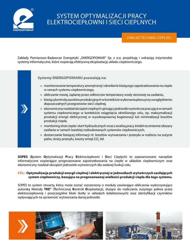 SYSTEM OPTYMALIZACJI PRACY ELEKTROCIEPŁOWNI I SIECI CIEPLNYCH ZAKŁAD TECHNIKI CIEPLNEJ Zakłady Pomiarowo-Badawcze Energetyki „ENERGOPOMIAR” Sp. z o.o. projektują i wdrażają inżynierskie systemy informatyczne, które wspierają efektywną eksploatację układu ciepłowniczego. Systemy ENERGOPOMIARU pozwalają na: »» monitorowanie temperatury zewnętrznej i określanie bieżącego zapotrzebowania na ciepło w ramach systemu ciepłowniczego, »» obliczanie nowej, żądanej przez odbiorców temperatury wody sieciowej na zasilaniu, »» bieżącą kontrolę zasobów produkcyjnych w kontekście wykonania planu przy uwzględnieniu dopuszczalnych przegrzewów sieci cieplnej, »» ekonomiczny rozdział obciążeń cieplnych ujmujący jednostki wytwórcze pracujące w ramach systemu ciepłowniczego w kontekście osiągnięcia określonego celu, np. maksymalizacji produkcji energii elektrycznej w wysokosprawnej kogeneracji lub minimalizacji kosztów produkcji ciepła, »» monitoring strat ciepła i start hydraulicznych wraz z analizą pracy źródeł na zmienne obszary zasilania w ramach bardziej rozbudowanych systemów ciepłowniczych, »» dostarczanie bieżącej informacji nt. kosztów wytwarzania i przesyłu w rozbiciu na zużycie paliw, straty przesyłu, koszty emisji CO2 itd. SOPES (System Optymalizacji Pracy Elektrociepłowni i Sieci Cieplych) to zaawansowane narzędzie informatyczne wspierające prognozowanie zapotrzebowania na ciepło w układzie ciepłowniczym oraz ekonomiczny rozdział obciążeń jednostek wytwórczych dla zadanej funkcji celu. CE L : Optymalizacja produkcji energii cieplnej i elektrycznej w jednostkach wytwórczych zasilających system ciepłowniczy, bazująca na prognozowanej wielkości produkcji ciepła dla tego systemu. SOPES to system otwarty, który może zostać rozszerzony o moduły zawierające obliczenia wykorzystujące autorską Metodę TKE® (Technicznej Kontroli Eksploatacji), służące do rozliczania zużytego paliwa przez elektrociepłownię i poszczególne bloki (kotły w układach kolektorowych) oraz identyfikacji czynników wpływających na sprawność wytwarzania danej jednostki. Cechy charakterystyczne systemu SOPES: »» system dedykowany danemu przedsiębiorstwu – przystąpienie do projektowania systemu poprzedzone jest indywidualną analizą obiektu (zakładu), uwzględniającą potrzeby i oczekiwania Klienta, »» modułowa struktura i możliwość rozbudowy systemu o nowe elementy, »» duża stabilność obliczeń, »» prosta obsługa i elastyczność w definiowaniu raportów i wykresów. Funkcjonalności systemu SOPES: »» walidacja pomiarów umożliwiająca obsłudze łatwą kontrolę prawidłowości danych pozyskiwanych przez system, »» wyznaczanie i kontrola wskaźników w warunkach podstawowych i warunkach odmiennych od podstawowych – określanie odchyleń wskaźników i kosztów z tym związanych, »» konfiguracja raportów według potrzeb użytkownika, »» prezentacja danych w różnych horyzontach czasowych (tydzień, miesiąc, rok), »» szerokie możliwości prezentacji wyników za pomocą raportów, tabel, wykresów, map synoptycznych itd., »» dostęp online z dowolnego urządzenia (komputer, tablet, smartfon) – z wykorzystaniem przeglądarki internetowej, »» zapewnione bezpieczeństwo danych – dostęp po uwierzytelnieniu przez szyfrowane łącza internetowe spełniające kryteria dostępu do informacji niejawnej, »» intuicyjny interfejs. OBNIŻENIE KOSZTÓW FUNKCJONOWANIA, WZROST PRZYCHODÓW OPTYMALIZACJA PRACY SIECI CIEPLNEJ Wdrożeniu systemu mogą towarzyszyć badania sprawnościowe urządzeń wytwórczych współpracujących z systemem ciepłowniczym ENERGOPOMIAR oferuje Klientom nie tylko wdrożenie systemu, ale również wartość dodaną w postaci merytorycznego doradztwa. Wykorzystując szeroką wiedzę inżynierską, doradzamy w zakresie optymalizacji procesów energetycznych i ciepłowniczych. luty 2016, nr wydania: 4 Zakłady Pomiarowo - Badawcze Energetyki ZAKŁAD TECHNIKI CIEPLNEJ ul. gen. J. Sowińskiego 3, 44-100 Gliwice www.energopomiar.com.pl tel. 32 237 63 00 fax 32 237 63 01 e-mail: [email protected] „ENERGOPOMIAR” Sp. z o.o.