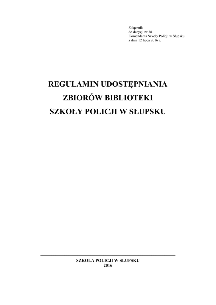 Załącznik do decyzji nr 38 Komendanta Szkoły Policji w Słupsku z dnia 12 lipca 2016 r. REGULAMIN UDOSTĘPNIANIA ZBIORÓW BIBLIOTEKI SZKOŁY POLICJI W SŁUPSKU ______________________________________________________________ SZKOŁA POLICJI W SŁUPSKU 2016 Rozdział 1 Postanowienia ogólne § 1. Regulamin określa zasady udostępniania zbiorów Biblioteki Szkoły Policji w Słupsku, zwanej dalej „Biblioteką”. § 2. Biblioteka działa w oparciu o ustawę z dnia 27 czerwca 1997 r. o bibliotekach (Dz. U. z 2012 r. poz. 642 z późn. zm.1). § 3. Biblioteka gromadzi i udostępnia materiały biblioteczne służące celom dydaktycznym. § 4. Działalność Biblioteki zapewnia czytelnikom dostęp do zasobów bibliotecznych, które wspierają działania związane z nauczaniem i zdobywaniem wiedzy fachowej. § 5. Biblioteka swoje zbiory: 1) udostępnia na miejscu w Czytelni i Pracowni Internetowej; 2) wypożycza na zewnątrz, poza Bibliotekę w Wypożyczalni; 3) wypożycza bibliotekom szkół policyjnych poprzez wypożyczanie międzybiblioteczne. § 6. Czytelnicy mogą korzystać ze zbiorów Biblioteki po okazaniu bibliotekarzowi dyżurującemu legitymacji służbowej lub innego dokumentu, który potwierdza ich tożsamość i uprawnienia do korzystania z Biblioteki. § 7. Czytelnicy zobowiązani są do: 1) przestrzegania przepisów o prawie autorskim i prawach pokrewnych; 2) wykazania dbałości o stan wypożyczonych materiałów bibliotecznych, udostępniony sprzęt komputerowy i inne urządzenia; 3) uregulowania wszelkich zobowiązań wobec Biblioteki, wynikających z zapisów Regulaminu udostępniania zbiorów Biblioteki Szkoły Policji w Słupsku. § 8. Czas pracy Biblioteki podany jest do ogólnej wiadomości. § 9. Szkoła Policji w Słupsku nie ponosi odpowiedzialności materialnej za pozostawione/zagubione w szatni lub innych pomieszczeniach Biblioteki rzeczy czytelników. 1 Zmiany tekstu jednolitego wymienionej ustawy zostały ogłoszone w Dz. U. z 2012 r. poz. 908 oraz z 2013 r. poz. 829 2 Rozdział 2 Udostępnianie zbiorów Wypożyczalni § 10. Prawo do wypożyczania materiałów bibliotecznych mają: 1) policjanci pełniący służbę w Szkole; 2) słuchacze Szkoły; 3) pracownicy Szkoły; 4) policjanci KMP w Słupsku. § 11. Zbiory biblioteczne wypożyczane są: 1) policjantom pełniącym służbę w Szkole na stanowiskach dydaktycznych do 10 egz. – na 6 miesięcy; 2) słuchaczom Szkoły przebywającym na kursach: a) kilkumiesięcznych do 10 egz. – na miesiąc, b) kilkudniowych do 5 egz. – odpowiednio do czasu trwania kursu; 3) pozostałym policjantom i pracownikom Szkoły do 5 egz. – na 3 miesiące; 4) policjantom KMP w Słupsku do 5 egz. – na miesiąc. § 12. 1. W uzasadnionych przypadkach bibliotekarz może zmienić limit wypożyczanych materiałów bibliotecznych lub skrócić/wydłużyć okres wypożyczenia. 2. Materiały biblioteczne, które stanowią egzemplarze pojedyncze w zbiorach Biblioteki, wypożyczane są na okres nie dłuższy niż 2 tygodnie. 3. Zbiorów unikatowych (egzemplarzy archiwalnych) nie wypożycza się, lecz udostępnia na miejscu. § 13. Wypożyczanie zbiorów jest ewidencjonowane na karcie czytelnika i koncie elektronicznym. § 14. Czytelnicy zobowiązani są do: 1) wypożyczenia osobistego, które potwierdzają własnoręcznym podpisem; 2) terminowego zwrotu wypożyczonych materiałów bibliotecznych, w tym słuchacze Szkoły, rozliczenia się nie później niż 2 dni przed zakończeniem szkolenia/kursu z wypożyczonych materiałów bibliotecznych; 3) uregulowania należności w przypadku zniszczenia/zagubienia materiału bibliotecznego (Załącznik nr 1 do Regulaminu udostępniania zbiorów Biblioteki Szkoły Policji w Słupsku). § 15. Czytelnicy, którzy po upływie terminu zwrotu przetrzymują materiały biblioteczne, tracą prawo do zamawiania i wypożyczania kolejnych pozycji do momentu zwrotu pozycji wypożyczonych. 3 Rozdział 3 Udostępnianie zbiorów Czytelni § 16. Korzystających z Czytelni obowiązuje: 1) pozostawienie w szatni okryć, toreb, pokrowców do laptopów oraz plecaków; 2) wyłączenie telefonu komórkowego; 3) zgłoszenie się do dyżurującego bibliotekarza, wpisanie się do zeszytu odwiedzin; 4) zgłoszenie dyżurującemu bibliotekarzowi wnoszonych do Czytelni książek; 5) uważne obchodzenie się z udostępnionymi materiałami; 6) zakaz wynoszenia udostępnionych materiałów poza Czytelnię bez zgody dyżurującego bibliotekarza; 7) zakaz spożywania posiłków i napojów; 8) zachowanie ciszy. § 17. Zbiory udostępniane są na miejscu w Czytelni: 1) policjantom pełniącym służbę w Szkole; 2) słuchaczom Szkoły; 3) pracownikom Szkoły; 4) policjantom KMP w Słupsku; 5) innym osobom, na wniosek, za zgodą Zastępcy Komendanta Szkoły (wzór wniosku załącznik nr 2). 1. 2. 3. 4. § 18. W uzasadnionych przypadkach, z wyjątkiem wymienionych w § 19, zbiory Czytelni można wypożyczyć na okres: 1) do 7 dni – wypożyczenia krótkoterminowe; 2) dni ustawowo wolnych od pracy – wypożyczenia weekendowe. Prawo do wypożyczenia krótkoterminowego/weekendowego mają osoby wymienione w § 17 pkt 1-3. Wypożyczanie zbiorów Czytelni jest ewidencjonowane na karcie czytelnika. W uzasadnionych wypadkach okres wypożyczenia może ulec skróceniu/wydłużeniu. § 19. Z Czytelni nie wypożycza się: 1) egzemplarzy uznanych za: cenne, unikatowe, trudne do nabycia; 2) wydawnictw encyklopedycznych; 3) słowników, albumów; 4) czasopism. § 20. Korzystający z Czytelni mają prawo do: 1) nauki/cichej pracy; 2) użytkowania udostępnionego sprzętu komputerowego lub innych urządzeń; 3) korzystania z własnego sprzętu komputerowego, np. notebooków. 4 Rozdział 4 Współpraca bibliotek szkół policyjnych w zakresie wzajemnego udostępniania zbiorów § 21. Prawo do korzystania z usługi wypożyczenia materiałów bibliotecznych z innych bibliotek szkół policyjnych, na zasadzie wypożyczenia międzybibliotecznego maj