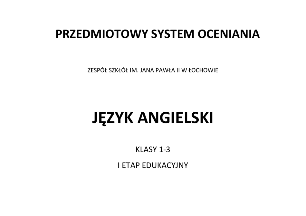 PRZEDMIOTOWY SYSTEM OCENIANIA ZESPÓŁ SZKŁÓŁ IM. JANA PAWŁA II W ŁOCHOWIE JĘZYK ANGIELSKI KLASY 1-3 I ETAP EDUKACYJNY Przedmiotowy system oceniania z języka angielskiego dla pierwszego etapu edukacyjnego został opracowany na podstawie następujących materiałów: - Wewnątrzszkolny System Oceniania - Program Nauczania Języka Angielskiego - „Sprawdzanie umiejętności w nauce języka angielskiego” H. Komorowska - „New English Adventure – Książka Nauczyciela” R. Raczyoska, M. Bogucka, S. Reed - „Treetops – Książka nauczyciela” S.M. Howell, L. Kester-Dodgson - „Ocenianie na pierwszym etapie edukacyjnym” M. Bogucka W roku szkolnym 2014/2015 obowiązują następujące programy nauczania i podręczniki: Klasy I PROGRAM NAUCZANIA: Program Nauczania Języka Angielskiego (zgodny z podstawą programową z 23 grudnia 2008, 27 sierpnia 2012 i 30 maja 2014) dla edukacji wczesnoszkolnej. Mariola Bogucka PODRĘCZNIK: „New English Adventure” podręcznik - poziom 1 „New English Adventure” zeszyt dwiczeo – poziom 1 Tessa Lochowski, Cristiana Bruni Wydawnictwo Pearson Nr akceptacji MEN: 680/1/2014 Klasy II PROGRAM NAUCZANIA: „Język angielski w nauczaniu zintegrowanym” program nauczania języka angielskiego do edukacji wczesnoszkolnej. Magdalena Szpotowicz, Małgorzta Szulc-Kurpaska PODRĘCZNIK: „Treetops” podręcznik dla szkoły podstawowej cz.2 „Treetops” zeszyt dwiczeo cz.2 Sarah M Howell, Lisa Kester-Dodgson Wydawnictwo Oxford university Press Nr akceptacji MEN: 311/2/2011 Klasy III PROGRAM NAUCZANIA: „Język angielski w nauczaniu zintegrowanym” program nauczania języka angielskiego do edukacji wczesnoszkolnej. Magdalena Szpotowicz, Małgorzta Szulc-Kurpaska PODRĘCZNIK: „Treetops” podręcznik dla szkoły podstawowej cz.3 „Treetops” zeszyt dwiczeo cz.3 Sarah M Howell, Lisa Kester-Dodgson Wydawnictwo Oxford university Press Nr akceptacji MEN: 311/3/2011 1. Cele oceniania: - Informowanie ucznia , rodzica/opiekuna prawnego oraz nauczyciela o poziomie osiągnięd edukacyjnych oraz postępach ucznia Udzielanie pomocy uczniowi w samodzielnym planowaniu swojego rozwoju, rozwijaniu uzdolnieo, pokonywaniu trudności Motywowanie ucznia do dalszych postępów w nauce Umożliwienie nauczycielom doskonalenia organizacji i metod pracy dydaktyczno-wychowawczej, oraz zwiększenie zasobu informacji o poziomie opanowania przez uczniów przerabianego aktualnie materiału 2. Obszary oceniania: Przedmiotem oceniania w całym roku szkolnym są osiągnięcia edukacyjne ucznia, stan wiedzy i umiejętności uczniów oraz czynione przez nich postępy. Obszary podlegające ocenianiu to: - wiadomości – przyswajanie niezbędnej wiedzy z zakresu wymaganego przez program słownictwa, struktur gramatycznych i ogólnej wiedzy językowej. Wiadomości podlegające ocenie zawarte są w planie wynikowym dla każdej klasy - umiejętności – sprawności językowe: mówienie, rozumienie ze słuchu, pisanie, czytanie głośne i ze zrozumieniem - wkład pracy - przygotowanie do zajęd, odrabianie zadao domowych, praca indywidualna na lekcji, wysiłek włożony w wykonanie zadania, praca zgodna z poleceniami nauczyciela, wykonywanie prac nieobowiązkowych, udział w zajęciach dodatkowych i konkursach 3. Sposoby oceniania wiadomości i umiejętności: - Oceny cząstkowe – ocenianie bieżące Ocenianie bieżące dokonywane jest w formie ocen szkolnych w skali 1-6. Oceny cząstkowe opatrzone są również słownym lub pisemnym komentarzem nauczyciela (zawierającym informację o stopniu opanowania materiału, postępach, problemach, formie poprawy). Uzyskane oceny są jawne, na prośbę ucznia lub jego opiekunów podlegają uzasadnieniu, a oceniane prace wglądowi. Oceniając prace pisemne (kartkówki, sprawdziany, testy) przyjmuje się skale punktową, przeliczaną na oceny cyfrowe według kryteriów: 100 – 86% - ocena bardzo dobra 85 – 70% - ocena dobra 69 – 50% - ocena dostateczna 49 – 30% - ocena dopuszczająca 29 – 0% - ocena niedostateczna Ocenę celującą z testu/sprawdzianu/pracy klasowej uzyskuje uczeo, który osiągnął minimum 95% punktów za zadania obowiązkowe oraz poprawnie wykonał zadanie dodatkowe. - Waga ocen cząstkowych Każdej ocenie cząstkowej otrzymywanej przez ucznia przypisana jest waga: Forma sprawdzania: Test sprawdzający Sprawdzian Kartkówka Zadania za pracę na lekcji - sprawności językowe (czytanie, pisanie, słuchanie), aktywnośd, prowadzenie zeszytu Zadania domowe obowiązkowe Zadania domowe dodatkowe Laureat/wyróżnienie w konkursie ogólnopolskim Laureat w konkursie szkolnym Waga oceny: 5 4 3 3 1 2 6 5 - Ocena semestralna i klasyfikacji rocznej Ocena semestralna i ocena klasyfikacji rocznej jest oceną opisową. Przygotowując ocenę opisową nauczyciel oblicza również średnią ważoną na podstawie wszystkich otrzymanych przez ucznia ocen, uwzględniając ich wagę. Średniej ważonej przyporządkowuje się ocenę szkolną następująco: Średnia 5,50 - 4,51 4,50 – 3,51 3,5 – 2,51 2,5 – 1,51 1,5 4. Ogólne kryteria oceniania Ocena bardzo dobry Dobry dostateczny dopuszczający niedostateczny POZIOM PODSTAWOWY OCENA NIEDOSTATECZNA Wiadomości: środki językowe, fonetyka, ortografia Uczeń nie spełnia większości kryteriów, by otrzymać ocenę dopuszczającą, tj. nie opanował podstawowej wiedzy i nie potrafi wykonać zadań o elementarnym stopniu trudności nawet z pomocą nauczyciela. Umiejętności: Słuchanie, czytanie, mówienie, pisanie POZIOM PONADPODSTAWOWY OCENA DOPUSZCZAJĄCA OCENA DOSTATECZNA OCENA DOBRA OCENA BARDZO DOBRA NISKI STOPIEŃ SPEŁNIENIA WYMAGAŃ EDUKACYJNYCH PODSTAWOWY STOPIEŃ SPEŁNIENIA WYMAGAŃ EDUKACYJNYCH ŚREDNI STOPIEŃ SPEŁNIENIA WYMAGAŃ EDUKACYJNYCH WYSOKI STOPIEŃ SPEŁNIANIA WYMAGAŃ EDUKACYJNYCH Uczeń: • zna ograniczoną liczbę podstawowych słów i wyrażeń – zasób słownictwa jest bardzo ograniczony • popełnia liczne błędy w ich zapisie i wymowie, • z
