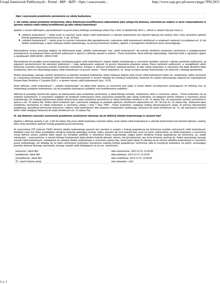 Urząd Zamówień Publicznych - Portal - BIP - BZP - Opis i szacowanie... http://www.uzp.gov.pl/cmsws/page/?PD;2831 Opis i szacowanie przedmiotu zamówienia na roboty budowlane I. Jak należy opisać przedmiot zamówienia, który dotychczas kwalifikowano odpowiednio jako usługę lub dostawę, natomiast po wejściu w życie rozporządzenia w sprawie wykazu robót należy kwalifikować go jako robotę budowlaną? Zgodnie z nowymi definicjami, wprowadzonymi na grunt prawa polskiego nowelizacją ustawy Pzp z dnia 12 października 2012 r., ilekroć w ustawie Pzp jest mowa o: „obiekcie budowlanym” – należy przez to rozumieć wynik całości robót budowlanych w zakresie budownictwa lub inżynierii lądowej lub wodnej, który może samoistnie spełniać funkcję gospodarczą lub techniczną (art. 2 ust. 5d Pzp); „robotach budowlanych” – należy przez to rozumieć wykonanie albo zaprojektowanie i wykonanie robót budowlanych określonych w przepisach wydanych na podstawie art. 2c lub obiektu budowlanego, a także realizacja obiektu budowlanego, za pomocą dowolnych środków, zgodnie z wymaganiami określonymi przez zamawiającego. Wprowadzone zmiany powodują odejście od definiowania pojęć „obiektu budowlanego” oraz „robót budowlanych” dla potrzeb określenia przedmiotu zamówienia w postępowaniach prowadzonych na podstawie Prawa zamówień publicznych w oparciu o definicje zawarte w ustawie - Prawo budowlane. Nowe definicje odpowiadają natomiast ściśle z regulacjom ujętym w dyrektywach 2004/18/WE i 2004/17/WE. Wprowadzone do porządku prawa krajowego nowelizacją pojęcie robót budowlanych i pojęcie obiektu budowlanego w rozumieniu dyrektyw unijnych z zakresu zamówień publicznych, są pojęciami autonomicznymi dla zamówień publicznych – mają zastosowanie wyłącznie na gruncie stosowania przepisów ustawy Prawo zamówień publicznych, w szczególności celem dokonania czynności szacowania wartości przedmiotu zamówienia. Przepisy w obecnym brzmieniu wskazują bowiem, że jako roboty budowlane w rozumieniu Pzp będą określane także świadczenia, które nie odpowiadają pojęciu robót budowlanych na gruncie ustawy – Prawo budowlane, np. usługi wynajmu sprzętu budowlanego i do wyburzeń z obsługą operatorską. Wobec powyższego, szacując wartość zamówienia na potrzeby inwestycji budowlanej, której realizacja obejmie obok innych robót budowlanych także ww. świadczenia, należy zsumować je z szacowaną wartością pozostałych robót budowlanych wykonywanych w ramach realizacji tej inwestycji budowlanej, stosownie do wykazu stanowiącego załącznik do rozporządzenia Prezesa Rady Ministrów z 3 grudnia 2012 r. w sprawie wykazu robót budowlanych (poz. 1372). Nowe definicje „robót budowlanych” i „obiektu budowlanego” nie będą miały wpływu na rozumienie tych pojęć w innych aktach normatywnych zawierających ich definicję oraz na interpretację przepisów budowlanych, czy też przepisów dotyczących podatków oraz kwalifikowania wydatków. Definicje te pozostają również bez wpływu na dokonywanie opisu przedmiotu zamówienia, w skład którego wchodzą świadczenia, które w rozumieniu ustawy – Prawo budowlane nie są robotami budowlanymi. Z oczywistych względów do świadczeń traktowanych celem szacowania przedmiotu jako roboty budowlane, nie będących jednak robotami w rozumieniu prawa budowlanego, nie znajdują zastosowania zasady dokonywania opisu przedmiotu zamówienia na roboty budowlane określone w art. 31 ustawy Pzp, czy szacowania wartości zamówienia w oparciu o art. 33 ustawy Pzp. Wobec takich świadczeń opis i szacowanie następuje na zasadach ogólnych, określonych odpowiednio art. 29 i 30 oraz art. 32 ustawy Pzp. Dokonanie opisu przedmiotu zamówienia na roboty budowlane w rozumieniu ustawy z dnia 7 lipca 1994 – Prawo budowlane, następuje według dotychczasowych zasad, za pomocą dokumentacji projektowej, specyfikacji technicznej wykonania i odbioru robót budowlanych albo programu funkcjonalno–użytkowego, stosownie do zasad określonych art. 31, zaś szacowanie wartości takich robót następuje stosownie do zasad określonych art. 33 ustawy Pzp . II. Jak dokonać czynności szacowania przedmiotu zamówienia odnosząc się do definicji obiektu budowlanego w ustawie Pzp? Zgodnie z definicją zawartą w art. 2 pkt 5d ustawy Pzp przez obiekt budowlany rozumieć należy wynik całości robót budowlanych w zakresie budownictwa lub inżynierii lądowej i wodnej, który może samoistnie spełniać funkcję gospodarczą lub techniczną. W orzecznictwie ETS (obecnie TSUE) istnienie obiektu budowlanego powinno być oceniane w związku z funkcją gospodarczą lub techniczną rezultatu wykonanych robót budowlanych. Obiektem może być zatem przykładowo określony budynek spełniający funkcję teatru, pływalni lub inna budowla typu most czy tunel. Jednocześnie, za obiekt budowlany w rozumieniu nowej definicji uznany zostanie także zespół czy kompleks obiektów w rozumieniu prawa budowlanego mający pełnić określoną funkcję gospodarczą lub techniczną, np. zespół rekreacyjno – wypoczynkowy, w ramach którego funkcjonować będą odrębne budynki pływalni, siłowni, sali gimnastycznej, spa, korty tenisowe, parkingi itp. Wobec powyższego szacując wartość robót budowlanych, niezbędnych do realizacji obiektu budowlanego w rozumieniu ustawy Pzp, nawet jeżeli roboty te odnoszą się do różnych obiektów budowlanych w rozumieniu prawa budowlanego, ale składają się na jedno zamierzenie budowlane wyznaczone wspólną funkcją gospodarczą i techniczną, jaką ta inwestycja budowlana ma pełnić, zamawiający powinien dokonać łącznego szacowania, sumując wartość robót składających się na ww. zamierzenie. wytworzył: Jakub Beli data wytworzenia: 2013-12-31 13:28:00 opublikował: Jakub Beli data publikacji: 2013-12-31 13:32:02 zmodyfikował: Jakub Beli data modyfikacji: 2013-