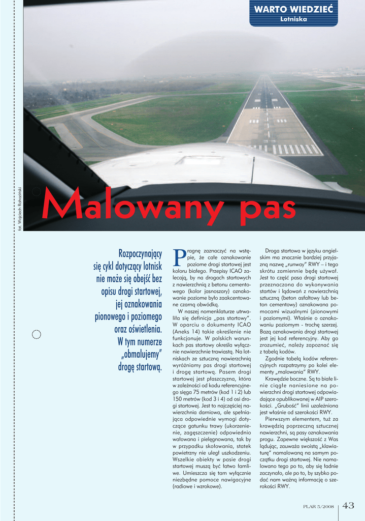 WARTO WIEDZIEĆ fot. Wojciech Rohoziński Lotniska Malowany pas Rozpoczynający się cykl dotyczący lotnisk nie może się obejść bez opisu drogi startowej, jej oznakowania pionowego i poziomego oraz oświetlenia. W tym numerze „obmalujemy” drogę startową. P ragnę zaznaczyć na wstępie, że całe oznakowanie poziome drogi startowej jest koloru białego. Przepisy ICAO zalecają, by na drogach startowych z nawierzchnią z betonu cementowego (kolor jasnoszary) oznakowanie poziome było zaakcentowane czarną obwódką. W naszej nomenklaturze utrwaliła się definicja „pas startowy”. W oparciu o dokumenty ICAO (Aneks 14) takie określenie nie funkcjonuje. W polskich warunkach pas startowy określa wyłącznie nawierzchnie trawiastą. Na lotniskach ze sztuczną nawierzchnią wyróżniamy pas drogi startowej i drogę startową. Pasem drogi startowej jest płaszczyzna, która w zależności od kodu referencyjnego sięga 75 metrów (kod 1 i 2) lub 150 metrów (kod 3 i 4) od osi drogi startowej. Jest to najczęściej nawierzchnia darniowa, ale spełniająca odpowiednie wymogi dotyczące gatunku trawy (ukorzenienie, zagęszczenie) odpowiednio wałowana i pielęgnowana, tak by w przypadku skołowania, statek powietrzny nie uległ uszkodzeniu. Wszelkie obiekty w pasie drogi startowej muszą być łatwo łamliwe. Umieszcza się tam wyłącznie niezbędne pomoce nawigacyjne (radiowe i wzrokowe). Droga startowa w języku angielskim ma znacznie bardziej przyjazną nazwę „runway” RWY – i tego skrótu zamiennie będę używał. Jest to część pasa drogi startowej przeznaczona do wykonywania startów i lądowań z nawierzchnią sztuczną (beton asfaltowy lub beton cementowy) oznakowana pomocami wizualnymi (pionowymi i poziomymi). Właśnie o oznakowaniu poziomym - trochę szerzej. Bazą oznakowania drogi startowej jest jej kod referencyjny. Aby go zrozumieć, należy zapoznać się z tabelą kodów. Zgodnie tabelą kodów referencyjnych rozpatrzymy po kolei elementy „malowania” RWY. Krawędzie boczne. Są to białe linie ciągłe naniesione na powierzchni drogi startowej odpowiadające opublikowanej w AIP szerokości. „Grubość” linii uzależniona jest właśnie od szerokości RWY. Pierwszym elementem, tuż za krawędzią poprzeczną sztucznej nawierzchni, są pasy oznakowania progu. Zapewne większość z Was lądując, zauważa swoistą „klawiaturę” namalowaną na samym początku drogi startowej. Nie namalowano tego po to, aby się ładnie zaczynało, ale po to, by szybko podać nam ważną informację o szerokości RWY. PLAR 5/2008 43 WARTO WIEDZIEĆ Lotniska Pierwszy element kodu Cyfra kodu a Drugi element kodu Referencyjna długość startu statku powietrznego Litera kodu Rozpiętość skrzydeł Całkowity rozstaw zewnętrznych kół podwozia głównegoa 1 poniżej 800 m A do 15 m (bez wartości 15 m) do 4,5 m (bez wartości 4,5 m) 2 od 800 m do 1200 m (bez wartości 1200 m) B od 15 m do 24 m (bez wartości 24 m) od 4,5 m do 6 m (bez wartości 6 m) 3 od 1200 m do 1800 m (bez wartości 1800 m) C od 24 m do 36 m (bez wartości 36 m) od 6 m do 9 m (bez wartości 9 m) 4 1800 m i powyżej D od 36 m do 52 m (bez wartości 52 m) od 9 m do 14 m (bez wartości 14 m) E od 52 m do 65 m (bez wartości 65 m) od 9 m do 14 m (bez wartości 14 m) F od 65 m do 80 m (bez wartości 80 m) od 14 m do 16 m (bez wartości 16 m) odległość pomiędzy zewnętrznymi krawędziami kół w podwoziu głównym Tabela kodów referencyjnych Standardowe oznakowanie początku drogi startowej Szerokość RWY [m] 18 23 30 45 60 Ilość pasów oznakowania progu 4 6 8 12 16 Szerokość srogi startowej i odpowiadającej jej ilości pasów przedstawia tabela. Jeżeli (z różnych przyczyn) próg drogi startowej (threshold – THR) nie znajduje się na jej początku, wówczas możemy spotkać próg stale lub czasowo przesunięty (displaced threshold). Jego oznako- 44 PLAR 5/2008 wanie rozpoczyna biała poprzeczna linia, następnie napotykamy „klawiaturę”, a potem oznakowanie tożsamości progu, które opiszę poniżej. Próg przesunięty poprzedzony jest strzałDwa rodzaje oznakowania przesuniętego progu kami, na których NIGDY NIE WOLNO LĄDOWAĆ. Te dwa rodzaje strzałek oznakowania progu przesuniętego, przekazują dwie różne informacje: a) z płaszczyzny poprzedzającej przesunięty próg 28 mogą odbywać się starty; b) z płaszczyzny oznaczonej „sierżantami” nie można startować. Może to być STOPWAY (SWY) dla przeciwnego kierunku (uwaga, jest to jedyne oznakowanie na RWY, które może być w kolorze żółtym). Następnym elementem za „klawiaturą” jest znak progu drogi startowej. Jest to dwucyfrowa liczba stanowiąca 1/10 najbliższej wartości azymutu magnetycznego osi drogi startowej, czyli – stając samolotem na progu w kierunku startu na busoli odczytujemy wartość. Jeżeli wynosi ona np. 081º próg oznaczony będzie 08. Jeżeli zaś wartość odczytu wynosić będzie np. 086º, wówczas próg oznaczony będzie 09. Ten znak tożsamości dro- towej, towarzyszyć nam będzie jej oś. Jest to linia przerywana, której każdy jeden pas („klawisz”) musi być dłuższy od przerwy między nim a kolejnym, a suma długości pasa i przerwy wynosić ma między 50 a 70 metrów. Szerokość jednego „klawisza” jest uzależniona od kategorii podejścia precyzyjnego. I tak dokołowaliśmy do strefy przyziemienia. Jej znaki muszą być naniesione, jeżeli droga startowa jest: o nawierzchni sztucznej, o cyfrze kodu referencyjnego: 2,3 lub 4. Przepisy ICAO zalecają także oznakowanie strefy przyziemienia Uproszczone oznakowanie progu Oznakowanie dwóch równoległych dróg startowych gi startowej umieszczony może być także pomiędzy pasami „klawiatury”. W takim przypadku przepisy mówią, że próg oznakowany może być minimum sześcioma pasami (po trzy z każdej strony). W przypadku dwóch dróg startowych równoległych na danym kierunku, liczbie (znakowi progu drogi st