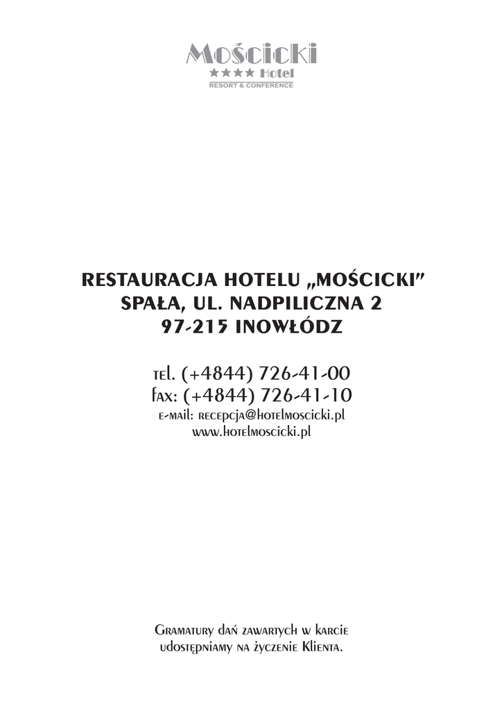 RESORT & CONFERENCE RESTAURACJA HOTELU „MOŚCICKI” SPAŁA, UL. NADPILICZNA 2 97-215 INOWŁÓDZ tel. (+4844) 726-41-00 fax: (+4844) 726-41-10 e-mail: [email protected] www.hotelmoscicki.pl Gramatury dań zawartych w karcie udostępniamy na życzenie Klienta. RESORT & CONFERENCE Restauracja Szef kuchni Adam Koperkiewicz poleca: PRZEKĄSKI Carpaccio z wędzonej polędwicy z jelenia w sosie z leśnych jeżyn (65g) (pieczywo, masło) 28 zł ZUPY Zupa gulaszowa z cielęciny podana w chrupiącym chlebie (250 ml) 18 zł DANIA GŁÓWNE Stek z jelenia podany w sosie myśliwskim na grzance ziemniaczanej (200g) 52 zł DESER Płonące naleśniki w sosie pomarańczowym z dodatkiem likieru Cointreau (2 szt., 70g) ul. Nadpiliczna 2, Spała, 97-215 Inowłódz, tel. (+4844) 7264100 fax (+4844) 7264110, 18 zł e-mail: [email protected] www.hotelmoscicki.pl RESORT & CONFERENCE Restauracja Today Chef Adam Koperkiewicz recommends: STARTER Carpaccio of the Deer tenderloin with the forest blackberry sauce (65g) 28 zł SOUP Goulash soup of the Veal served in loaf of bread (250 ml) 18 zł ENTREE Deer steak with the hunter sauce on potatoes fritters „rosti” (200g) 52 zł DESSERT Aflamed paneakes flavored with the „Cointreau” liqueur and orange sauce (140g) ul. Nadpiliczna 2, Spała, 97-215 Inowłódz, tel. (+4844) 7264100 fax (+4844) 7264110, 18 zł e-mail: [email protected] www.hotelmoscicki.pl RESORT & CONFERENCE Restauracja Menu PRZEKĄSKI ZIMNE Łosoś wędzony marynowany w żubrówce i miodzie z dodatkiem grubo mielonego pieprzu (70g) (masło, pieczywo) 28 zł Talerz wędlin wędzonych metodą tradycyjną (120g) (pieczywo, masło, ćwikła, chrzan) 28 zł Deska serów (100g) (ser valbon, camembert, lazur, ser kozi, winogron, orzechy włoskie) (pieczywo, masło) 22 zł Śledź marynowany w oleju z czerwoną cebulą, liściem laurowym i kolorowym pieprzem z dodatkiem kurek w sosie koperkowym (70g) (masło, pieczywo) 15 zł ul. Nadpiliczna 2, Spała, 97-215 Inowłódz, tel. (+4844) 7264100 fax (+4844) 7264110, e-mail: [email protected] www.hotelmoscicki.pl RESORT & CONFERENCE Restauracja Menu STARTERS Finely cut smoked salomon marinated in honey and sweetgrass vodka „Żubrówka” (70g) 28 zł Variety of Polish traditional smoked meat with horse-radish sauce, marinated vegetables, assortment bread and butter (120g) 28 zł Assortiment of cheese with grapes and welnuts (100g) 22 zł Marinated Herring fillet in oil and Chanterelle (Forest mushrooms) and dill sauce (70g) 15 zł ul. Nadpiliczna 2, Spała, 97-215 Inowłódz, tel. (+4844) 7264100 fax (+4844) 7264110, e-mail: [email protected] www.hotelmoscicki.pl RESORT & CONFERENCE Restauracja Menu SAŁATKI Filet z kurczaka marynowany w kefirze i czosnku, podany na sałacie lodowej z suszonymi pomidorami i grzankami (100g) (pieczywo, masło) 21 zł Grillowane warzywa podane na sałacie z duszonymi kurkami i parmezanem, skropione sosem ziołowym (70g) (pieczywo, masło) 18 zł Torcik z mozarelli i pomidorów (70g) (oliwa z oliwek, ocet balsamiczny, świeża bazylia, pieczywo, masło) 12 zł Sałatka owocowa podana na rukoli z dodatkiem jogurtu greckiego (100g) 16 zł ul. Nadpiliczna 2, Spała, 97-215 Inowłódz, tel. (+4844) 7264100 fax (+4844) 7264110, e-mail: [email protected] www.hotelmoscicki.pl RESORT & CONFERENCE Restauracja Menu SALADS Chicken breast marinated in kefir and the garlic with lettuce, dried tomato and toast (100g) 21 zł Grilled vegetables and Chantarelle forest mushrooms, parmesan (70g) 18 zł Pyramid of mozarella cheese and tomato, fresh, basil, olive oil and balsamic dressing (70g) 12 zł Fruits salad on water-cress and jogurt dressing (100g) 16 zł ul. Nadpiliczna 2, Spała, 97-215 Inowłódz, tel. (+4844) 7264100 fax (+4844) 7264110, e-mail: [email protected] www.hotelmoscicki.pl RESORT & CONFERENCE Restauracja Menu PRZYSTAWKI GORĄCE Krewetki królewskie w sosie maślanym z dodatkiem czosnku i świeżej pietruszki (100g) (pieczywo, masło) 30 zł Borowiki ze spalskich lasów w śmietanie (100g) (pieczywo, masło) 25 zł Smażone rydze w jajku w akompaniamencie świeżej pietruszki (100g) (pieczywo, masło) 26 zł Ser Valbon na sałacie lodowej i pomidorach z jajkiem w koszulce i sosem z sera pleśniowego (100g) (pieczywo, masło) 22 zł Kiełbasa po myśliwsku z sosem żurawinowo-chrzanowym (120g) (pieczywo, masło) 22 zł ul. Nadpiliczna 2, Spała, 97-215 Inowłódz, tel. (+4844) 7264100 fax (+4844) 7264110, e-mail: [email protected] www.hotelmoscicki.pl RESORT & CONFERENCE Restauracja Menu HOT STARTERS Shrimps Royal style with the butter sauce, dill, garlic and parsley (100g) 30 zł Boletus „Borowiki” (forest mushrooms) stewed in cream (100g) 25 zł Saffron Milk Caps (forest mushrooms) fried in butter-gateau (100g) 26 zł Valbon Cheese on the lettuce, with fresh tomato and poached egg (100g) 22 zł Roasted sausage hunter style with Canberry and the Horseradish sauce (120g) 22 zł ul. Nadpiliczna 2, Spała, 97-215 Inowłódz, tel. (+4844) 7264100 fax (+4844) 7264110, e-mail: [email protected] www.hotelmoscicki.pl RESORT & CONFERENCE Restauracja Menu ZUPY Krem z brokułów z serem gorgonzola i prażonymi migdałami (250 ml) 14 zł Krem z podgrzybków z grzankami (250ml) 12 zł Zupa szpinakowa z jajkiem w koszulce i złotą grzanką (250ml) 10 zł Kapuśniak na wędzonym boczku z ziemniakami (250ml) 10 zł Żurek po spalsku z kiełbasą i jajkiem (250ml) 10 zł ul. Nadpiliczna 2, Spała, 97-215 Inowłódz, tel. (+4844) 7264100 fax (+4844) 7264110, e-mail: [email protected] www.hotelmoscicki.pl RESORT & CONFERENCE Restauracja Menu SOUPS Broccoli cream soup with gorgonzola cheese and almonds (250 ml) 14 zł Forest mushrooms cream soup with croutons (250ml) 12 zł Spinach soup with poached egg (250ml) 10 zł Sour cabbage soup with smoked bacon (250ml) 10 zł Traditional Polish borsch "Zurek" (250ml) 10 zł (The leaven of rye flour, cooked on smoked bacon and sausage flavored with garlic and marjoram) ul. Nadpiliczna 2, Spała, 97