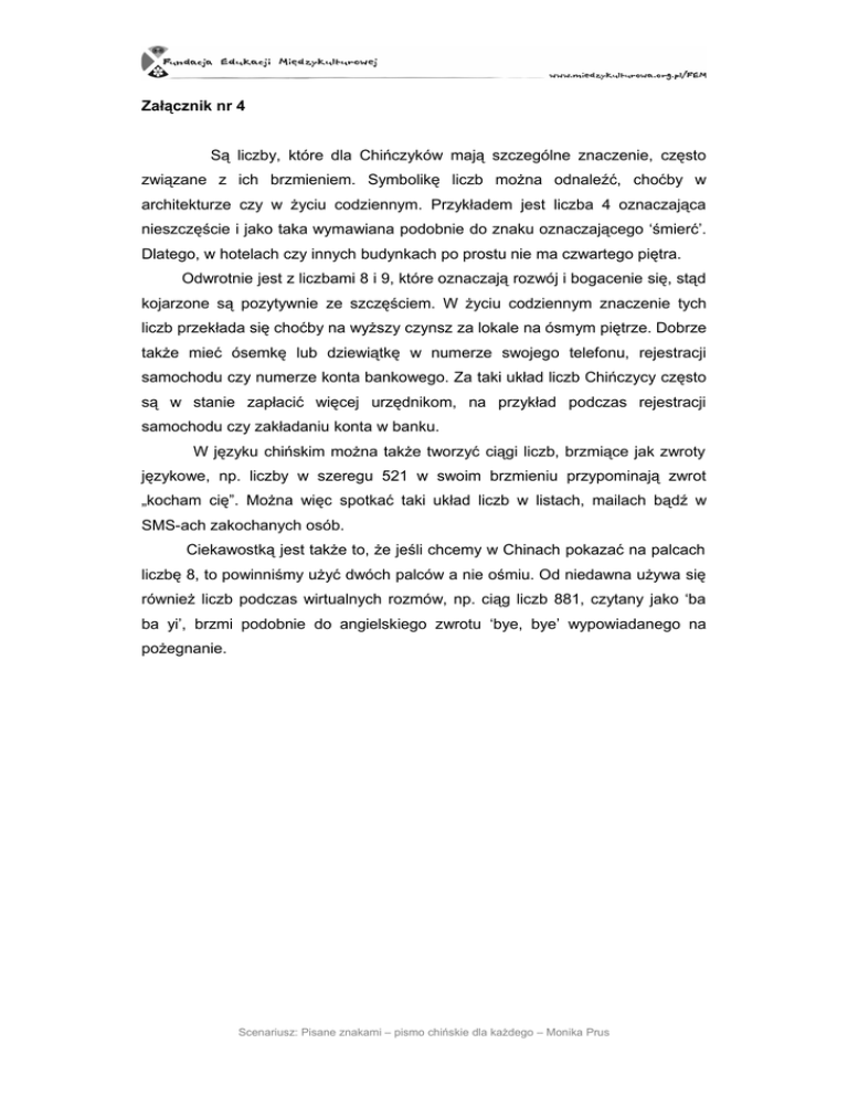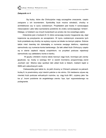 Załącznik nr 4 Są liczby, które dla Chińczyków mają szczególne znaczenie, często związane z ich brzmieniem. Symbolikę liczb można odnaleźć, choćby w architekturze czy w życiu codziennym. Przykładem jest liczba 4 oznaczająca nieszczęście i jako taka wymawiana podobnie do znaku oznaczającego ‘śmierć’. Dlatego, w hotelach czy innych budynkach po prostu nie ma czwartego piętra. Odwrotnie jest z liczbami 8 i 9, które oznaczają rozwój i bogacenie się, stąd kojarzone są pozytywnie ze szczęściem. W życiu codziennym znaczenie tych liczb przekłada się choćby na wyższy czynsz za lokale na ósmym piętrze. Dobrze także mieć ósemkę lub dziewiątkę w numerze swojego telefonu, rejestracji samochodu czy numerze konta bankowego. Za taki układ liczb Chińczycy często są w stanie zapłacić więcej urzędnikom, na przykład podczas rejestracji samochodu czy zakładaniu konta w banku. W języku chińskim można także tworzyć ciągi liczb, brzmiące jak zwroty językowe, np. liczby w szeregu 521 w swoim brzmieniu przypominają zwrot „kocham cię”. Można więc spotkać taki układ liczb w listach, mailach bądź w SMS-ach zakochanych osób. Ciekawostką jest także to, że jeśli chcemy w Chinach pokazać na palcach liczbę 8, to powinniśmy użyć dwóch palców a nie ośmiu. Od niedawna używa się również liczb podczas wirtualnych rozmów, np. ciąg liczb 881, czytany jako ‘ba ba yi’, brzmi podobnie do angielskiego zwrotu ‘bye, bye’ wypowiadanego na pożegnanie. Scenariusz: Pisane znakami – pismo chińskie dla każdego – Monika Prus