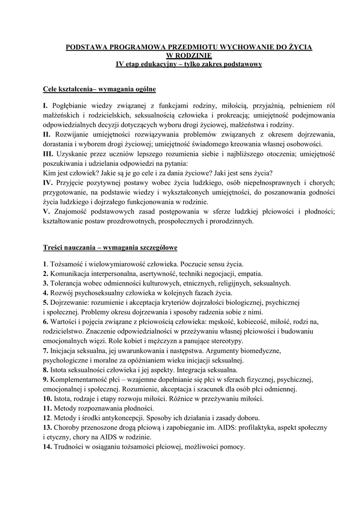 PODSTAWA PROGRAMOWA PRZEDMIOTU WYCHOWANIE DO ŻYCIA W RODZINIE IV etap edukacyjny – tylko zakres podstawowy Cele kształcenia– wymagania ogólne I. Pogłębianie wiedzy związanej z funkcjami rodziny, miłością, przyjaźnią, pełnieniem ról małżeńskich i rodzicielskich, seksualnością człowieka i prokreacją; umiejętność podejmowania odpowiedzialnych decyzji dotyczących wyboru drogi życiowej, małżeństwa i rodziny. II. Rozwijanie umiejętności rozwiązywania problemów związanych z okresem dojrzewania, dorastania i wyborem drogi życiowej; umiejętność świadomego kreowania własnej osobowości. III. Uzyskanie przez uczniów lepszego rozumienia siebie i najbliższego otoczenia; umiejętność poszukiwania i udzielania odpowiedzi na pytania: Kim jest człowiek? Jakie są je go cele i za dania życiowe? Jaki jest sens życia? IV. Przyjęcie pozytywnej postawy wobec życia ludzkiego, osób niepełnosprawnych i chorych; przygotowanie, na podstawie wiedzy i wykształconych umiejętności, do poszanowania godności życia ludzkiego i dojrzałego funkcjonowania w rodzinie. V. Znajomość podstawowych zasad postępowania w sferze ludzkiej płciowości i płodności; kształtowanie postaw prozdrowotnych, prospołecznych i prorodzinnych. Treści nauczania – wymagania szczegółowe 1. Tożsamość i wielowymiarowość człowieka. Poczucie sensu życia. 2. Komunikacja interpersonalna, asertywność, techniki negocjacji, empatia. 3. Tolerancja wobec odmienności kulturowych, etnicznych, religijnych, seksualnych. 4. Rozwój psychoseksualny człowieka w kolejnych fazach życia. 5. Dojrzewanie: rozumienie i akceptacja kryteriów dojrzałości biologicznej, psychicznej i społecznej. Problemy okresu dojrzewania i sposoby radzenia sobie z nimi. 6. Wartości i pojęcia związane z płciowością człowieka: męskość, kobiecość, miłość, rodzi na, rodzicielstwo. Znaczenie odpowiedzialności w przeżywaniu własnej płciowości i budowaniu emocjonalnych więzi. Role kobiet i mężczyzn a panujące stereotypy. 7. Inicjacja seksualna, jej uwarunkowania i następstwa. Argumenty biomedyczne, psychologiczne i moralne za opóźnianiem wieku inicjacji seksualnej. 8. Istota seksualności człowieka i jej aspekty. Integracja seksualna. 9. Komplementarność płci – wzajemne dopełnianie się płci w sferach fizycznej, psychicznej, emocjonalnej i społecznej. Rozumienie, akceptacja i szacunek dla osób płci odmiennej. 10. Istota, rodzaje i etapy rozwoju miłości. Różnice w przeżywaniu miłości. 11. Metody rozpoznawania płodności. 12. Metody i środki antykoncepcji. Sposoby ich działania i zasady doboru. 13. Choroby przenoszone drogą płciową i zapobieganie im. AIDS: profilaktyka, aspekt społeczny i etyczny, chory na AIDS w rodzinie. 14. Trudności w osiąganiu tożsamości płciowej, możliwości pomocy. 15. Normy zachowań seksualnych. Przemoc i przestępstwa seksualne; możliwości zapobiegania, sposoby obrony. Informacja o ośrodkach pomocy psychologicznej, medycznej i prawnej. 16. Przygotowanie do małżeństwa. Problemy wierności, zaufania i dialogu. 17. Małżeństwo: jego fazy; trudności i konflikty oraz sposoby ich rozwiązywania; wartość małżeństwa. Macierzyństwo i ojcostwo. Przygotowanie do ról rodzicielskich. Adopcja. Bez dzietność. 18. Przebieg i higiena ciąży. Rozwój prenatalny dziecka. Szkoła rodzenia, poród i naturalne karmienie. Rola rodziców w okresie oczekiwania na narodziny dziecka, w czasie porodu i po narodzinach. 19. Funkcje rodziny, ze szczególnym uwzględnieniem wychowania dzieci w rodzinie. Zna cze nie prawidłowych postaw rodzicielskich dla rozwoju dziecka. Samotne rodzicielstwo. 20. Nieplanowana ciąża; sposoby szukania pomocy w sytuacjach trudnych. 21. Aborcja jako zagrożenie dla zdrowia psychicznego i fizycznego – aspekty: prawny, medyczny i etyczny. 22. Konflikty w rodzinie i ich przyczyny. Sposoby rozwiązywania konfliktów. 23. Przemoc w rodzinie. Wykorzystywanie seksualne. Profilaktyka. Możliwości uzyskiwania pomocy. 24. Zagrożenia życia społecznego: alkoholizm, narkomania, agresja, sekty, pornografia. 25. Prawodawstwo dotyczące rodziny. Zawarcie małżeństwa, separacja, rozwód. Prawa i obowiązki małżonków i rodziców, prawa dziecka. Obowiązki państwa wobec rodziny. 26. Człowiek wobec niepełnosprawności, starości, choroby, umierania i śmierci, w tym w aspekcie życia rodzinnego. 27. Poradnictwo młodzieżowe i rodzinne w Polsce. Na IV etapie edukacyjnym, do zadań szkoły należy w szczególności: 1) wspieranie wychowawczej roli rodziny; integrowanie działań szkoły i rodziców; 2) pomoc w kształtowaniu pozytywnego stosunku do płciowości; odniesienie płciowości do wartości i pojęć, takich jak: poszanowanie życia, miłość, małżeństwo, rodzina, przyjaźń, akceptacja i szacunek w relacjach międzyludzkich; 3) pomoc w osiąganiu dojrzałości psychoseksualnej; 4) uświadomienie roli rodziny w życiu człowieka; promowanie trwałych związków, których podstawą jest więź emocjonalna, efektywne sposoby komunikowania się, wzajemne zrozumienie; 5) przekazywanie rzetelnej, dostosowanej do poziomu rozwoju ucznia, wiedzy na temat zmian biologicznych, psychicznych i społecznych w różnych fazach rozwoju człowieka.