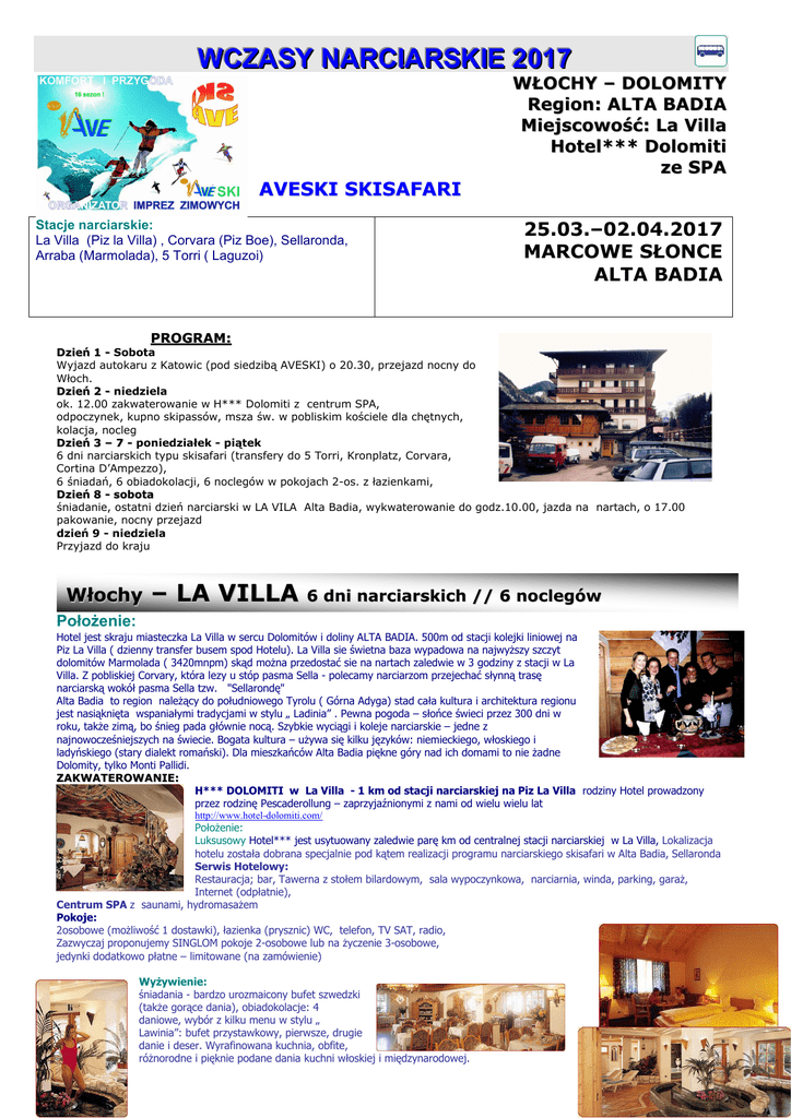 WCZASY NARCIARSKIE 2017 WŁOCHY – DOLOMITY Region: ALTA BADIA Miejscowość: La Villa Hotel*** Dolomiti ze SPA AVESKI SKISAFARI Stacje narciarskie: La Villa (Piz la Villa) , Corvara (Piz Boe), Sellaronda, Arraba (Marmolada), 5 Torri ( Laguzoi) 25.03.–02.04.2017 MARCOWE SŁONCE ALTA BADIA PROGRAM: Dzień 1 - Sobota Wyjazd autokaru z Katowic (pod siedzibą AVESKI) o 20.30, przejazd nocny do Włoch. Dzień 2 - niedziela ok. 12.00 zakwaterowanie w H*** Dolomiti z centrum SPA, odpoczynek, kupno skipassów, msza św. w pobliskim kościele dla chętnych, kolacja, nocleg Dzień 3 – 7 - poniedziałek - piątek 6 dni narciarskich typu skisafari (transfery do 5 Torri, Kronplatz, Corvara, Cortina D’Ampezzo), 6 śniadań, 6 obiadokolacji, 6 noclegów w pokojach 2-os. z łazienkami, Dzień 8 - sobota śniadanie, ostatni dzień narciarski w LA VILA Alta Badia, wykwaterowanie do godz.10.00, jazda na nartach, o 17.00 pakowanie, nocny przejazd dzień 9 - niedziela Przyjazd do kraju Włochy – LA VILLA 6 dni narciarskich // 6 noclegów Położenie: Hotel jest skraju miasteczka La Villa w sercu Dolomitów i doliny ALTA BADIA. 500m od stacji kolejki liniowej na Piz La Villa ( dzienny transfer busem spod Hotelu). La Villa sie świetna baza wypadowa na najwyższy szczyt dolomitów Marmolada ( 3420mnpm) skąd można przedostać sie na nartach zaledwie w 3 godziny z stacji w La Villa. Z pobliskiej Corvary, która lezy u stóp pasma Sella - polecamy narciarzom przejechać słynną trasę narciarską wokół pasma Sella tzw. "Sellarondę" Alta Badia to region należący do południowego Tyrolu ( Górna Adyga) stad cała kultura i architektura regionu jest nasiąknięta wspaniałymi tradycjami w stylu „ Ladinia” . Pewna pogoda – słońce świeci przez 300 dni w roku, także zimą, bo śnieg pada głównie nocą. Szybkie wyciągi i koleje narciarskie – jedne z najnowocześniejszych na świecie. Bogata kultura – używa się kilku języków: niemieckiego, włoskiego i ladyńskiego (stary dialekt romański). Dla mieszkańców Alta Badia piękne góry nad ich domami to nie żadne Dolomity, tylko Monti Pallidi. ZAKWATEROWANIE: H*** DOLOMITI w La Villa - 1 km od stacji narciarskiej na Piz La Villa rodziny Hotel prowadzony przez rodzinę Pescaderollung – zaprzyjaźnionymi z nami od wielu wielu lat http://www.hotel-dolomiti.com/ Położenie: Luksusowy Hotel*** jest usytuowany zaledwie parę km od centralnej stacji narciarskiej w La Villa, Lokalizacja hotelu została dobrana specjalnie pod kątem realizacji programu narciarskiego skisafari w Alta Badia, Sellaronda Serwis Hotelowy: Restauracja; bar, Tawerna z stołem bilardowym, sala wypoczynkowa, narciarnia, winda, parking, garaż, Internet (odpłatnie), Centrum SPA z saunami, hydromasażem Pokoje: 2osobowe (możliwość 1 dostawki), łazienka (prysznic) WC, telefon, TV SAT, radio, Zazwyczaj proponujemy SINGLOM pokoje 2-osobowe lub na życzenie 3-osobowe, jedynki dodatkowo płatne – limitowane (na zamówienie) Wyżywienie: śniadania - bardzo urozmaicony bufet szwedzki (także gorące dania), obiadokolacje: 4 daniowe, wybór z kilku menu w stylu „ Lawinia”: bufet przystawkowy, pierwsze, drugie danie i deser. Wyrafinowana kuchnia, obfite, różnorodne i pięknie podane dania kuchni włoskiej i międzynarodowej. Rekreacja: centrum SPA do dyspozycji gości w godz. 15.00 – 19.30 Znakomite centrum wellness wyposażono m.in. w takie atrakcje jak termarium - zewnętrzne ogrzewane jacuzzi, sauna fińska, biosauna, hydromasaż TERMIN: 6 noclegów // 6 dni narciarskich ze 6 śniadaniami i 6 kolacjami 6 noclegów od Sb do Sb 25.03 -02.04 MARCOWE SŁOŃCE 2299zł + skipass dolomitisuperski Znizka 100zł dla stałych klientów Płatne w II ratach w PLN na konto AVE SKI: 1 rata: przy zapisie 30 % - 779 PLN 2 rata: płatna najpóźniej do 10.02.2016 na konto złotówkowe: PLN Alior 76 2490 1057 0000 9900 8428 8257 Cena obejmuje: Transport autokarem; 6 noclegów w H*** w pokoju 2-os. z łazienką, wyżywienie 2 x dziennie (śniadania, obiadokolacje ) ubezpieczenie w TU "Signal Iduna" (NNW i KL) z rozszerzeniem na amatorskie uprawianie sportów zimowych codzienne korzystanie z centrum SPA opiekę licencjonowanego pilota wyc. zagr. Cena nie obejmuje: napojów przy obiadokolacji obiadu w sb w dniu wyjazdu (fakultatywnie 12 Euro) ubezpieczenia dodatkowego OC SKI karnetów narciarskich opłata klimatyczna płatna na recepcji - obligatoryjna ( prawo włoskie) ZWYŻKI Dopłata do jedynki: 300zł Ubezpieczenie OC SKI – 45zł / 60 zł - w zależności od wariantu ZNIŻKI Zniżki dla 3 osoby w pokoju: dzieci tylko przy 2 osobach pełnopłatnych w pokoju! Zniżka dla dzieci do 3 lat: 350zł Zniżka dla dzieci 4- 5 – 300zł Zniżka dla dzieci 6-10 –200zł Zniżka dla 3,4 osoby dorosłej w pokoju 3 lub 4 -os: 150zł zniżka za dojazd własny - 300 zł ISTNIEJE MOŻLIWOŚĆ WYKUPIENIA UBEZPIECZENIA -PAKIET NARCIARSKI Z ROZSZERZENIEM”: ”JAZDA AMATORSKA ZE SPRZĘTEM” KL 20 000 PLN NNW 15 000 PLN OC 30 000 EUR BP 1000 PLN SS 1000 PLN „JAZDA AMATORSKA ZE SPRZĘTEM PLUS” KL 40 000 PLN NNW 30 000 PLN OC 60 000 EUR BP 1000 PLN SS 2000 PLN W razie zainteresowania wykupieniem ubezpieczenia z rozszerzeniem prosimy o bezpośredni kontakt z Biurem ATRAKCJE: - skikaruzela narciarska - codzienna nauka jazdy na nartach dla początkujących (2 godz. dziennie) - możliwość nauki jazdy carvingowej (4 x w tygodniu po 2 godz.) - zawody o Puchach AVESKI - turniej bilardowy - kolacja przy świecach z kuchnią regionalną - wieczorne lodowisko POLECAMY zabrać sprzęt narciarski (narty - ze względu na transport w pokrowcu, buty narciarskie, gogle, smary), strój kąpielowy, okulary słoneczne, 1 zdjęcie na karnet zniżkowy (senior, dzieci do lat 8 GRATIS) AVE BUS INFO Miejscem głównym wyjazdu są Katowice i ewentualnie Kraków (do potwierdzenia) Ze wszystkich innych kierunków mogą być poprowadzone połączenia antenowe. WYJAZD AUTOKARU z Katowic o 20.30 (z Krakowa o 19.30 )