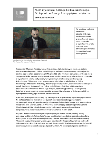 Niech żyje sztuka! Kolekcja Feliksa Jasieńskiego. Od Japonii do Europy. Rzeczy piękne i użyteczne 13.06 2015 – 3.07 2016 Na wystawę wybrano około 400 z blisko 15 tysięcy znakomitych dzieł, gromadzonych latami przez człowieka o wyjątkowym smaku arytystycznym, błyskotliwym intelekcie i prawdziwej pasji kolekcjonera Józef Pankiewicz, Portret Feliksa Jasieńskiego (fragment) Fot. Muzeum Narodowe w Krakowie Pracownicy Muzeum Narodowego w Krakowie podjęli się niezwykle trudnego zadania zaprezenowania postaci Feliksa Jasieńskiego za pośrednictwem wystawy złożonej z dzieł sztuki z jego kolekcji, podarowanej MNK przed 95 laty. Trudność polegała na wyborze około czterystu z blisko piętnastu tysięcy znakomitych dzieł gromadzonych latami przez człowieka o wyjątkowym smaku arytystycznym, błyskotliwym intelekcie i prawdziwej pasji kolekcjonera. Efektem tej pracy jest wystawa „Niech żyje sztuka! Kolekcja Feliksa Jasieńskiego. Od Japonii do Europy. Rzeczy piękne i użyteczne”, zaaranżowana w dziesięciu salach Kamienicy Szołayskich im. Feliksa Jasieńskiego – Oddziału MNK przy placu Szczepańskim w Krakowie. Wybór tego miejsca jest nieprzypadkowy – to tutaj Feliks Jasieński pragnął utworzyć osobny oddział Muzeum Narodowego w Krakowie, w którym byłby prezentowany jego bezcenny dar dla Polaków. Z postacią kolekcjonera spotkamy się, zanim jeszcze rozpoczniemy oglądanie jego zbiorów. Na klatce schodowej Kamienicy Szołayskich rozwieszone zostaną powiększenia archiwalnych fotografii, przedstawiających samego Feliksa Jasieńskiego oraz wnętrze jego mieszkania przy ulicy św. Jana 1 w Krakowie, nazywanego przez samego kolekcjonera Musée Jasieński. Nie zabraknie także zdjęć z pierwszej wystawy jego zbiorów, zorganizowanej przez Muzeum Narodowe w Krakowie w roku 1934. Aż pięć z dziesięciu wystawowych sal poświęconych zostało sztuce polskiej, której przykłady w zbiorach Feliksa Jasieńskiego wyróżniają się wartością szczególną. Zapalony kolekcjoner, przyjaciel krakowskiej bohemy i niemal wszystkich profesorów krakowskiej Akademii, kupował ich prace w czasie, gdy powstawały. Reagował żywiołowo na trendy i idee swojej epoki, a dokonały gust sprawił, że zgromadził dzieła ponadczasowe, które dziś zachwycają może jeszcze bardziej niż przed wiekiem. W części poświęconej polskiemu 1 Niech żyje sztuka! Kolekcja Feliksa Jasieńskiego. Od Japonii do Europy. Rzeczy piękne i użyteczne 13.06 2015 – 3.07 2016 malarstwu będzie więc można oglądać dzieła najwybitniejszych twórców polskiego modernizmu: Jacka Malczewskiego, Józefa Pankiewicza, Władysława Podkowińskiego, Jana Stanisławskiego, Leona Wyczółkowskiego, Stanisława Wyspiańskiego, Ksawerego Dunikowskiego, Konstantego Laszczki i wielu innych. Umieszczony na honorowym miejscu, oczy przyciąga portret Feliksa Jasieńskiego z teką z 1903 roku pędzla Jacka Malczewskiego. Dokładnie w tym roku z inicjatywy kolekcjonera została wydana „Teka Grafików Polskich”, w której znalazły się prace najznakomitszych przedstawicieli Młodej Polski. Kilka dzieł należących do tej teki prezentowanych będzie w sali poświęconej nowoczesnej grafice polskiej. Kolekcjonera będziemy mogli oglądać także na portrecie autorstwa m.in. Leona Wyczółkowskiego – w płaszczu arabskim, prezentowanym w części wystawy poświęconej fascynacji Jasieńskiego orientem – czy Józefa Pankiewicza. Ten ostatni uwiecznił modela przy fortepianie, co przypomina o kolejnej wielkiej namiętności krakowskiego intelektualisty: muzyce. Młodopolski pejzaż reprezentowany jest na wystawie przez nastrojowe obrazy Jana Stanisławskiego i Leona Wyczółkowskiego, z kolei martwe natury to w wielu przypadkach „portrety” cennych muzealiów ze zbiorów Jasieńskiego, chętnie wypożyczanych przez niego zaprzyjaźnionym artystom. I tak perski wazon z obrazu Józefa Pankiewicza możemy podziwiać w oryginale w kolejnej części ekspozycji, podobnie jak rzeźbę Antoniego Kurzawy przedstawioną na płótnie tego samego Pankiewicza zatytułowanym Barbarka i kwiaty. Pejzaż symboliczny zilustrują m.in. obrazy Jacka Malczewskiego i Leona Wyczółkowskiego. Kolejne sale wypełnione zostaną grafiką, zarówno tą polską, tworzoną przez twórców z Towarzystwa Polskich Artystów Grafików, którego Feliks Jasieński był założycielem, jak i zachodnioeuropejską. Warto przypomnieć, że jako jedyny Polak wszedł on w posiadanie wszystkich czterech cyklów graficznych Francisca Goi i dzięki niemu Muzeum Narodowe w Krakowie jest dziś jedyną w kraju instytucją, która je posiada w komplecie. Szesnastu pracom graficznym Goi, którego Jasieński był wybitnym znawcą i niestrudzonym popularyzatorem, towarzyszy wybór dzieł Jacques’a Callota i Giovanniego Piranesiego. Kluczem do pokazania nowoczesnej grafiki zagranicznej stały się wydawnictwa albumowe, wysoko cenione w kręgach artystycznych i kolekcjonerskich. To właśnie z nich pochodzą prace m.in. Maxa Klingera czy Jamesa Whistlera. Niezwykle ważne miejsce w kolekcji Jasieńskiego zajmuje sztuka Dalekiego Wschodu, obejmująca malarstwo japońskie i chińskie, grafikę, rzeźbę buddyjską oraz rzemiosło: tkaniny, wyroby z kości, laki i brązu, ceramikę, militaria. Ogrom tej części kolekcji przedstawiony zostanie jedynie w niewielkim fragmencie. Niewątpliwie warto zwrócić uwagę na dzieła graficzne takich twórców grafiki jak Hokusai i Hiroshige. Szkice pierwszego z nich zebrane zostały w woluminach zatytułowanych Manga. Właśnie to słowo, zamieszczone przez Jasieńskiego w tytule książki Manggha. Promenades à travers le mond, l’art et les idées (Manggha. Wędrówki po świecie, sztuce i ideach), stało się jednym z licznych pseudonimów kolekcjonera. 2 Niech żyje sztuka! Kolekcja Feliksa Jasieńskiego. Od Japonii do Europy. Rzeczy piękne i użyteczne 13.06 2015 – 3.07 2016 Zabytki perskie: kobierc