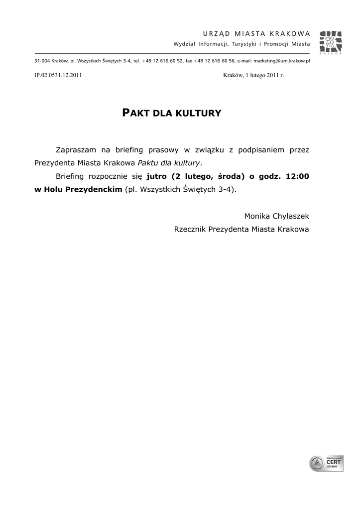Kraków, 1 lutego 2011 r. IP.02.0531.12.2011 PAKT DLA KULTURY Zapraszam na briefing prasowy w związku z podpisaniem przez Prezydenta Miasta Krakowa Paktu dla kultury. Briefing rozpocznie się jutro (2 lutego, środa) o godz. 12:00 w Holu Prezydenckim (pl. Wszystkich Świętych 3-4). Monika Chylaszek Rzecznik Prezydenta Miasta Krakowa