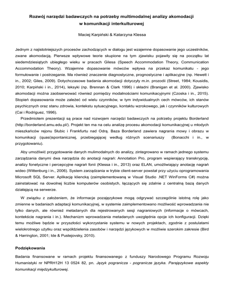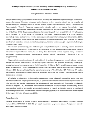 Rozwój narzędzi badawczych na potrzeby multimodalnej analizy akomodacji w komunikacji interkulturowej Maciej Karpiński & Katarzyna Klessa Jednym z najistotniejszych procesów zachodzących w dialogu jest wzajemne dopasowanie jego uczestników, zwane akomodacją. Pierwsze wpływowe teorie skupione na tym zjawisku pojawiły się na początku lat siedemdziesiątych ubiegłego wieku w pracach Gilesa (Speech Accommodation Theory, Communication Accommodation Theory). Wzajemne dopasowanie mówców wpływa na przekaz komunikatu - jego formułowanie i postrzeganie. Ma również znaczenie diagnostyczne, prognostyczne i aplikacyjne (np. Hewett i in., 2002; Giles, 2009). Dotychczasowe badania akomodacji dotyczyły m.in. prozodii (Street, 1984; Kousidis, 2010; Karpiński i in., 2014), leksyki (np. Brennan & Clark 1996) i składni (Branigan et al. 2000). Zjawisko akomodacji można zaobserwować również pomiędzy modalnościami komunikacyjnymi (Czoska i in., 2015). Stopień dopasowania może zależeć od wielu czynników, w tym indywidualnych cech mówców, ich stanów psychicznych oraz stanu zdrowia, kontekstu sytuacyjnego, kontaktu wzrokowego, jak i czynników kulturowych (Cai i Rodriguez, 1996). Przedmiotem prezentacji są prace nad rozwojem narzędzi badawczych na potrzeby projektu Borderland (http://borderland.amu.edu.pl/). Projekt ten ma na celu analizę procesu akomodacji komunikacyjnej u młodych mieszkańców rejonu Słubic i Frankfurtu nad Odrą. Baza Borderland zawiera nagrania mowy i obrazu w komunikacji (quasi)spontanicznej, przebiegającej według różnych scenariuszy (Bonacchi i in., w przygotowaniu). Aby umożliwić przygotowanie danych mulimodalnych do analizy, zintegrowano w ramach jednego systemu zarządzania danymi dwa narzędzia do anotacji nagrań: Annotation Pro, program wspierający transkrypcję, analizy fonetyczne i percepcyjne nagrań fonii (Klessa i in., 2013) oraz ELAN, umożliwiający anotację nagrań wideo (Wittenburg i in., 2006). System zarządzania w trybie client-server powstał przy użyciu oprogramowania Microsoft SQL Server. Aplikację kliencką (zaimplementowaną w Visual Studio .NET WinForms C#) można zainstalować na dowolnej liczbie komputerów osobistych, łączących się zdalnie z centralną bazą danych działającą na serwerze. W związku z założeniem, że informacje pozajęzykowe mogą odgrywać szczególnie istotną rolę jako zmienne w badaniach adaptacji komunikacyjnej, w systemie zaimplementowano możliwość wprowadzania nie tylko danych, ale również metadanych dla rejestrowanych sesji nagraniowych (informacje o mówcach, kontekście nagrania i in.). Mechanizm wprowadzania metadanych uwzględnia opcje ich konfiguracji. Dzięki temu możliwe będzie w przyszłości wykorzystanie systemu w nowych projektach, zgodnie z postulatami wielokrotnego użytku oraz współdzielenia zasobów i narzędzi językowych w możliwie szerokim zakresie (Bird & Harrington, 2001; Ide & Pustejovsky, 2010). Podziękowania Badania finansowane w ramach projektu finansowanego z funduszy Narodowego Programu Rozwoju Humanistyki nr NPRH12H 13 0524 82, pn. Język pogranicza - pogranicze języka. Parajęzykowe aspekty komunikacji międzykulturowej. Literatura cytowana • Bird, S., & Harrington, J. (2001). Speech annotation and corpus tools. Speech Communication, 33(1), 1-4. • Bonacchi, S., Jarmołowicz-Nowikow, E., Karpiński, M., Klessa, K., Wicherkiewicz, T. (w przygotowaniu). Borderland: A Multimodal Polish-German Database of Conversational Data. • Branigan, H. P., Pickering, M. P., Cleland, Alexandra, A. (2000). Syntactic co-ordination in dialogue. Cognition, 75, s. 13–25. • Brennan, S. E. i Clark, H. (1996). Conceptual pacts and lexical choice in conversation. Journal of Experimental Psychology: Learning, Memory, and Cognition 22, s. 1482–1493. • Cai, D.A. & Rodriguez, J. I. (1996). Adjusting to Cultural Differences: The Intercultural Adaptation Model. Intercultural Communication Studies VI:2. • Czoska, A., Klessa, K., Karpiński, M., Nowikow-Jarmołowicz, E. (2015). Prosody and gesture in dialogue: Cross-modal interactions. Proceedings of 4th Gesture and Speech in Interaction (GESPIN) Conference, Nantes, France, s. 83-88. • Giles, H., Coupland, N., & Coupland, J. (1991). Accommodation theory: Communication, context, and consequence. Contexts of accommodation: Developments in applied sociolinguistics, s. 1-68. • Giles, H. (Ed.). (2002). Law enforcement, communication, and community. John Benjamins Publishing. • Hewett, D. G., Watson, B. M., Gallois, C., Ward, M., & Leggett, B. A. (2009). Intergroup communication between hospital doctors: implications for quality of patient care. Social science & medicine, 69(12), 17321740. • Ide, N. & Pustejovsky, J. (2010). What does interoperability mean, anyway? Toward an operational definition of interoperability for language technology. Proceedings of the Second International Conference on Global Interoperability for Language Resources. Hong Kong, China. • Kousidis, S., Dorran, D., Wang, Y., B. Vaughan, Cullen, C., Campbell, D., McDonnell, C. and E. Coyle (2008). Towards measuring continuous acoustic feature convergence in unconstrained spoken dialogues, Proceedings of Interspeech Conference, 1692–1695. • Karpiński, M., Klessa, K., Czoska, A. (2014). Local and global convergence in the temporal domain in Polish task-oriented dialogue, Proceedings of the 7th Speech Prosody Conference, 20-23 May 2014, Dublin, Ireland. ISSN: 2333-2042, s. 743-747. • Klessa, K. (2016). Speech annotation mining with Annotation Pro plugins. Wydawnictwo Rys, Poznań. ISBN 978-83-65483-20-1. • Klessa, K., Karpiński, M. & Wagner, A. (2013). Annotation Pro – a new software tool for annotation of linguistic and paralinguistic features. [w:] Brigitte Bigi and Daniel Hirst (red.). Proceedings of TRASP (Tools and Resources for the Analysis of Speech Prosody), Aix-en-Provence, s. 51-54. Aix-Marseille Université. ISBN 97