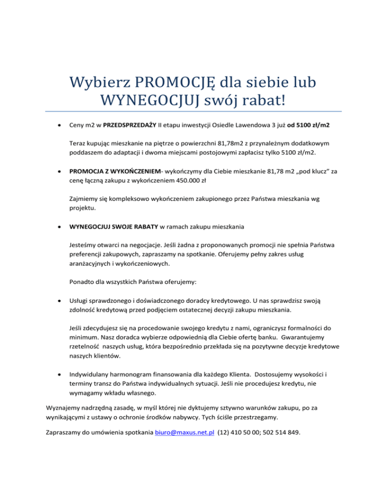 Wybierz PROMOCJĘ dla siebie lub WYNEGOCJUJ swój rabat! Ceny m2 w PRZEDSPRZEDAŻY II etapu inwestycji Osiedle Lawendowa 3 już od 5100 zł/m2 Teraz kupując mieszkanie na piętrze o powierzchni 81,78m2 z przynależnym dodatkowym poddaszem do adaptacji i dwoma miejscami postojowymi zapłacisz tylko 5100 zł/m2. PROMOCJA Z WYKOŃCZENIEM- wykończymy dla Ciebie mieszkanie 81,78 m2 „pod klucz” za cenę łączną zakupu z wykończeniem 450.000 zł Zajmiemy się kompleksowo wykończeniem zakupionego przez Państwa mieszkania wg projektu. WYNEGOCJUJ SWOJE RABATY w ramach zakupu mieszkania Jesteśmy otwarci na negocjacje. Jeśli żadna z proponowanych promocji nie spełnia Państwa preferencji zakupowych, zapraszamy na spotkanie. Oferujemy pełny zakres usług aranżacyjnych i wykończeniowych. Ponadto dla wszystkich Państwa oferujemy: Usługi sprawdzonego i doświadczonego doradcy kredytowego. U nas sprawdzisz swoją zdolność kredytową przed podjęciem ostatecznej decyzji zakupu mieszkania. Jeśli zdecydujesz się na procedowanie swojego kredytu z nami, ograniczysz formalności do minimum. Nasz doradca wybierze odpowiednią dla Ciebie ofertę banku. Gwarantujemy rzetelność naszych usług, która bezpośrednio przekłada się na pozytywne decyzje kredytowe naszych klientów. Indywidulany harmonogram finansowania dla każdego Klienta. Dostosujemy wysokości i terminy transz do Państwa indywidualnych sytuacji. Jeśli nie procedujesz kredytu, nie wymagamy wkładu własnego. Wyznajemy nadrzędną zasadę, w myśl której nie dyktujemy sztywno warunków zakupu, po za wynikającymi z ustawy o ochronie środków nabywcy. Tych ściśle przestrzegamy. Zapraszamy do umówienia spotkania [email protected] (12) 410 50 00; 502 514 849.