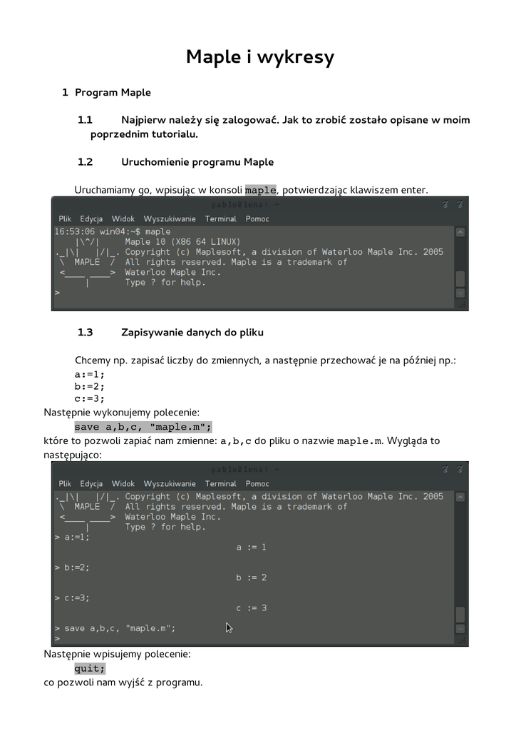 które to pozwoli zapiać nam zmienne: a,b,c do pliku o nazwie maple.m. Wygląda to