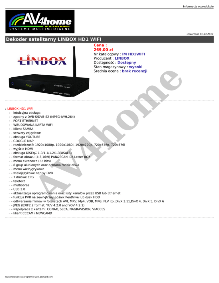 Informacje o produkcie Utworzono 01-03-2017 Dekoder satelitarny LINBOX HD1 WIFI Cena : 269,00 zł ● om e Nr katalogowy : IM HD1WIFI Producent : LINBOX Dostępność : Dostępny Stan magazynowy : wysoki Średnia ocena : brak recenzji LINBOX HD1 WIFI - intuicyjna obsługa - zgodny z DVB-S/DVB-S2 (MPEG-IV/H.264) - PORT ETHERNET - WBUDOWANA KARTA WIFI - Klient SAMBA - serwery zdjęciowe - obsługa YOUTUBE - GOOGLE MAP - rozdzielczość: 1920x1080p, 1920x1080i, 1920x720p, 720x576p, 720x576i - wyjście HDMI - obsługa DiSEqC 1.0/1.1/1.2/1.3(USALS) - format obrazu (4:3,16:9) PAN&SCAN lub Letter BOX - menu ekranowe (32 bits) - 8 grup ulubionych oraz ochrona rodzicielska - menu wielojęzykowe - wielojęzykowe napisy DVB - 7 dniowe EPG - teletext - multiobraz - USB 2.0 - aktualizacja oprogramowania oraz listy kanałów przez USB lub Ethernet - funkcja PVR na zewnętrzny nośnik PenDrive lub dysk HDD - odtwarzanie filmów w formatach AVI, MKV, Mp4, VOB, MPG, FLV itp.,DivX 3.11,DivX 4, DivX 5, DivX 6 - JPEG (EXIF2.2 format, YUV 4:2:0 and YOV 4:2:2) - współpraca z kartami: CONAX, SECA, NAGRAVISION, VIACCES - klient CCCAM i NEWCAMD ❍ ❍ ❍ ❍ ❍ 4h ❍ ❍ ❍ ❍ ❍ ❍ ❍ ❍ ❍ ❍ ❍ ❍ ❍ ❍ ❍ ❍ ❍ AV ❍ ❍ ❍ ❍ Wygenerowano w programie www.oscGold.com