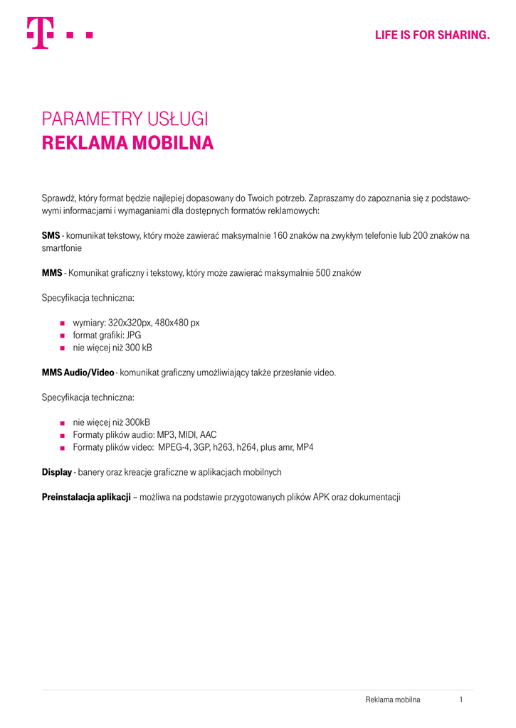life is for sharing. PARAMETRY USŁUGI reklama mobilna Sprawdź, który format będzie najlepiej dopasowany do Twoich potrzeb. Zapraszamy do zapoznania się z podstawowymi informacjami i wymaganiami dla dostępnych formatów reklamowych: SMS - komunikat tekstowy, który może zawierać maksymalnie 160 znaków na zwykłym telefonie lub 200 znaków na smartfonie MMS - Komunikat graficzny i tekstowy, który może zawierać maksymalnie 500 znaków Specyfikacja techniczna: wymiary: 320x320px, 480x480 px format grafiki: JPG nie więcej niż 300 kB MMS Audio/Video - komunikat graficzny umożliwiający także przesłanie video. Specyfikacja techniczna: nie więcej niż 300kB Formaty plików audio: MP3, MIDI, AAC Formaty plików video: MPEG-4, 3GP, h263, h264, plus amr, MP4 Display - banery oraz kreacje graficzne w aplikacjach mobilnych Preinstalacja aplikacji – możliwa na podstawie przygotowanych plików APK oraz dokumentacji Reklama mobilna 1