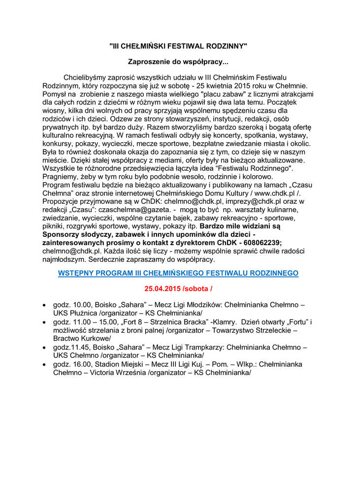 "III CHEŁMIŃSKI FESTIWAL RODZINNY" Zaproszenie do współpracy... Chcielibyśmy zaprosić wszystkich udziału w III Chełmińskim Festiwalu Rodzinnym, który rozpoczyna się już w sobotę - 25 kwietnia 2015 roku w Chełmnie. Pomysł na zrobienie z naszego miasta wielkiego "placu zabaw" z licznymi atrakcjami dla całych rodzin z dziećmi w różnym wieku pojawił się dwa lata temu. Początek wiosny, kilka dni wolnych od pracy sprzyjają wspólnemu spędzeniu czasu dla rodziców i ich dzieci. Odzew ze strony stowarzyszeń, instytucji, redakcji, osób prywatnych itp. był bardzo duży. Razem stworzyliśmy bardzo szeroką i bogatą ofertę kulturalno rekreacyjną. W ramach festiwali odbyły się koncerty, spotkania, wystawy, konkursy, pokazy, wycieczki, mecze sportowe, bezpłatne zwiedzanie miasta i okolic. Była to również doskonała okazja do zapoznania się z tym, co dzieje się w naszym mieście. Dzięki stałej współpracy z mediami, oferty były na bieżąco aktualizowane. Wszystkie te różnorodne przedsięwzięcia łączyła idea “Festiwalu Rodzinnego". Pragniemy, żeby w tym roku było podobnie wesoło, rodzinnie i kolorowo. Program festiwalu będzie na bieżąco aktualizowany i publikowany na łamach „Czasu Chełmna” oraz stronie internetowej Chełmińskiego Domu Kultury / www.chdk.pl /. Propozycje przyjmowane są w ChDK: [email protected], [email protected] oraz w redakcji „Czasu”: czaschelmna@gazeta. - mogą to być np. warsztaty kulinarne, zwiedzanie, wycieczki, wspólne czytanie bajek, zabawy rekreacyjno - sportowe, pikniki, rozgrywki sportowe, wystawy, pokazy itp. Bardzo mile widziani są Sponsorzy słodyczy, zabawek i innych upominków dla dzieci zainteresowanych prosimy o kontakt z dyrektorem ChDK - 608062239; [email protected]. Każda ilość się liczy - możemy wspólnie sprawić chwile radości najmłodszym. Serdecznie zapraszamy do współpracy. WSTĘPNY PROGRAM III CHEŁMIŃSKIEGO FESTIWALU RODZINNEGO 25.04.2015 /sobota / godz. 10.00, Boisko „Sahara” – Mecz Ligi Młodzików: Chełminianka Chełmno – UKS Płużnica /organizator – KS Chełminianka/ godz. 11.00 – 15.00, „Fort 8 – Strzelnica Bracka” -Klamry. Dzień otwarty „Fortu” i możliwość strzelania z broni palnej /organizator – Towarzystwo Strzeleckie – Bractwo Kurkowe/ godz.11.45, Boisko „Sahara” – Mecz Ligi Trampkarzy: Chełminianka Chełmno – UKS Chełmno /organizator – KS Chełminianka/ godz. 16.00, Stadion Miejski – Mecz III Ligi Kuj. – Pom. – Wlkp.: Chełminianka Chełmno – Victoria Września /organizator – KS Chełminianka/ 26.04.2015 /niedziela/ Czekamy na propozycje. 27.04.2015 /poniedziałek/ Czekamy na propozycje. 28.04.2015 /wtorek/ godz. 15.00 – 17.30, Kościół PW WNMP - Fara. Bezpłatne wejście na taras widokowy. 29.04.2015 /środa/ godz. 11.00, Niepubliczne Przedszkole „Brzdąc” – „Dzień Pasji i Talentów”. Okazja do zaprezentowania i podzielenia się z innymi swoim talentem lub pasją. Szczegóły: [email protected] lub pod numerem tel. 0-56 679 05 30; kom. 600 941 349 /organizator – Niepubliczne Przedszkole „Brzdąc”/ godz. 11.00, Zespół Szkół Centrum Kształcenia Praktycznego w Grubnie – rozstrzygnięcie I edycji konkursu plastycznego i fotograficznego dofinansowanego ze środków Województwa Kujawsko-Pomorskiego „W POSZUKIWANIU NAJPIĘKNIEJSZEGO KRAJOBRAZU ZIEMI CHEŁMIŃSKIEJ” połączone z prezentacją potraw laureatów szkolnego konkursu zawodów żywieniowych związanego z kuchnią regionalną. 30.04.2015/czwartek/ Czekamy na propozycje. 1.05.2015 /piątek/ godz. 7.00, Żurawia Kępa /Wisła/ - „Otwarcie sezonu wędkarskiego” /organizator – Koło Wędkarskie „Record” przy ChDK/ godz. 10.00 – 16.00, Muzeum Ziemi Chełmińskiej – Możliwość zwiedzania wystawy czasowej i wystaw stałych /organizator – Muzeum Ziemi Chełmińskiej/ godz. 10.30, zbiórka przed Ratuszem; „Spacerki po Chełmnie’ 2015” - „Pamięci Jana Pawła II” - „Chełmno miastem wielu wyznań” – Żydzi (teren dawnej synagogi, mykwa, cmentarz) ewangelicy (kościół podominikański, cmentarz poewangelicki), katolicy (m.in. kościół pofranciszkański). Przewodnik : Anna Grzeszna – Kozikowska godz. 11.00, Boisko Sportowe „Orlik”, al. 3 Maja - "FRISBEE DAY" gry i zabawy przygotowane dla dzieci, młodzieży i dorosłych /organizator – „Nine Hills” Chełmno/ 2.05.2015 /sobota/ godz. 10.00 – 16.00, Muzeum Ziemi Chełmińskiej – Możliwość zwiedzania wystawy czasowej i wystaw stałych /organizator – Muzeum Ziemi Chełmińskiej/ godz. 11.00 – 14.00, Park Nowe Planty – „ZABAWY W DNIU FLAGI”. Zapraszamy do udziału w zabawach znanych z podwórka i szkolnego boiska m.in. grę w kapsle, zabawy z chustą, bierki, rysowanie kredą, grę w chłopka, bańki mydlane, szachy czy malowanie twarzy /organizator - Czas Chełmna/. godz. 14.15, Park Nowe Planty – koncert orkiestry z Kolegium Sztuki w Mińsku na Białorusi /organizator – Stowarzyszenie Kultury Ludowej „Kundzia”/ 3.05.2015 /niedziela/ godz. 7.00 – 12.00, Nowe Dobra /Wisła/ – „Otwarte Spinningowe Zawody Wędkarskie o Mistrzostwo Koła i Puchar Dyrektora ChDK” /organizator – Koło Wędkarskie „Record” przy ChDK, zapisy – Sklep Wędkarski „Sukces”, ul. Dworcowa 11/ godz. 10.00 – 16.00, Muzeum Ziemi Chełmińskiej – Możliwość zwiedzania wystawy czasowej i wystaw stałych /organizator – Muzeum Ziemi Chełmińskiej/ godz. 10.30, zbiórka przed Ratuszem; „Spacerki po Chełmnie’ 2015” - „Dzieje garnizonu chełmińskiego” - Grób Nieznanego Żołnierza, koszary przy Al. 3 Maja, Pomnik Żołnierzy Armii Czerwonej, kościół garnizonowy, koszary przy ul. Biskupiej. Przewodnik – Władysław Flieger godz. 11.00 - Grób Nieznanego Żołnierza - uroczystość złożenia wiązanek kwiatów z udziałem kompanii honorowej z ok. Rocznicy Uchwalenia Konstytucji 3 Maja. „OTWARTE MISTRZOSTWA MAŻORETEK 