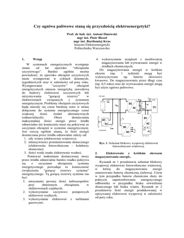 Czy ogniwa paliwowe staną się przyszłością elektroenergetyki? Prof. dr hab. inż. Antoni Dmowski mgr inż. Piotr Biczel mgr inż. Bartłomiej Kras Instytut Elektroenergetyki Politechnika Warszawska 1. Wstęp W systemach energetycznych występuje znane od lat zjawisko “obciążenia szczytowego”. Bardzo ogólnie można powiedzieć, że zjawisko obciążeń szczytowych może występować w cyklach dziennych, tygodniowych oraz w zależności od pory roku. Występowanie “szczytów” obciążeń energetycznych zmusza energetykę zawodową do budowy elektrowni szczytowych lub utrzymywania “gorącej rezerwy” w elektrowniach związanych z systemem energetycznym. Problemy obciążeń szczytowych będą stawały się coraz bardziej ostre w miarę dołączone do systemu energetycznego coraz większej ilości źródeł alternatywnych (odnawialnych). Okres dostarczania maksymalnej ilości energii przez źródła odnawialne nie koniecznie musi się pokrywać ze szczytami obciążeń w systemie energetycznym. Jest rzeczą ogólnie znaną, że ilość energii dostarczana przez źródła odnawialne zależy od: 1. siły wiatru (elektrownie wiatrowe); 2. intensywności promieniowania słonecznego (elektrownie fotowoltaiczne – kolektory słoneczne); 3. ilości wody (małe elektrownie wodne). Ponieważ maksimum dostarczonej mocy przez źródła odnawialne bardzo rzadko pokrywa się z szczytami obciążenia systemu energetycznego powoduje to konieczność zwiększenia “gorącej rezerwy systemu” energetycznego. Tą gorącą rezerwę systemu ma być: 1. utrzymanie pewnej ilości turbozespołów przy obniżonym obciążeniu w elektrowniach cieplnych; 2. wykorzystanie szczytowo pompowych elektrowni wodnych; 3. wykorzystanie elektrowni z turbinami gazowymi; 4. wykorzystanie urządzeń z możliwością magazynowania lub wytwarzanie energii w źródłach chemicznych; Do magazynowania energii w krótkim okresie (np. 1 tydzień) mogą być wykorzystywane np. baterie ołowiowo kwasowe. Do magazynowania przez długi czas (np. 0,5 roku) oraz do wytwarzania energii mogą być użyte ogniwa paliwowe. Rys. 1. Schemat blokowy wyspowej elektrowni fotowoltaiczno wiatrowej. 2. Elektrownie z krótkim magazynowania energii.. okresem Rysunek nr 1 przedstawia schemat blokowy wyspowej elektrowni fotowoltaiczno wiatrowej, w której do magazynowania energii zastosowano baterię chemiczną (żelową). Użyta w tym przypadku bateria chemiczna służy do pokrycia zapotrzebowania energetycznego odbiornika w przypadku braku oświetlenia słonecznego lub braku wiatru. Rysunek nr 2 przedstawia ilość energii produkowanej w opisywanej elektrowni wyspowej w zależności od pory roku. 3. Ogniwo paliwowe jako długo okresowy magazyn energii elektrycznej 1. 60 1. 40 1. 20 1. 00 0. 80 0. 60 0. 40 0. 20 0. 00 Rys. 2. Produkcja energii elektrycznej ze słonecznej w roku. Na podstawie analizy rysunku nr 2 można zauważyć, że w miesiącach zimowych wystąpi deficyt energii. Rozwiązanie tego problemu może nastąpić w wyniku zastosowania innego magazynu energii elektrycznej o długim czasie przechowywania. Rysunek nr 3 przedstawia schemat blokowy urządzenia energetycznego, które zaczyna być stosowane w krajach wysoko rozwiniętych (USA, Niemcy, Japonia, Wlk. Brytania, Kanada) do ograniczenia obciążeń szczytowych w systemach energetycznych. Rys. 3. Schemat blokowy zasobnika energii. Przedstawione na schemacie (rys. 3.) urządzenie – zwane często zasobnikiem energii– pobiera energię z systemu w czasie doliny obciążenia. Energia ta jest następnie magazynowana w baterii chemicznej (ołowiowej). W czasie szczytu obciążenia energia ta przez przetwornicę DC/AC jest przekazywana do sieci energetycznej. Ze względu na użyty magazyn energii układ nadaje się do wyrównywania obciążeń systemu energetycznego w cyklu dobowym lub tygodniowym. W cyklu długo okresowym np. 1 miesiąc ÷ 5 miesięcy duża ilość energii magazynowanej w baterii w baterii chemicznej jest tracona. Powoduje to, że opisane urządzenie nie spełnia swojego zadania. Magazynowanie energii od lat jest problem, nad którym pracują zespoły inżynierów i naukowców z całego świata. Zmagazynowanie dużej lub bardzo dużej ilości energii na długi czas pozwoli na rozwój wielu dziedzin techniki (np. pchnie przemysł motoryzacyjny na drogę pojazdu elektrycznego). Poszukuje się rozwiązania tego problemu przez rozwój technologii baterii chemicznych różnych rodzajów, budowę układów akumulatorów mechanicznych tzw. wirujących kół lub budowę superkondensatorów. Wszystkie te techniki nie pozwalają na dłuższe przechowywanie bardzo dużych ilości energii. Nie spełnią więc opisanych wyżej wymagań wyrównywania mocy w systemie energetycznym. Poszukiwanie źródeł energii o bardzo dużej gęstości mocy na potrzeby programów kosmicznych zwróciło uwagę badaczy na wynalazek Wiliama Grove’a z 1837 r. – ogniwo paliwowe. Bezpośrednią przyczyną tego stało się wynalezienie efektywnego elektrolitu niezbędnego do pracy tego urządzenia. W konsekwencji rozwijano technologię wytwarzania i przechowywania wodoru. Dzisiaj wielu specjalistów od przechowywania i wytwarzania energii elektrycznej upatruje w technologii wodorowej przyszłości energetyki. Wynika to z kilku przesłanek: • nieograniczonych zasobów wodoru; • braku emisji szkodliwych związków; • wysokiej sprawności wytwarzania energii z wodoru; • łatwości magazynowania wodoru; • dużej dynamiki układów wytwarzania energii; • możliwości budowy wysokosprawnych małych siłowni. 3.1. Zasada działania ogniwa paliwowego Działanie ogniwa paliwowego opiera się na reakcji syntezy wody na drodze elektrochemicznego “spalania” wodoru, czyli na odwróconej elektrolizie wody. Budowę ogniwa paliwowego prezentuje rysunek nr 4. Anoda i katoda rozdzielone są przez elektrolit, który przepuszcza tylko dodatnio naładowane jony wodoru H+ – protony. Elektro