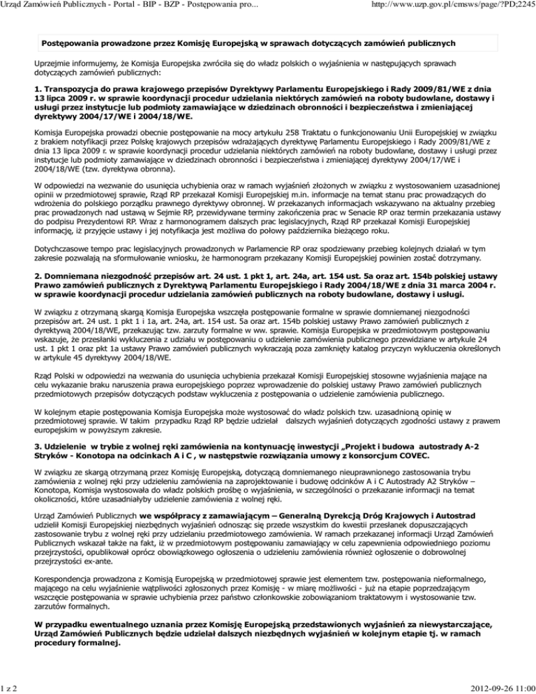 Urząd Zamówień Publicznych - Portal - BIP - BZP - Postępowania pro... 1z2 http://www.uzp.gov.pl/cmsws/page/?PD;2245 Postępowania prowadzone przez Komisję Europejską w sprawach dotyczących zamówień publicznych Uprzejmie informujemy, że Komisja Europejska zwróciła się do władz polskich o wyjaśnienia w następujących sprawach dotyczących zamówień publicznych: 1. Transpozycja do prawa krajowego przepisów Dyrektywy Parlamentu Europejskiego i Rady 2009/81/WE z dnia 13 lipca 2009 r. w sprawie koordynacji procedur udzielania niektórych zamówień na roboty budowlane, dostawy i usługi przez instytucje lub podmioty zamawiające w dziedzinach obronności i bezpieczeństwa i zmieniającej dyrektywy 2004/17/WE i 2004/18/WE. Komisja Europejska prowadzi obecnie postępowanie na mocy artykułu 258 Traktatu o funkcjonowaniu Unii Europejskiej w związku z brakiem notyfikacji przez Polskę krajowych przepisów wdrażających dyrektywę Parlamentu Europejskiego i Rady 2009/81/WE z dnia 13 lipca 2009 r. w sprawie koordynacji procedur udzielania niektórych zamówień na roboty budowlane, dostawy i usługi przez instytucje lub podmioty zamawiające w dziedzinach obronności i bezpieczeństwa i zmieniającej dyrektywy 2004/17/WE i 2004/18/WE (tzw. dyrektywa obronna). W odpowiedzi na wezwanie do usunięcia uchybienia oraz w ramach wyjaśnień złożonych w związku z wystosowaniem uzasadnionej opinii w przedmiotowej sprawie, Rząd RP przekazał Komisji Europejskiej m.in. informacje na temat stanu prac prowadzących do wdrożenia do polskiego porządku prawnego dyrektywy obronnej. W przekazanych informacjach wskazywano na aktualny przebieg prac prowadzonych nad ustawą w Sejmie RP, przewidywane terminy zakończenia prac w Senacie RP oraz termin przekazania ustawy do podpisu Prezydentowi RP. Wraz z harmonogramem dalszych prac legislacyjnych, Rząd RP przekazał Komisji Europejskiej informację, iż przyjęcie ustawy i jej notyfikacja jest możliwa do połowy października bieżącego roku. Dotychczasowe tempo prac legislacyjnych prowadzonych w Parlamencie RP oraz spodziewany przebieg kolejnych działań w tym zakresie pozwalają na sformułowanie wniosku, że harmonogram przekazany Komisji Europejskiej powinien zostać dotrzymany. 2. Domniemana niezgodność przepisów art. 24 ust. 1 pkt 1, art. 24a, art. 154 ust. 5a oraz art. 154b polskiej ustawy Prawo zamówień publicznych z Dyrektywą Parlamentu Europejskiego i Rady 2004/18/WE z dnia 31 marca 2004 r. w sprawie koordynacji procedur udzielania zamówień publicznych na roboty budowlane, dostawy i usługi. W związku z otrzymaną skargą Komisja Europejska wszczęła postępowanie formalne w sprawie domniemanej niezgodności przepisów art. 24 ust. 1 pkt 1 i 1a, art. 24a, art. 154 ust. 5a oraz art. 154b polskiej ustawy Prawo zamówień publicznych z dyrektywą 2004/18/WE, przekazując tzw. zarzuty formalne w ww. sprawie. Komisja Europejska w przedmiotowym postępowaniu wskazuje, że przesłanki wykluczenia z udziału w postępowaniu o udzielenie zamówienia publicznego przewidziane w artykule 24 ust. 1 pkt 1 oraz pkt 1a ustawy Prawo zamówień publicznych wykraczają poza zamknięty katalog przyczyn wykluczenia określonych w artykule 45 dyrektywy 2004/18/WE. Rząd Polski w odpowiedzi na wezwania do usunięcia uchybienia przekazał Komisji Europejskiej stosowne wyjaśnienia mające na celu wykazanie braku naruszenia prawa europejskiego poprzez wprowadzenie do polskiej ustawy Prawo zamówień publicznych przedmiotowych przepisów dotyczących podstaw wykluczenia z postępowania o udzielenie zamówienia publicznego. W kolejnym etapie postępowania Komisja Europejska może wystosować do władz polskich tzw. uzasadnioną opinię w przedmiotowej sprawie. W takim przypadku Rząd RP będzie udzielał dalszych wyjaśnień dotyczących zgodności ustawy z prawem europejskim w powyższym zakresie. 3. Udzielenie w trybie z wolnej ręki zamówienia na kontynuację inwestycji „Projekt i budowa autostrady A-2 Stryków - Konotopa na odcinkach A i C , w następstwie rozwiązania umowy z konsorcjum COVEC. W związku ze skargą otrzymaną przez Komisję Europejską, dotyczącą domniemanego nieuprawnionego zastosowania trybu zamówienia z wolnej ręki przy udzieleniu zamówienia na zaprojektowanie i budowę odcinków A i C Autostrady A2 Stryków – Konotopa, Komisja wystosowała do władz polskich prośbę o wyjaśnienia, w szczególności o przekazanie informacji na temat okoliczności, które uzasadniałyby udzielenie zamówienia z wolnej ręki. Urząd Zamówień Publicznych we współpracy z zamawiającym – Generalną Dyrekcją Dróg Krajowych i Autostrad udzielił Komisji Europejskiej niezbędnych wyjaśnień odnosząc się przede wszystkim do kwestii przesłanek dopuszczających zastosowanie trybu z wolnej ręki przy udzielaniu przedmiotowego zamówienia. W ramach przekazanej informacji Urząd Zamówień Publicznych wskazał także na fakt, iż w przedmiotowym postępowaniu zamawiający w celu zapewnienia odpowiedniego poziomu przejrzystości, opublikował oprócz obowiązkowego ogłoszenia o udzieleniu zamówienia również ogłoszenie o dobrowolnej przejrzystości ex-ante. Korespondencja prowadzona z Komisją Europejską w przedmiotowej sprawie jest elementem tzw. postępowania nieformalnego, mającego na celu wyjaśnienie wątpliwości zgłoszonych przez Komisję - w miarę możliwości - już na etapie poprzedzającym wszczęcie postępowania w sprawie uchybienia przez państwo członkowskie zobowiązaniom traktatowym i wystosowanie tzw. zarzutów formalnych. W przypadku ewentualnego uznania przez Komisję Europejską przedstawionych wyjaśnień za niewystarczające, Urząd Zamówień Publicznych będzie udzielał dalszych niezbędnych wyjaśnień w kolejnym etapie tj. w ramach procedury formalnej. 2012-09-26 11:00 Urząd Zamówień Publicznych - Portal - BIP - BZP - Postępowania pro... 2z2 http://www.uzp.gov.pl/cmsws/page/?PD;2245 wytworzy