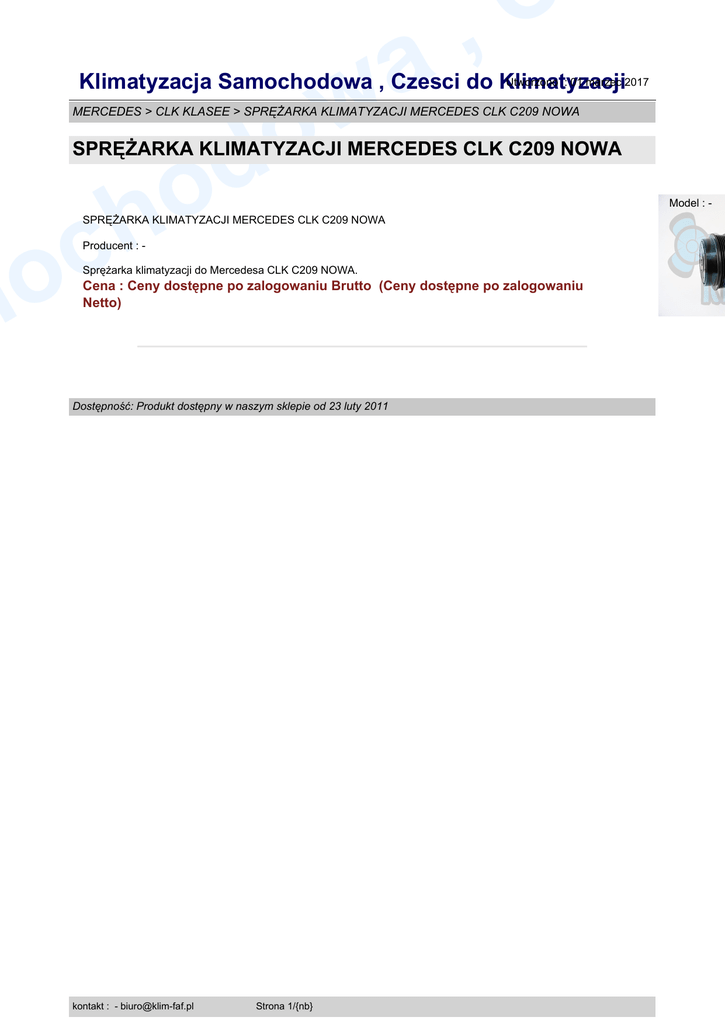 w o d o h , a Utworzono : 01 marzec 2017 Klimatyzacja Samochodowa , Czesci do Klimatyzacji MERCEDES > CLK KLASEE > SPRĘŻARKA KLIMATYZACJI MERCEDES CLK C209 NOWA SPRĘŻARKA KLIMATYZACJI MERCEDES CLK C209 NOWA c o m SPRĘŻARKA KLIMATYZACJI MERCEDES CLK C209 NOWA Producent : - Sprężarka klimatyzacji do Mercedesa CLK C209 NOWA. Cena : Ceny dostępne po zalogowaniu Brutto (Ceny dostępne po zalogowaniu Netto) Dostępność: Produkt dostępny w naszym sklepie od 23 luty 2011 kontakt : - [email protected] Strona 1/{nb} Model : -
