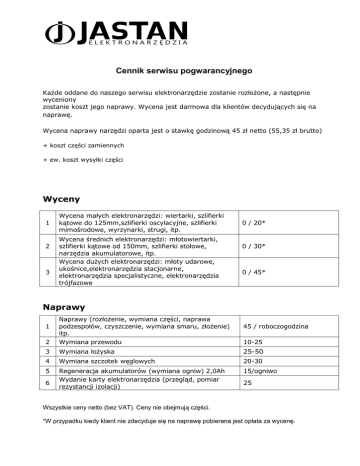 Cennik serwisu pogwarancyjnego Każde oddane do naszego serwisu elektronarzędzie zostanie rozłożone, a następnie wyceniony zostanie koszt jego naprawy. Wycena jest darmowa dla klientów decydujących się na naprawę. Wycena naprawy narzędzi oparta jest o stawkę godzinową 45 zł netto (55,35 zł brutto) + koszt części zamiennych + ew. koszt wysyłki części Wyceny 1 2 3 Wycena małych elektronarzędzi: wiertarki, szlifierki kątowe do 125mm,szlifierki oscylacyjne, szlifierki mimośrodowe, wyrzynarki, strugi, itp. Wycena średnich elektronarzędzi: młotowiertarki, szlifierki kątowe od 150mm, szlifierki stołowe, narzędzia akumulatorowe, itp. Wycena dużych elektronarzędzi: młoty udarowe, ukośnice,elektronarzędzia stacjonarne, elektronarzędzia specjalistyczne, elektronarzędzia trójfazowe 0 / 20* 0 / 30* 0 / 45* Naprawy 2 Naprawy (rozłożenie, wymiana części, naprawa podzespołów, czyszczenie, wymiana smaru, złożenie) itp. Wymiana przewodu 3 Wymiana łożyska 25-50 4 Wymiana szczotek węglowych 20-30 5 Regeneracja akumulatorów (wymiana ogniw) 2,0Ah Wydanie karty elektronarzędzia (przegląd, pomiar rezystancji izolacji) 15/ogniwo 1 6 45 / roboczogodzina 10-25 25 Wszystkie ceny netto (bez VAT). Ceny nie obejmują części. *W przypadku kiedy klient nie zdecyduje się na naprawę pobierana jest opłata za wycenę.