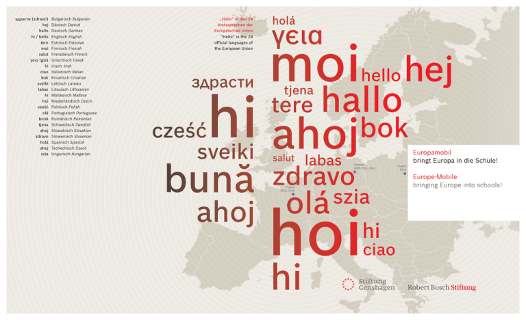 здрасти (sdrasti) Bulgarisch Bulgarian hejDänisch Danish halloDeutsch German hi / hello Englisch English tereEstnisch Estonian moiFinnisch Finnish salutFranzösisch French γεια (gia)Griechisch Greek hi Irisch Irish ciao Italienisch Italian bokKroatisch Croatian sveiki Lettisch Latvian labas Litauisch Lithuanian hi Maltesisch Maltese hoi Niederländisch Dutch cześć Polnisch Polish olá Portugisisch Portuguese bună Rumänisch Romanian tjena Schwedisch Swedish ahoj Slowakisch Slovakian zdravo Slowenisch Slovenian holá Spanisch Spanish ahoj Tschechisch Czech szia Ungarisch Hungarian „Hallo“ in den 24 Amtssprachen der Europäischen Union “Hello” in the 24 official languages of the European Union Germany 2009, 2011, 2013 France 2010, 2014 Europamobil bringt Europa in die Schule! Poland 2012 Europe-Mobile bringing Europe into schools! Einleitung Introduction „Schon vor meiner Teilnahme an Europamobil war ich überzeugt von der EU und glaubte an die internationale Zusammenarbeit. Das Projekt aber stärkte meinen Wunsch, auch andere Menschen dafür zu begeistern. Ich denke, dass es besonders wichtig ist, jungen Leuten die Vorteile eines vereinten Europas bewusst zu machen. “ “I believed in the EU and in international cooperation before I participated in Europe-Mobile. What the project did, was make me want to spread this enthusiasm among other people. I think that it is especially important to make young people aware of the benefits of a united Europe.” Noemi Alonso Cid Studentin, Spanien Student, Spain Die Errungenschaften der Europäischen Union (Binnenmarkt, politische Zusammenarbeit und gemeinsame Währung) werden in der öffentlichen Wahrnehmung allzu oft als Selbstverständlichkeit betrachtet. Zugleich stehen viele Bürger und die junge Generation einer immer stärkeren Vertiefung der europäischen Integration kritisch gegenüber. Um dieser skeptischen Stimmung etwas entgegenzusetzen, haben die Stiftung Genshagen und die Robert Bosch Stiftung im Jahr 2009 das Projekt Europamobil ins Leben gerufen. In einem innovativen und zugleich spielerischen Arbeitsprozess erfahren Schüler und Studenten, dass das europäische Modell keine abstrakte Idee ist. Europamobil offenbart die großen Chancen, die Europa jungen Menschen in beruflicher und persönlicher Hinsicht bietet. Unser Projekt ist ein Beweis dafür, dass viele Jugendliche bereit sind, für Europa einzutreten: Jedes Jahr kommt eine Studentengruppe in ihrer Freizeit in ein anderes Land, um Schülern die europäische Idee zu vermitteln. So fördert Europamobil das Engagement für Europa bei der jungen Generation, von der die Fortsetzung der Erfolgsgeschichte der europäischen Integration abhängen wird. Dr. Martin Koopmann Geschäftsführendes Vorstandsmitglied Stiftung Genshagen Executive Director, Genshagen Foundation Europamobil 2012 in Polen Europe-Mobile 2012 in Poland 1 In the public perception, the achievements of the European Union (the domestic market, political cooperation and the common currency) are all too often taken for granted. At the same time, ever deeper integration is seen very critically by many citizens and the younger generation. To counter this indifference, the Genshagen Foundation and the Robert Bosch Stiftung launched the project Europe-Mobile in 2009. Our goal is to introduce pupils and students by an innovative and playful process to the idea that the European model is not just an abstract concept. Europe-Mobile puts its focus on the great opportunities that Europe offers them with regard to career and personality. Our project is proof that lots of young people are ready and willing to stand up for Europe: every year 20 students meet and spend their free time together in a different European country in order to share the European idea with young pupils. Europe-Mobile encourages commitment to and involvement with Europe within the younger generation, on which the successful continuation of European integration will depend. Professor Dr. Joachim Rogall Geschäftsführer Robert Bosch Stiftung Executive Director, Robert Bosch Stiftung Member of the Board of Management 2 Europamobil – bringt Europa in die Schulen! Europe-Mobile: Bringing Europe into schools! Europamobil macht Europa greifbar: Jugendliche können die europäische Integration hautnah erfahren, entdecken Gemeinsamkeiten mit anderen Europäern und entwickeln ein Verständnis füreinander. Europe-Mobile makes Europe palpable: young people can experience European integration first-hand, discover similarities with other Europeans and develop an understanding for each other. Das Projekt richtet sich an Schüler und Studenten. 20 Studenten aus Ländern der EU besuchen Schulen einer Region Europas, um mit Schülern im Alter von 13 bis 16 Jahren Workshops zu europäischen Fragen zu veranstalten. In den Workshops und einer Infomesse lernen die Schüler, was die EU ist und welche Möglichkeiten sie ihnen bietet. Europe-Mobile is a project directed at university students and pupils. 20 students from various countries of the European Union visit schools in a European region to offer workshops on European issues for pupils aged between 13 and 16. During the workshops and the info-fair pupils learn what the European Union is about and what it has to offer them. Europamobil ist ein gemeinsames Projekt der Stiftung Genshagen und der Robert Bosch Stiftung, gefördert wird es von der Robert Bosch Stiftung und dem Land Brandenburg. Europe-Mobile is a joint project of the Genshagen Foundation and the Robert Bosch Stiftung, funded by the Robert Bosch Stiftung and the state of Brandenburg. Die bisherigen und geplanten Stationen von Europamobil: :: Brandenburg (2009, 2011, 2013) :: Region Île-de-France, Frankreich (2010, 2014) :: Region Masowien, Polen (2012) Past and future Europe-Mobile stations: :: Brandenburg, Germany (2009, 2011, 2013) :: Île-de-France, France (2010, 2014) :: Mazovia, Poland (2012) Aus allen Teilen Europas reisen die Stud