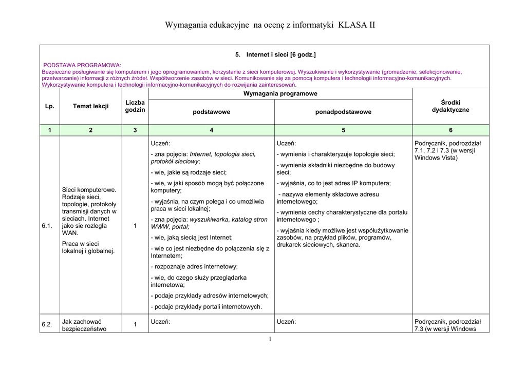 Wymagania edukacyjne na ocenę z informatyki KLASA II 5. Internet i sieci [6 godz.] PODSTAWA PROGRAMOWA: Bezpieczne posługiwanie się komputerem i jego oprogramowaniem, korzystanie z sieci komputerowej. Wyszukiwanie i wykorzystywanie (gromadzenie, selekcjonowanie, przetwarzanie) informacji z różnych źródeł. Współtworzenie zasobów w sieci. Komunikowanie się za pomocą komputera i technologii informacyjno-komunikacyjnych. Wykorzystywanie komputera i technologii informacyjno-komunikacyjnych do rozwijania zainteresowań. Wymagania programowe Lp. Temat lekcji Liczba godzin 1 2 3 podstawowe ponadpodstawowe Środki dydaktyczne 4 5 6 Uczeń: Uczeń: - zna pojęcia: Internet, topologia sieci, protokół sieciowy; - wymienia i charakteryzuje topologie sieci; - wymienia składniki niezbędne do budowy sieci; - wie, jakie są rodzaje sieci; 6.1. Sieci komputerowe. Rodzaje sieci, topologie, protokoły transmisji danych w sieciach. Internet jako sie rozległa WAN. - wie, w jaki sposób mogą być połączone komputery; - wyjaśnia, co to jest adres IP komputera; - nazywa elementy składowe adresu internetowego; - wyjaśnia, na czym polega i co umożliwia praca w sieci lokalnej; 1 - wymienia cechy charakterystyczne dla portalu internetowego ; - zna pojęcia: wyszukiwarka, katalog stron WWW, portal; - wie, jaką siecią jest Internet; Praca w sieci lokalnej i globalnej. Podręcznik, podrozdział 7.1, 7.2 i 7.3 (w wersji Windows Vista) - wie co jest niezbędne do połączenia się z Internetem; - wyjaśnia kiedy możliwe jest współużytkowanie zasobów, na przykład plików, programów, drukarek sieciowych, skanera. - rozpoznaje adres internetowy; - wie, do czego służy przeglądarka internetowa; - podaje przykłady adresów internetowych; - podaje przykłady portali internetowych. 6.2. Jak zachować bezpieczeństwo 1 Uczeń: Uczeń: 1 Podręcznik, podrozdział 7.3 (w wersji Windows podczas rozmów w sieci? Zagrożenia i korzyści wynikające z korzystania z Internetu. - dokładnie wymienia zasady zapewniające bezpieczeństwo w sieci; - wie, na czym polega rozmowa w sieci; - dostrzega pozytywne i negatywne skutki korzystania z Internetu; XP) i 7.4 (w wersji Windows Vista) - wymienia narzędzia do prowadzenia rozmów w sieci; - przestrzega podstawowych zasad dotyczących zachowania bezpieczeństwa podczas rozmów w sieci; - potrafi uzasadnić, dlaczego należy zachować ostrożność podczas korzystania z Internetu. - wymienia korzyści wynikające z korzystania z Internetu. 6.3. Tworzenie dokumentu tekstowego na podstawie informacji z Internetu. 1 Uczeń: Uczeń: - potrafi wyszukać w sieci określone informacje; - potrafi uściślić poszukiwania określonych treści w sieci; - wie, jak kopiować, wklejać i formatować teksty i obrazy wyszukane w Internecie; - określa, jakie informacje z Internetu można kopiować, powielać, rozprowadzać zgodnie z prawem autorskim. - tworzy dokument tekstowy na podstawie informacji znalezionych w Internecie; - wie, jak utworzyć dokument na podstawie informacji zaczerpniętych z sieci, aby nie naruszyć prawa autorskiego. - umie zapisać stronę WWW; - wie, w jaki sposób skopiować lub zapisać obraz z wyszukanej strony WWW. - formatuje informacje i obrazy pobrane z sieci. 2 Podręcznik, podrozdział 7.3.1 (w wersji Windows XP) i 7.4.1 (w wersji Windows Vista) Uczeń: Uczeń: - rozumie i wyjaśnia pojęcia: usługi internetowe, poczta elektroniczna, konto e– mail, protokół FTP, telnet; - umie uzasadnić, dlaczego warto korzystać z usług internetowych; - wymienia pożytki i zagrożenia wynikające z korzystania z usług internetowych. - wymienia najbardziej powszechne usługi internetowe; Uczeń: - zna programy do rozmów w sieci; 6.4. Usługi internetowe. Zakładanie konta pocztowego. Przesyłanie i odbieranie wiadomości. - wie, jakie zasady obowiązują podczas dobierania adresu poczty elektronicznej; - wie, jakie zasady obowiązują podczas rozmów w sieci; 1 Podręcznik, podrozdział 7.3 (wersja Windows XP), 7.4 (wersja Windows Vista) Podręcznik, podrozdział 7.3 (wersja Windows XP), 7.4 (wersja Windows Vista) - potrafi wysłać i odebrać list z załącznikiem; - wie na czym polega e-praca, e-nauka, działalność e-banku. - wie, jak korzystać z opcji „odpowiedz”; - umie korzystać z książki adresowej. Uczeń: - rozumie i wyjaśnia pojęcia: poczta elektroniczna, konto e - mail; - umie założyć własne konto e -mail; - wie jak odbierać i jak wysyłać listy e -mail; - wie, jak korzystać z poczty elektronicznej. - wie, co powinien zawierać list elektroniczny. Uczeń: 6.5. 6.6. „Prezentacja mojego regionu” gromadzenie, selekcjonowanie i przetwarzanie informacji pochodzących z różnych źródeł. Uczeń: Podręcznik, podrozdział 7.4 (wersja Windows XP), - wie, jakie elementy i w jakiej formie ma - wykorzystuje zaawansowane opcje wybranego 7.5 (wersja Windows zaprezentować; programu do wykonania swojego opracowania; Vista) - gromadzi teksty, obrazy, zdjęcia i muzykę; - dobiera stosowny podkład muzyczny; - dobiera formę prezentacji zgromadzonych - w efektowny sposób prezentuje efekty pracy materiałów (program PowerPoint lub swojej grupy. Windows Movie Maker); 2 - tworzy opracowanie współpracując ze swoją grupą; - dołącza wyszukane elementy do swojej prezentacji; - korzysta z różnych opcji programu, w którym tworzy swoją prezentację; - wie, jak zaprezentować dorobek grupy. 3 7. Multimedia [ 6 godz.] Podstawa programowa: Wyszukiwanie i wykorzystywanie (gromadzenie, selekcjonowanie, przetwarzanie) informacji z różnych źródeł. Współtworzenie zasobów w sieci. Opracowywanie za pomocą komputera rysunków, tekstów, danych liczbowych, motywów, animacji, prezentacji multimedialnych. Wymagania programowe Lp. Temat lekcji Liczba godzin 1 2 3 7.1. 7.2 Prezentacje multimedialne — zasady pracy z programem PowerPoint. 2 podstawowe ponadpodstawowe Środki dydaktyczne 4 5 6 Uczeń: Uczeń: - rozumie i wyjaśni