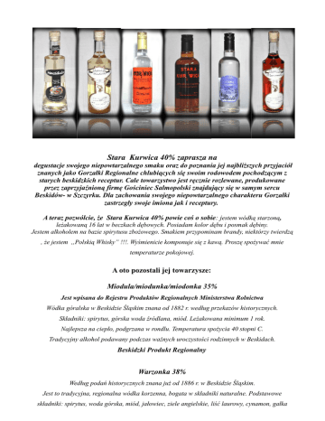 Stara Kurwica 40% zaprasza na degustacje swojego niepowtarzalnego smaku oraz do poznania jej najbliższych przyjaciół znanych jako Gorzałki Regionalne chlubiących się swoim rodowodem pochodzącym z starych beskidzkich receptur. Całe towarzystwo jest ręcznie rozlewane, produkowane przez zaprzyjaźnioną firmę Gościniec Salmopolski znajdujący się w samym sercu Beskidów- w Szczyrku. Dla zachowania swojego niepowtarzalnego charakteru Gorzałki zastrzegły swoje imiona jak i receptury. A teraz pozwólcie, że Stara Kurwica 40% powie coś o sobie: jestem wódką starzoną, leżakowaną 16 lat w beczkach dębowych. Posiadam kolor dębu i posmak dębiny. Jestem alkoholem na bazie spirytusu zbożowego. Smakiem przypominam brandy, niektórzy twierdzą , że jestem „Polskią Whisky” !!!. Wyśmienicie komponuje się z kawą. Proszę spożywać mnie temperaturze pokojowej. A oto pozostali jej towarzysze: Miodula/miodunka/miodonka 35% Jest wpisana do Rejestru Produktów Regionalnych Ministerstwa Rolnictwa Wódka góralska w Beskidzie Śląskim znana od 1882 r. według przekazów historycznych. Składniki: spirytus, górska woda źródlana, miód. Leżakowana minimum 1 rok. Najlepsza na ciepło, podgrzana w rondlu. Temperatura spożycia 40 stopni C. Tradycyjny alkohol podawany podczas ważnych uroczystości rodzinnych w Beskidach. Beskidzki Produkt Regionalny Warzonka 38% Według podań historycznych znana już od 1886 r. w Beskidzie Śląskim. Jest to tradycyjna, regionalna wódka korzenna, bogata w składniki naturalne. Podstawowe składniki: spirytus, woda górska, miód, jałowiec, ziele angielskie, liść laurowy, cynamon, gałka muszkatułowa, pieprz, papryka, wanilia, karmel, sól, dziwięciosił. Leżakowana minimum 1,5 roku. Można ją przygotowywać na kilka sposobów. W procesie podgrzewania w rondlu dodajemy masło lub czekoladę gorzką, temperatura spożycia max. 60 stopni C. Doskonale smakuje z kawą. Używana przez górali jako lekarstwo na wszelkie dolegliwości. Beskidzki Produkt Regionalny Macidula 40% Cytrynówka z nutką miodu Według przepisu Pawła Golca z Milówki. Jest to wódka cytrynowa z nutą miodu. Na Żywiecczyźnie znana już od 1949 r. Macidula to postać z Żywieckich Dziadów, znana też pod nazwą: łatkorka, sznurkorka, sznurkarz. Skład: spirytus, woda górska źródlana, cytryna, miód. Ulubiony napój obrzędowy Żywieckich Dziadów. Podaje się ją zmrożoną. Górale dodają Maciduli do herbaty i używają jako lekarstwo na przeziębienie. Beskidzki Produkt Regionalny Starka Prezydencka 40% – seria limitowana Specjalnie filtrowana wódka 16-letnia. Wyprodukowana dla Prezydenta z okazji Dożynek Prezydenckich w Spale 2011 r. Wódka ze spirytusu zbożowego przechowywana w beczkach dębowych wypalanych. Starka Prezydencka ma kolor dębu, posmak dębiny. Podaje się ją w temperaturze pokojowej. Ilość butelek ograniczona! Beskidzki Produkt Regionalny Warzonka Prezydencka 38% - seria limitowana Wyjątkowa wódka przygotowana dla gości Prezydenta, serwowana podczas Dożynek Prezydenckich Spała 2011. Bez koloru karmelu. Podaje się ją na ciepło. Ilość butelek ograniczona! Beskidzki Produkt Regionalny Wódka Szwagrów 50% – seria limitowana Skierowana do wszystkich szwagrów, tych dobrych i tych złych. Dobrym dajemy pełną butelkę, a złym – pustą :-) Jest to wódka biała, przygotowana ze spirytusu zbożowego, leżakowana przez dłuższy okres co sprawia, że jej smak jest bardzo delikatny. UWAGA może sponiewierać ! Przed podaniem zmrozić !!! Doskonale nadaje się do góralskiej herbaty. Kurwica 40% Wódka biała klasy Premium, 6-krotnie destylowana. Delikatna w smaku i zapachu. Sporządzona ze spirytusu neutralnego. Doskonała baza do wszelkich drinków, jak również picia solo. Przed podaniem zmrozić !! Aby mieli Państwo możliwość poznania całego towarzystwa osobiście zapraszamy na degustacje w miejscu przez Państwo wybranym: Koszt degustacji 39 zł / osobę W cenie : Warzonka x 4 / kieliszki 38 % - podawana na ciepło Miodonka x 2 / kieliszki 35% - podawana na ciepło Macidula x 1 /kieliszek 40% Kurwica drink „ BIAŁA ZADYMA” 40% klasy premium Góralska kawa /Stara kurwica 16 lat leżakowana w dębowych beczkach Zbójnicka herbata/ Przekurwica o mocy 50 % Czas trwania pokazu w zależności od wielkości grupy. Pokaz prowadzony przez Mistrza sztuki barmańskiej. Alkohole w naszej ofercie: Miodonka Zbójnicka, Warzonka Zbójnicka, Macidula, Kurwica, Stara Kurwica, Wódka Szwagrów, Warzonka Złota Prezydencka, Starka Prezydencka Wszystkie oferowane przez nas alkohole można również zakupić po pokazie Zaprasza Was całe towarzystwo Gorzałek Regionalnych!!! kontakt: Agnieszka Kubica Gościniec Salmopolski ul. Wiślańska 56 A 43-370 Szczyrk fax 33 487 66 82 tel. 33 817 92 92 www.wodkiregionalne.pl www.gosciniec-szczyrk.pl