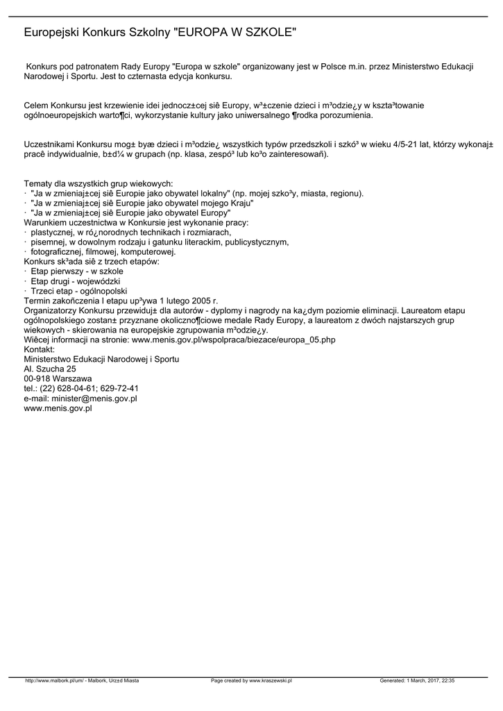 Europejski Konkurs Szkolny "EUROPA W SZKOLE" Konkurs pod patronatem Rady Europy "Europa w szkole" organizowany jest w Polsce m.in. przez Ministerstwo Edukacji Narodowej i Sportu. Jest to czternasta edycja konkursu. Celem Konkursu jest krzewienie idei jednocz±cej siê Europy, w³±czenie dzieci i m³odzie¿y w kszta³towanie ogólnoeuropejskich warto¶ci, wykorzystanie kultury jako uniwersalnego ¶rodka porozumienia. Uczestnikami Konkursu mog± byæ dzieci i m³odzie¿ wszystkich typów przedszkoli i szkó³ w wieku 4/5-21 lat, którzy wykonaj± pracê indywidualnie, b±d¼ w grupach (np. klasa, zespó³ lub ko³o zainteresowañ). Tematy dla wszystkich grup wiekowych: · "Ja w zmieniaj±cej siê Europie jako obywatel lokalny" (np. mojej szko³y, miasta, regionu). · "Ja w zmieniaj±cej siê Europie jako obywatel mojego Kraju" · "Ja w zmieniaj±cej siê Europie jako obywatel Europy" Warunkiem uczestnictwa w Konkursie jest wykonanie pracy: · plastycznej, w ró¿norodnych technikach i rozmiarach, · pisemnej, w dowolnym rodzaju i gatunku literackim, publicystycznym, · fotograficznej, filmowej, komputerowej. Konkurs sk³ada siê z trzech etapów: · Etap pierwszy - w szkole · Etap drugi - wojewódzki · Trzeci etap - ogólnopolski Termin zakoñczenia I etapu up³ywa 1 lutego 2005 r. Organizatorzy Konkursu przewiduj± dla autorów - dyplomy i nagrody na ka¿dym poziomie eliminacji. Laureatom etapu ogólnopolskiego zostan± przyznane okoliczno¶ciowe medale Rady Europy, a laureatom z dwóch najstarszych grup wiekowych - skierowania na europejskie zgrupowania m³odzie¿y. Wiêcej informacji na stronie: www.menis.gov.pl/wspolpraca/biezace/europa_05.php Kontakt: Ministerstwo Edukacji Narodowej i Sportu Al. Szucha 25 00-918 Warszawa tel.: (22) 628-04-61; 629-72-41 e-mail: [email protected] www.menis.gov.pl http://www.malbork.pl/um/ - Malbork, Urz±d Miasta Page created by www.kraszewski.pl Generated: 1 March, 2017, 22:35