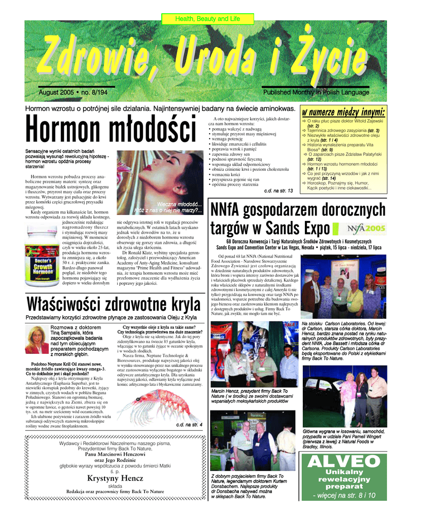 Health, Beauty and Life Zdrowie, Uroda i Życie Published Monthly in Polish Language August 2005 • no. 8/194 Hormon wzrostu o potrójnej sile działania. Najintensywniej badany na świecie aminokwas. Hormon młodości Sensacyjne wyniki ostatnich badań pozwalają wysunąć rewolucyjną hipotezę hormon wzrostu opóźnia procesy starzenia! Hormon wzrostu pobudza procesy anaboliczne przemiany materii: syntezę oraz magazynowanie białek ustrojowych, glikogenu i tłuszczów, przyrost masy ciała oraz procesy wzrostu. Wytwarzany jest pulsacyjnie do krwi przez komórki części gruczołowej przysadki mózgowej. Kiedy organizm ma kilkanaście lat, hormon wzrostu odpowiada za rozwój układu kostnego, jednocześnie redukując nagromadzony tłuszcz i stymulując rozwój masy mięśniowej. W momencie osiągnięcia dojrzałości, czyli w wieku około 25-lat, produkcja hormonu wzrostu zmniejsza się, a około 50 r. ż. praktycznie zanika. Bardzo długo panował pogląd, że niedobór tego hormonu pojawiający się dopiero w wieku dorosłym c.d. na str. 13 Wieczna młodość... Któż z nas o niej nie marzy?... nie odgrywa istotnej roli w regulacji procesów metabolicznych. W ostatnich latach uzyskano jednak wiele dowodów na to, że u dorosłych z niedoborem hormonu wzrostu obserwuje się gorszy stan zdrowia, a długość ich życia ulega skróceniu. Dr Ronald Klatz, wybitny specjalista gerontolog, założyciel i przewodniczący American Academy of Anty-Aging Medicine, konsultant magazynu "Prime Health and Fitness" udowadnia, że terapia hormonem wzrostu może mieć przełomowe znaczenie dla wydłużenia życia i poprawy jego jakości. Właściwości zdrowotne kryla Przedstawiamy korzyści zdrowotne płynące ze zastosowania Oleju z Kryla Rozmowa z doktorem Tiną Sampalis, która zapoczątkowała badania nad tym obiecującym preparatem pochodzącym z morskich głębin. Podobno Neptune Krill Oil stanowi nowe, morskie źródło zawierające kwasy omega-3. Co to dokładnie jest i skąd pochodzi? Najlepszy olej z kryla otrzymujemy z Kryla Antarktycznego (Euphasia Superba), jest to niewielki skorupiak podobny do krewetki, żyjący w zimnych, czystych wodach w pobliżu Bieguna Południowego. Stanowi on ogromną biomasę, jedną z największych na Ziemi, zbiera się on w ogromne ławice, o gęstości nawet powyżej 10 tys. szt. na metr sześcienny wód oceanicznych. Ich ulubione pożywienie i zarazem źródło wielu substancji odżywczych stanowią mikroskopijne rośliny wodne zwane fitoplanktonem. A oto najważniejsze korzyści, jakich dostarcza nam hormon wzrostu: • pomaga walczyć z nadwagą • stymuluje przyrost masy mięśniowej • wzmaga potencję • likwiduje zmarszczki i cellulitis • poprawia wzrok i pamięć • zapewnia zdrowy sen • podnosi sprawność fizyczną • wspomaga układ odpornościowy • obniża ciśnienie krwi i poziom cholesterolu • wzmacnia kości • przyspiesza gojenie się ran • opóźnia procesy starzenia 68 Doroczna Konwencja i Targi Naturalnych Środków Zdrowotnych i Kosmetycznych Sands Expo and Convention Center w Las Vegas, Nevada • piątek, 15 lipca - niedziela, 17 lipca Od ponad 68 lat NNfA (National Nutritional Food Association - Narodowe Stowarzyszenie Zdrowego Żywienia) jest czołową organizacją w dziedzinie naturalnych produktów zdrowotnych, która broni i wspiera interesy zarówno dostawców jak i właścicieli placówek sprzedaży detalicznej. Każdego roku właściciele sklepów z naturalnymi środkami zdrowotnymi i kosmetycznymi z całej Ameryki (i nie tylko) przyjeżdżają na konwencję oraz targi NNfA po wiadomości, wsparcie potrzebne dla budowania swojego biznesu oraz zaoferowania klientom najlepszych z dostępnych produktów i usług. Firmy Back To Nature, jak zwykle, nie mogło tam nie być. Na stoisku Carlson Laboratories. Od lewej: dr Carlson, starsza córka doktora, Marcin Hencz, bardzo znana postać na rynku naturalnych produktów zdrowotnych, były prezy dent NNfA, Joe Bassett i młodsza córka dr Carlsona. Produkty Carlson Laboratories będą eksportowane do Polski z etykietkami firmy Back To Nature. Marcin Hencz, prezydent firmy Back To Nature ( w środku) ze swoimi dostawcami wspaniałych meksykańskich produktów c.d. na str. 4 Główna wygrana w losowaniu, samochód, przypadła w udziale Pani Pameli Wingert (pierwsza z lewej) z Natural Foods w Bradley, Illinois. Wydawcy i Redaktorowi Naczelnemu naszego pisma, Prezydentowi firmy Back To Nature, Panu Marcinowi Henczowi oraz Jego Rodzinie ALVEO głębokie wyrazy współczucia z powodu śmierci Matki ś. p. składa Redakcja oraz pracownicy firmy Back To Nature D O raku płuc pisze doktor Witold Zajewski (str. 2) D Tajemnica zdrowego zasypiania (str. 3) D Niezwykłe właściwości zdrowotne oleju z kryla (str. 1 i 4) D Historia wynalezienia preparatu Vita Biosa® (str. 9) D O zaparciach pisze Zdzisław Palatyński (str. 12) D Hormon wzrostu hormonem młodości (str. 1 i 13) D Co jest przyczyną wrzodów i jak z nimi wygrać (str. 14) D Horoskop, Poznajmy się, Humor, Kącik poetycki i inne ciekawostki... NNfA gospodarzem dorocznych targów w Sands Expo Czy wszystkie oleje z kryla sa takie same? Czy technologia przetwórstwa ma duże znaczenie? Oleje z kryla nie są identyczne. Jak do tej pory zidentyfikowano na świecie 85 gatunków kryla, włączając w to gatunki żyjące w oceanie spokojnym i w wodach słodkich. Nasza firma, Neptune Technologie & Bioresources, produkuje najwyższej jakości olej w wyniku stosowanego przez nas unikalnego procesu oraz zastosowania wyłącznie bogatego w składniki odżywcze antarktycznego kryla. Dla uzyskania najwyższej jakości, odławiamy kryla wyłącznie pod koniec arktycznego lata i błyskawicznie zamrażamy. Krystyny Hencz w numerze między innymi: Z dobrym przyjacielem firmy Back To Nature, legendarnym doktorem Kurtem Donsbachem. Najlepsze produkty dr Donsbacha nabywać można w sklepach Back To Nature. Unikalny rewelacyjny preparat - w